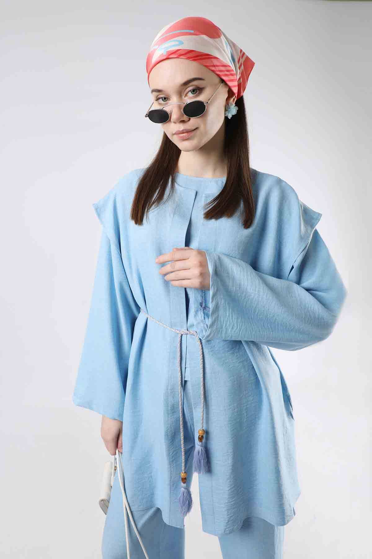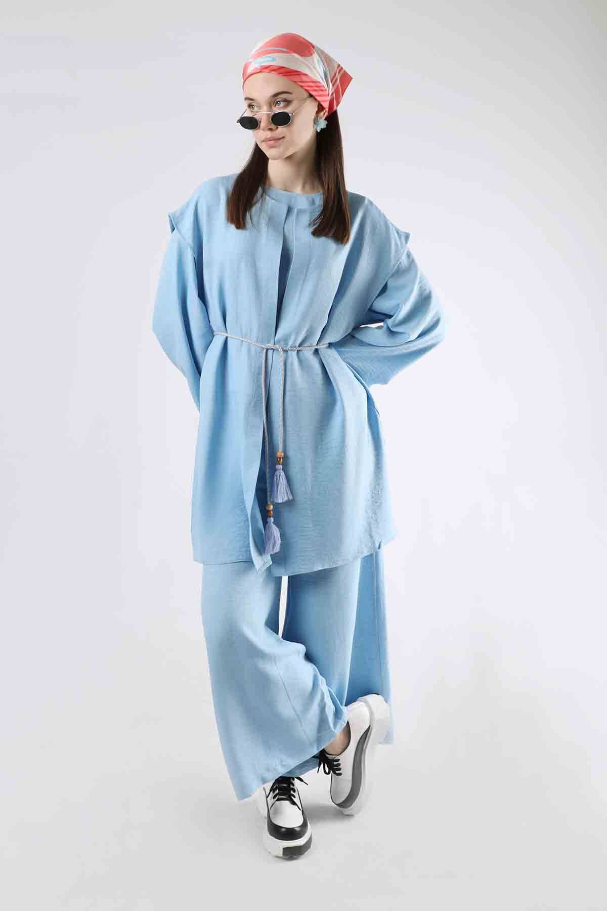 Kordonlu Bol Paça Yelek Takım Mavi. Püskül detaylı kordonludur. yeleklidir. Pantolon beli lastiklidir ve bol paçadır. Normal kalıptır. Üçlü takım olarak satılmaktadır. Sezonun trend renkleri kullanılarak tasarlanan ürünümüz yeni sezonun favori ürünlerindendir.