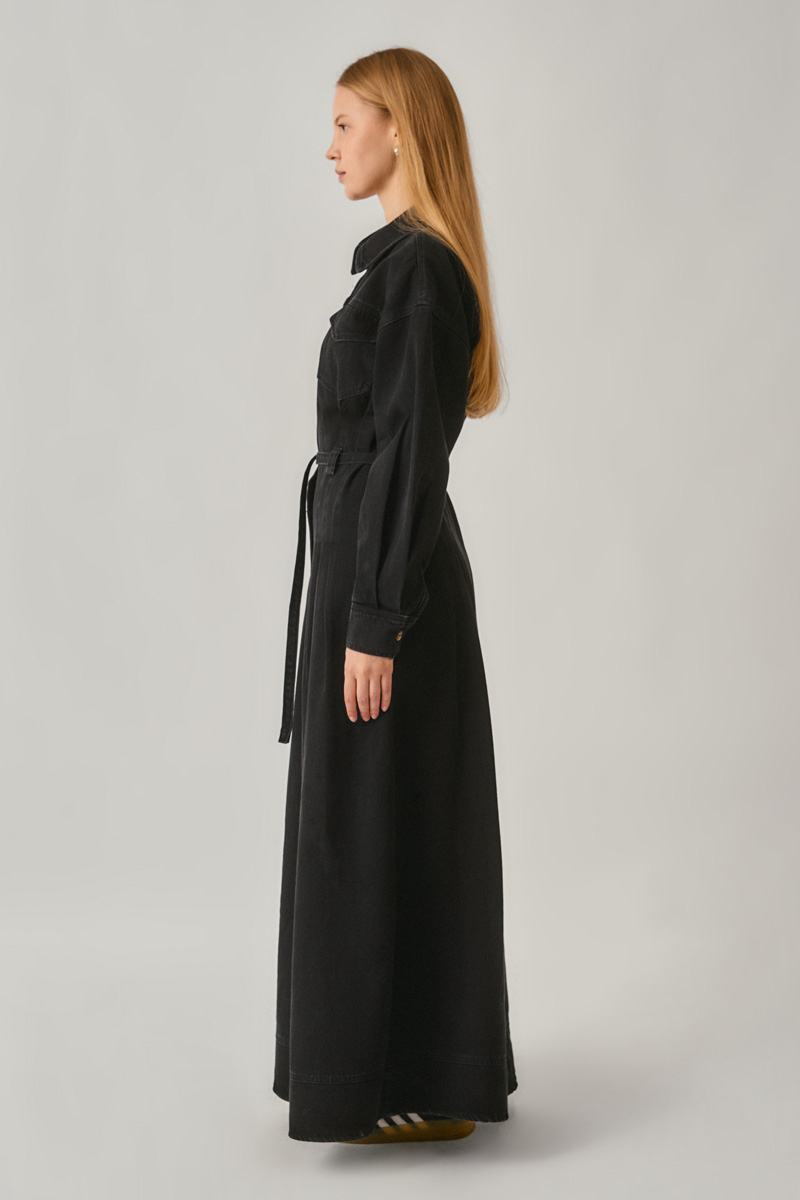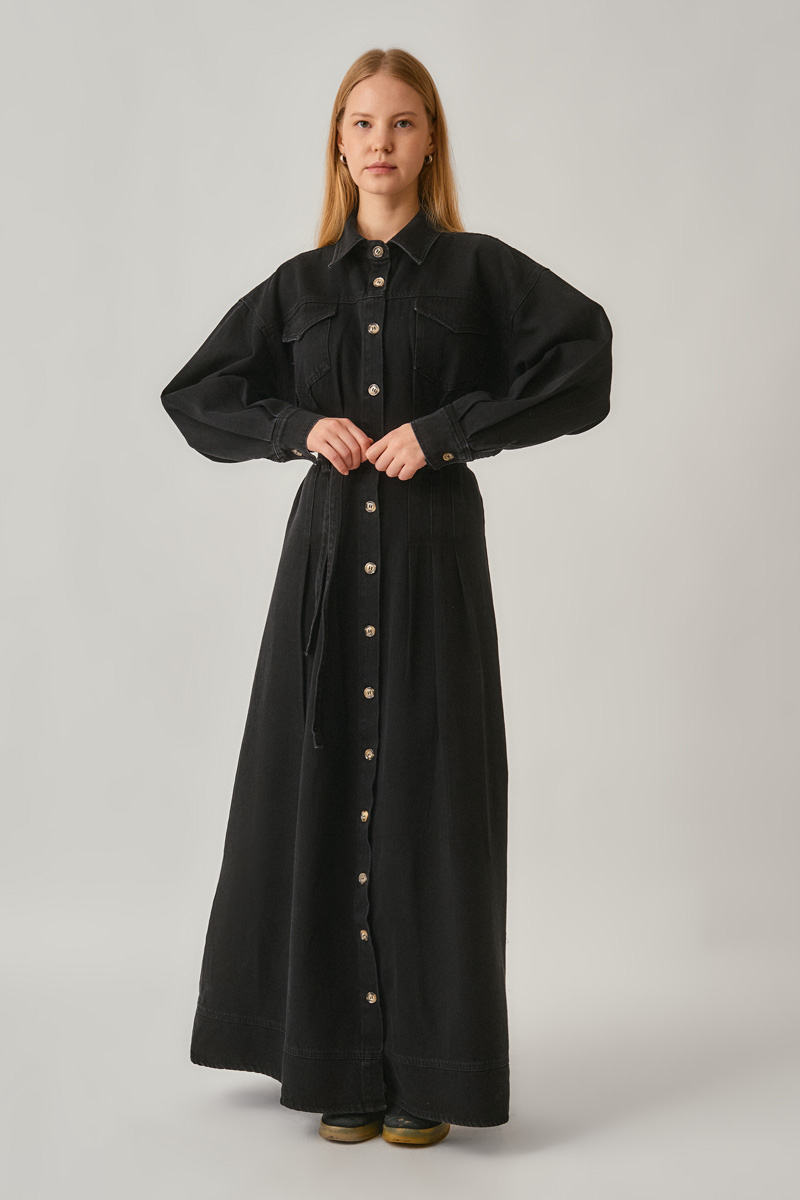Korse Bel Denim Elbise Siyah