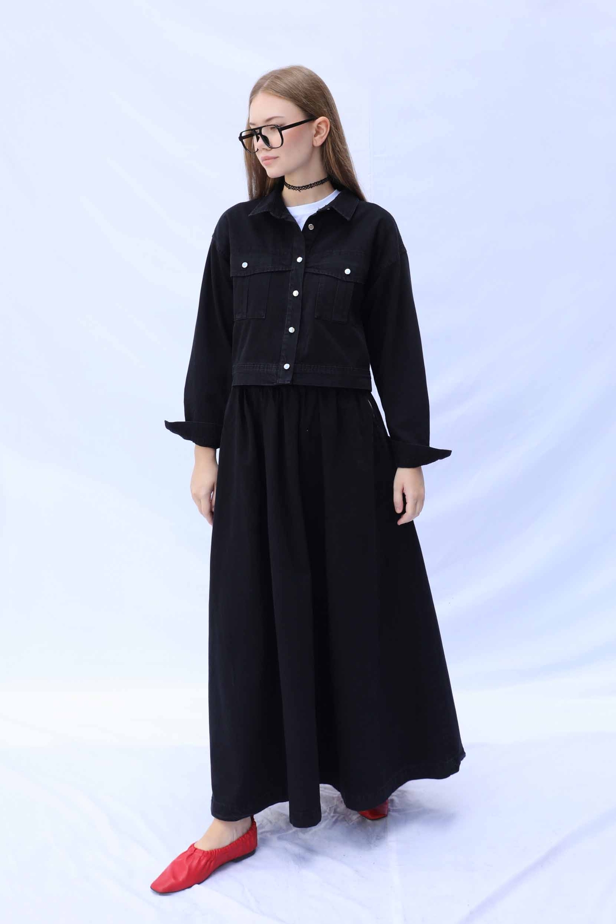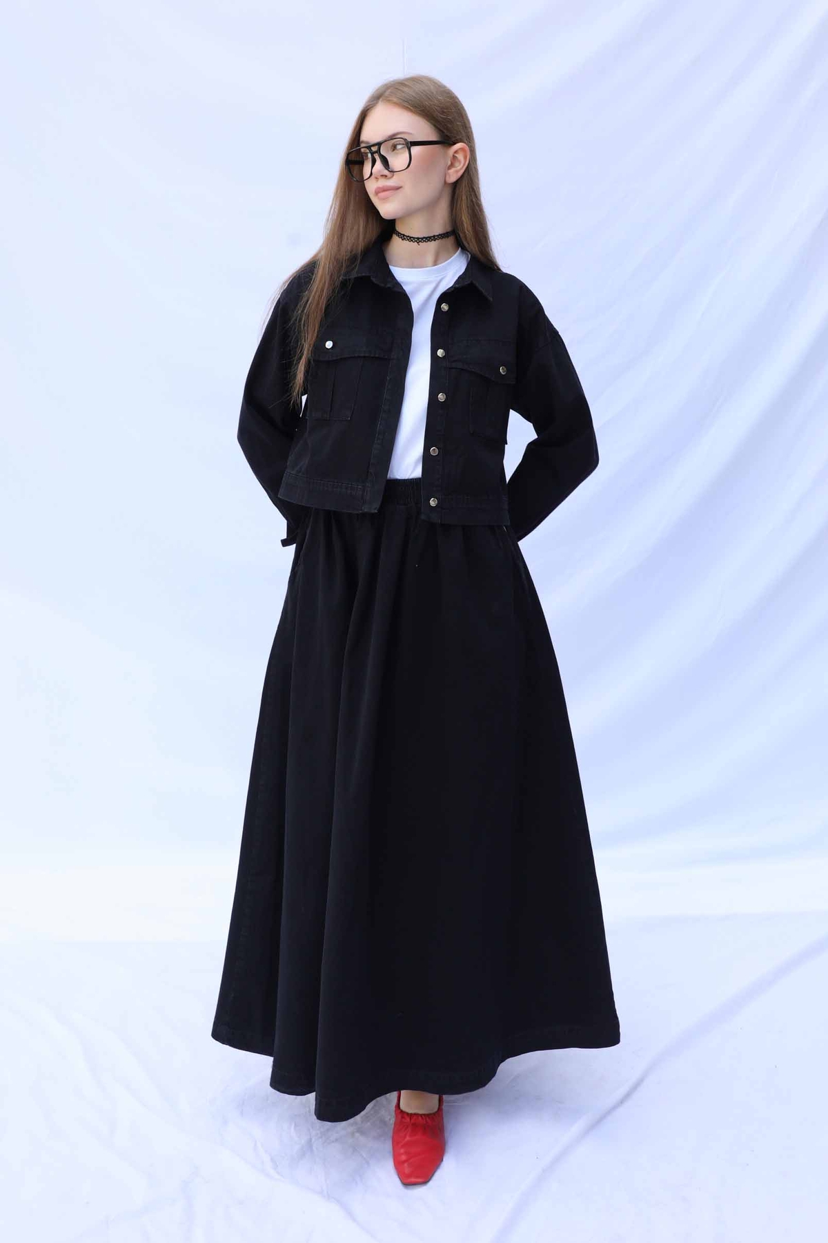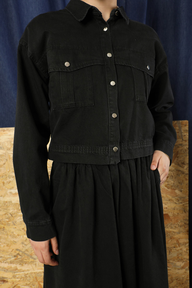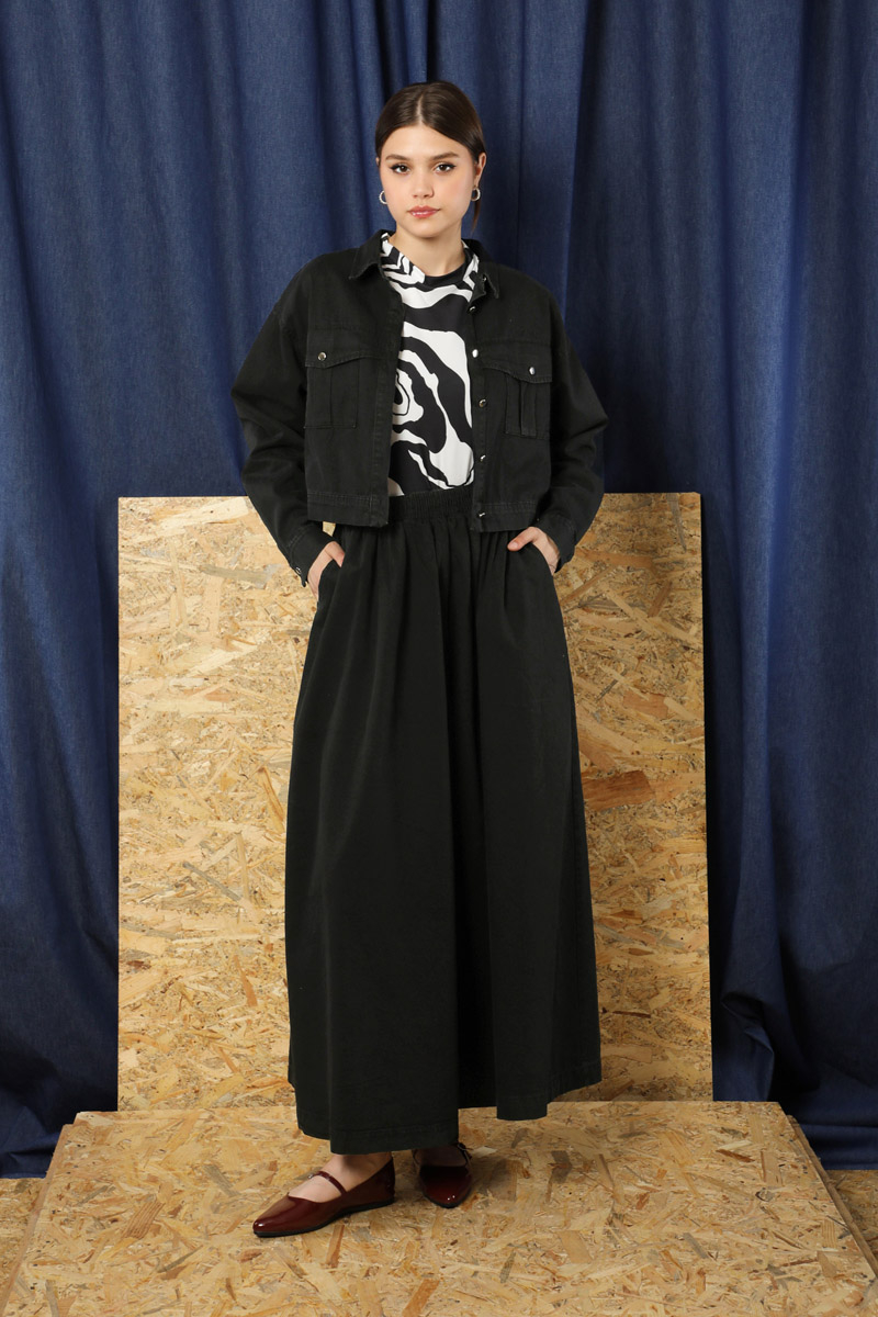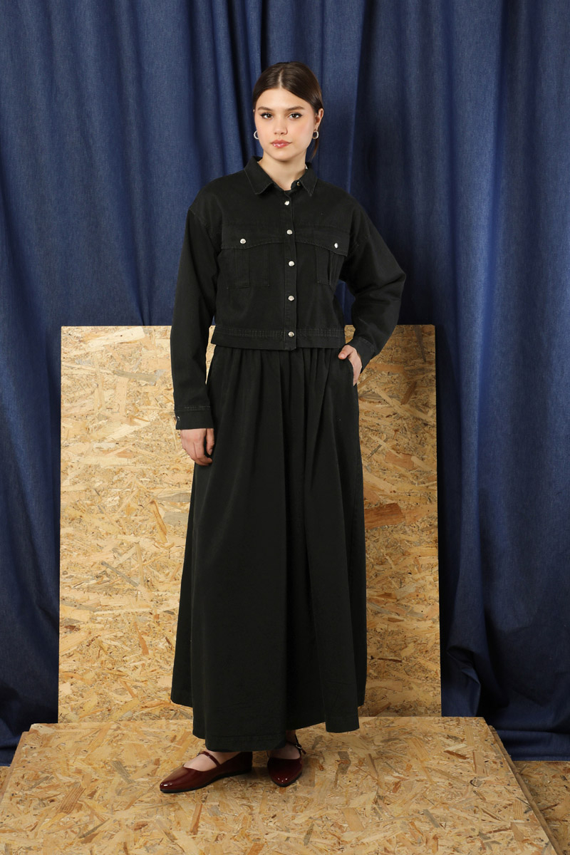 Kot Ceket Etek Takım Siyah. Etek beli lastiklidir, yanadan ceplidir. Ceket düşük omuzludur önden iki cebi bulunmaktadır, metal düğmelidir.