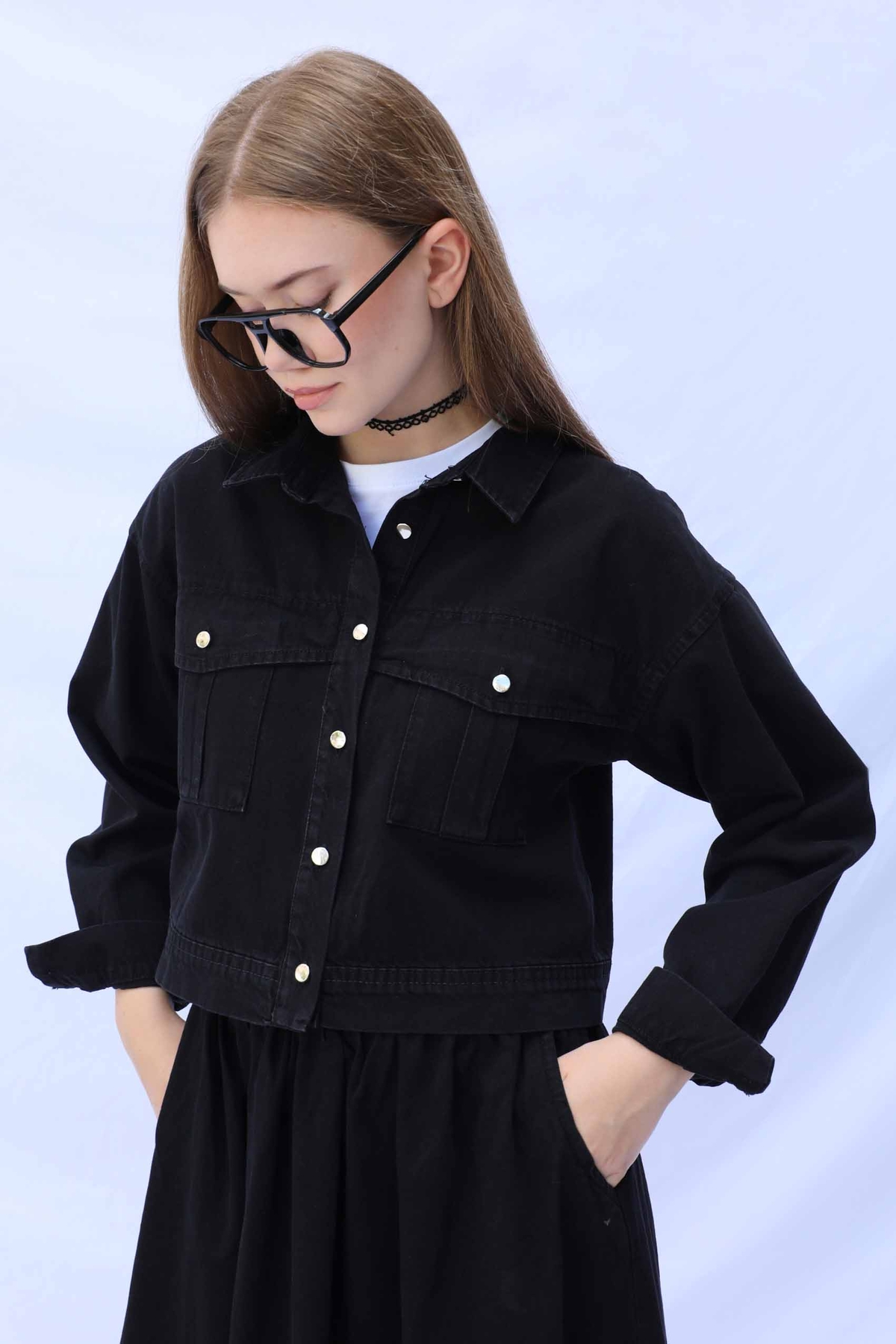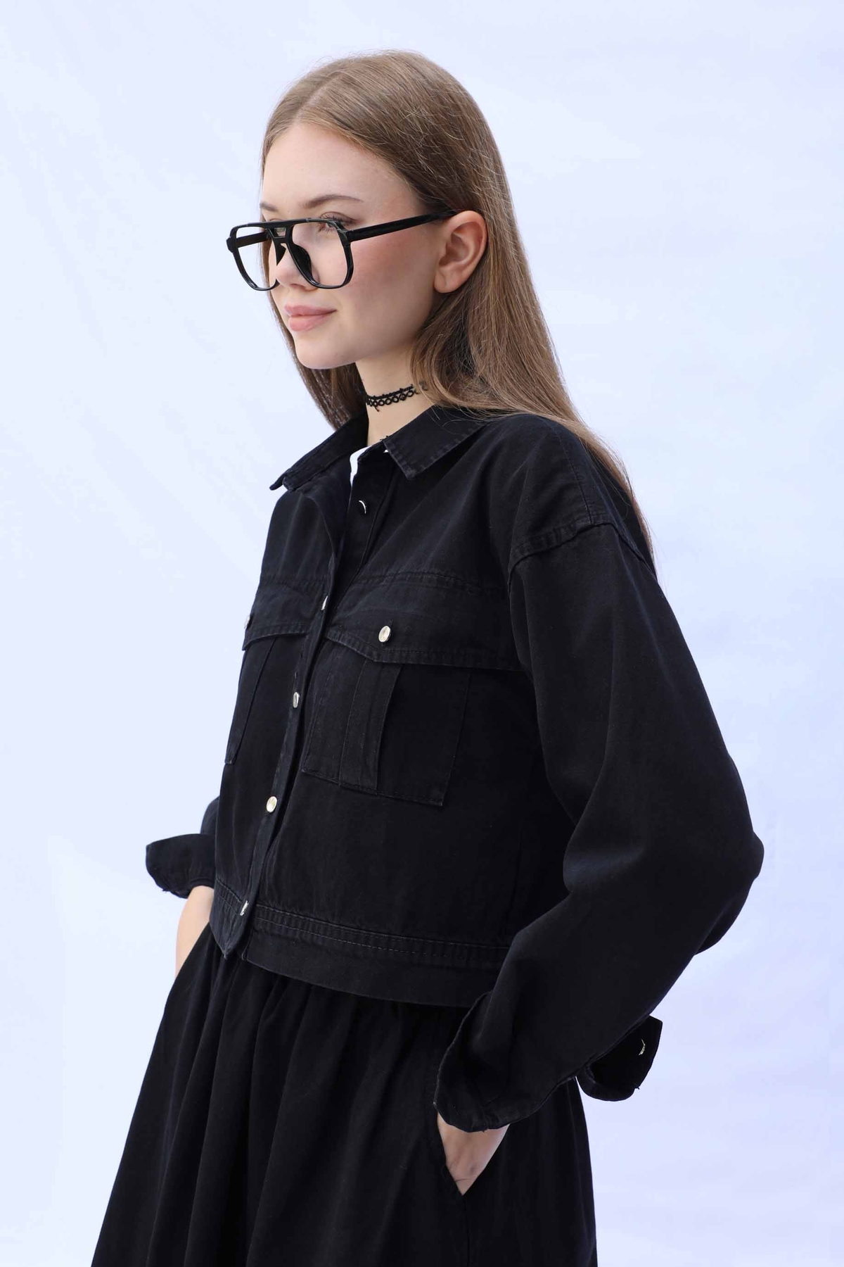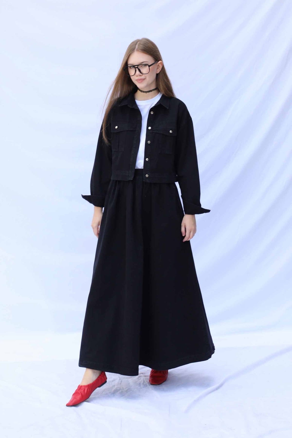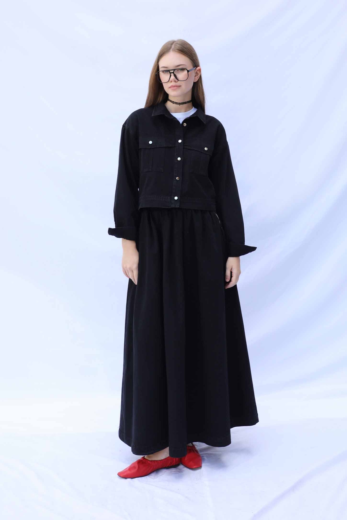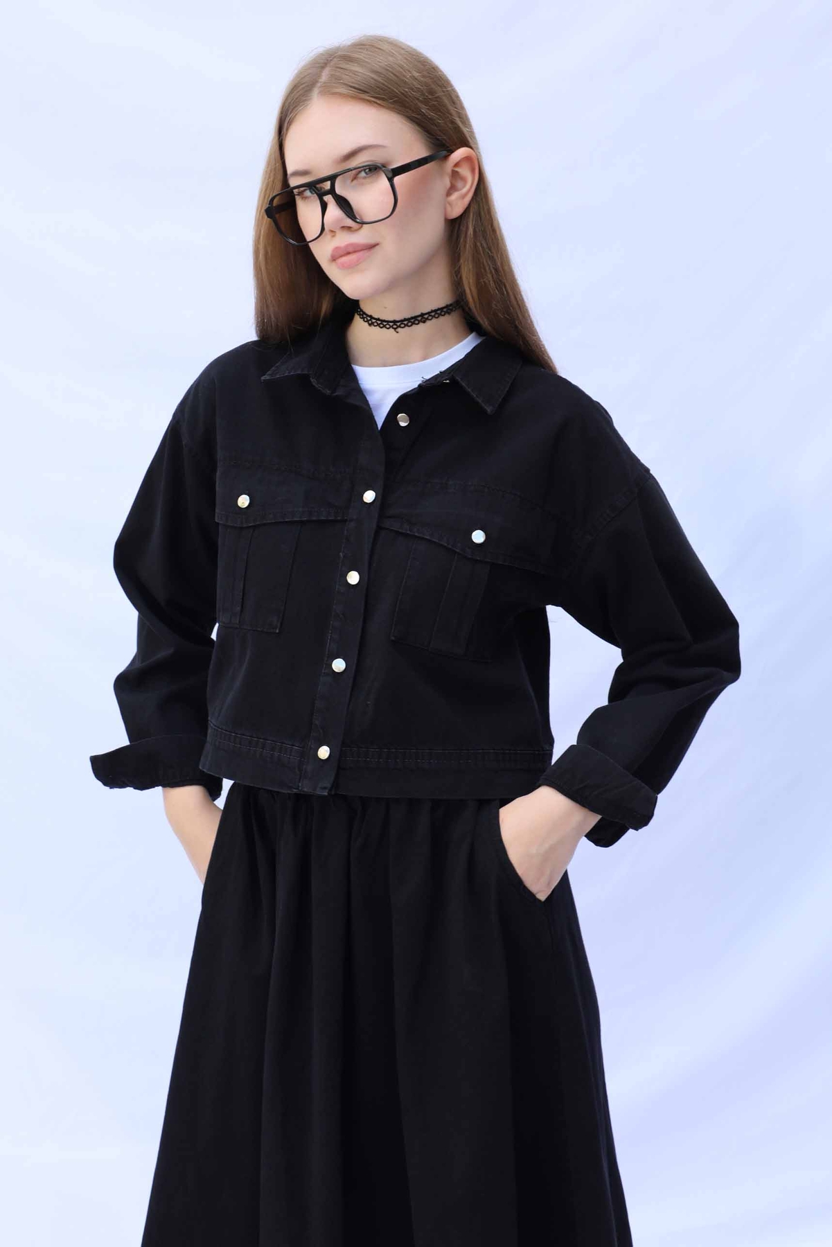 Kot Ceket Etek Takım Siyah. Etek beli lastiklidir, yanadan ceplidir. Ceket düşük omuzludur önden iki cebi bulunmaktadır, metal düğmelidir.