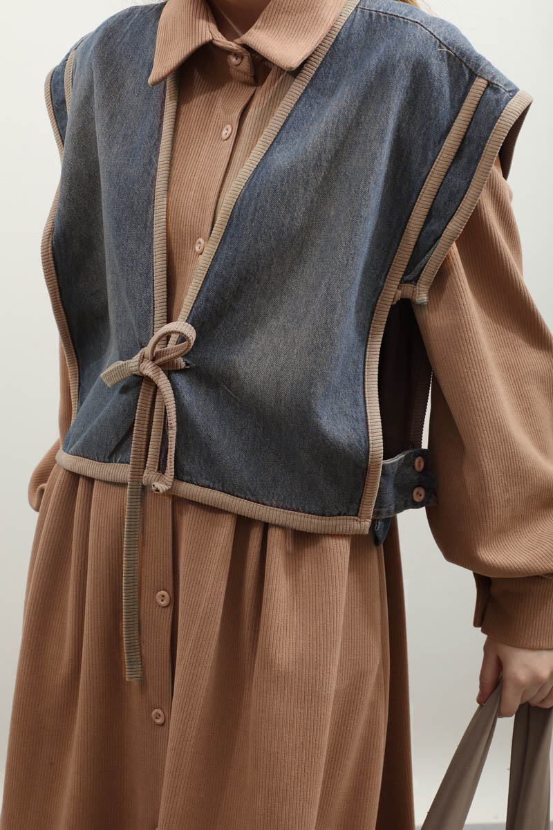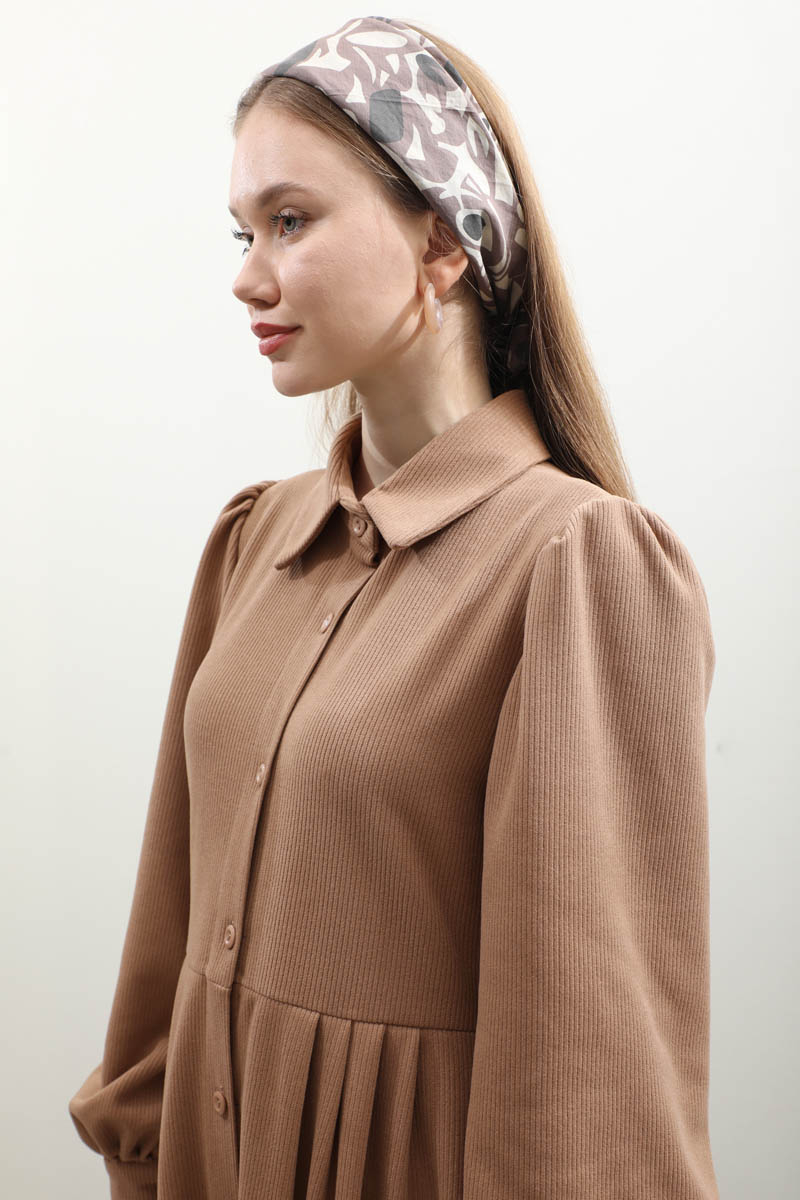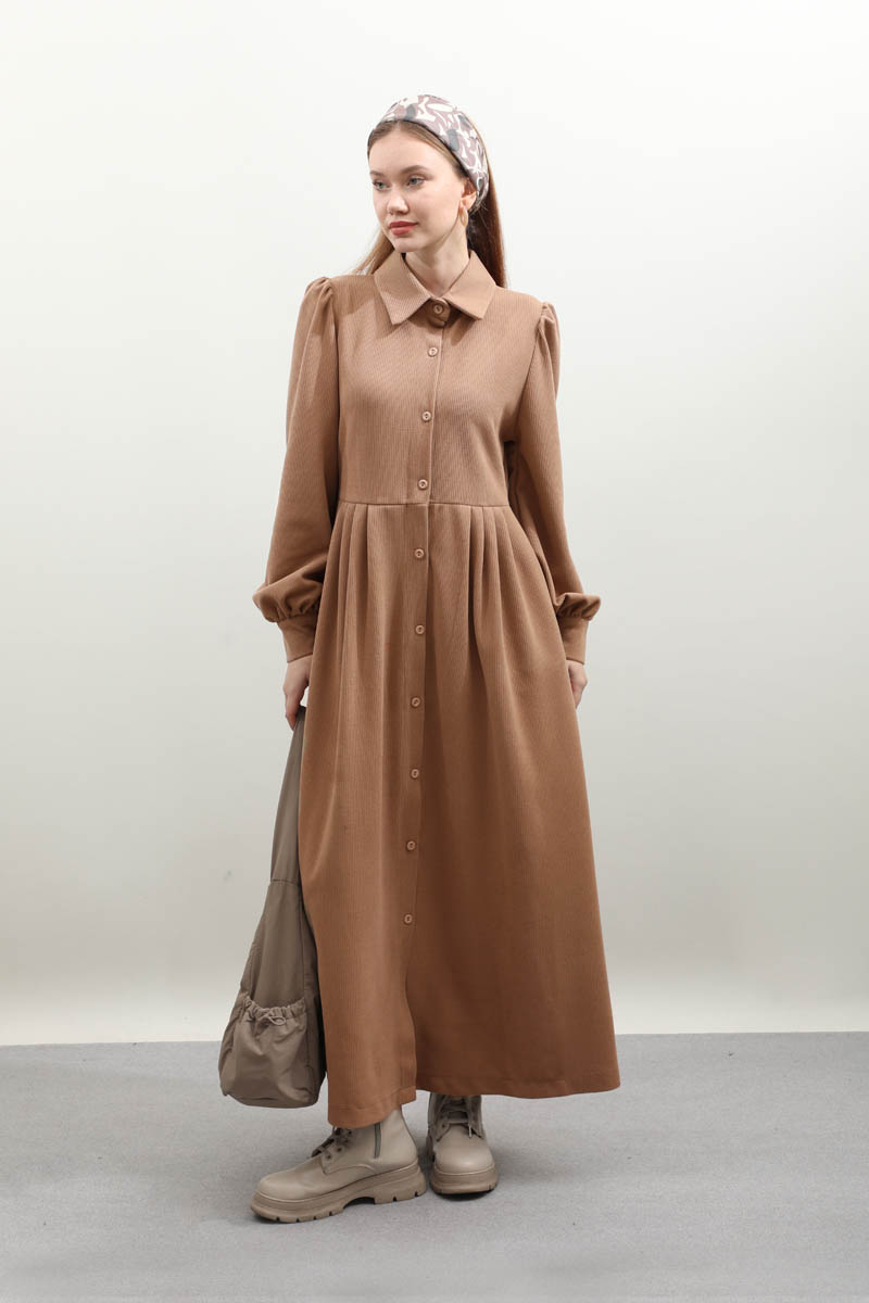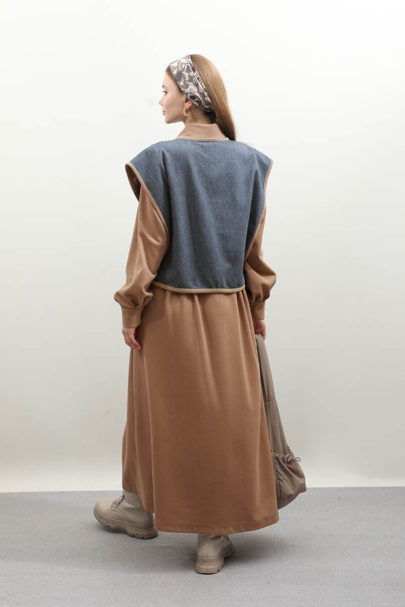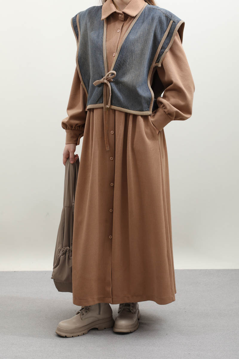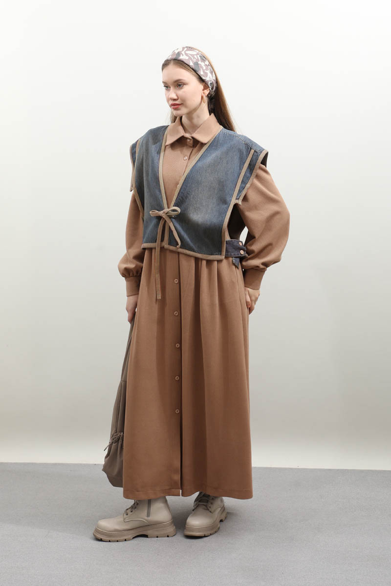 Kot Yelekli Triko Elbise Açık Taba. Gömlek yakadır, önden ceplidir, belden pile detaylıdır, yandan ceplidir. astarsızdır. Yelek kenarları elbise kumaşından biye detaylıdır, v yakadır, önden bağlamalıdır, yanlarıdan düğme detaylıdır. Günlük kullanım ve özel günlerinizde tercih edebilirsiniz.