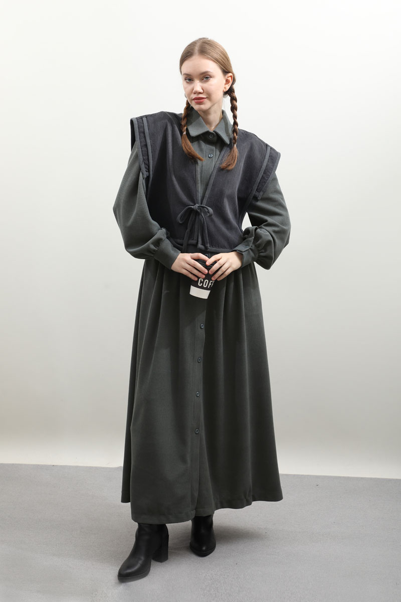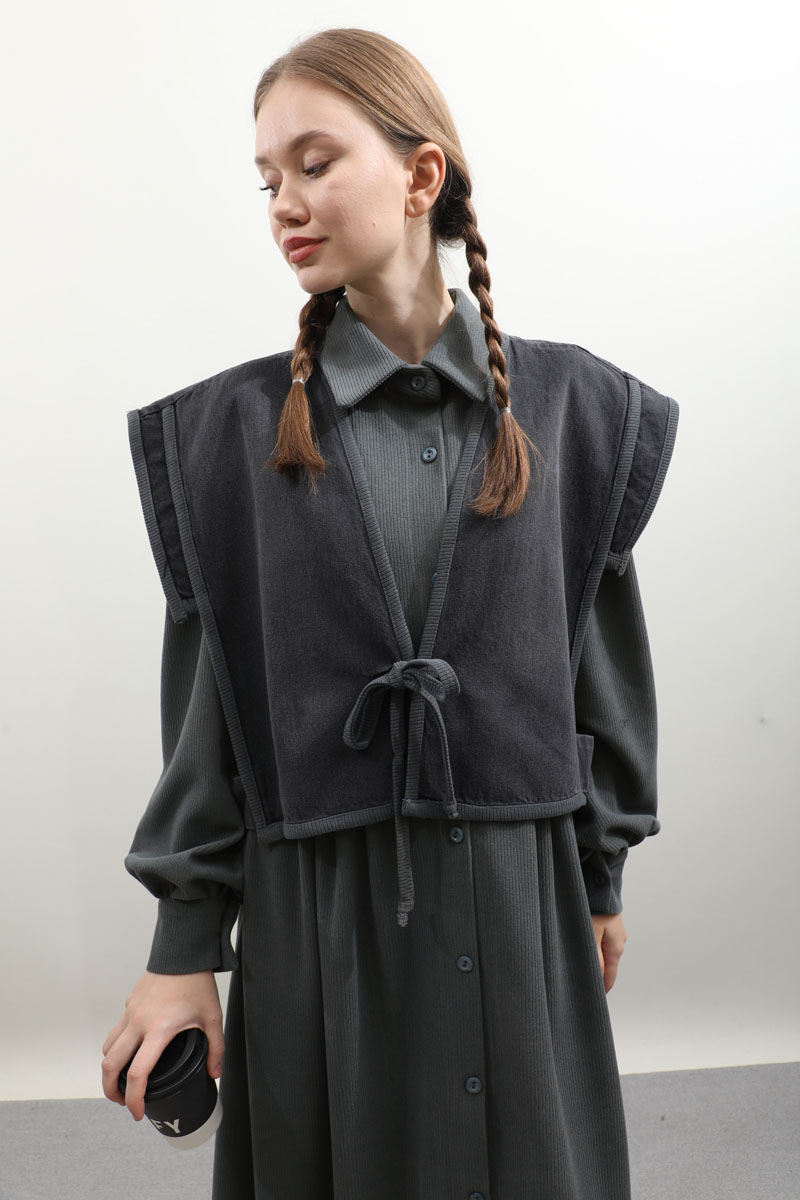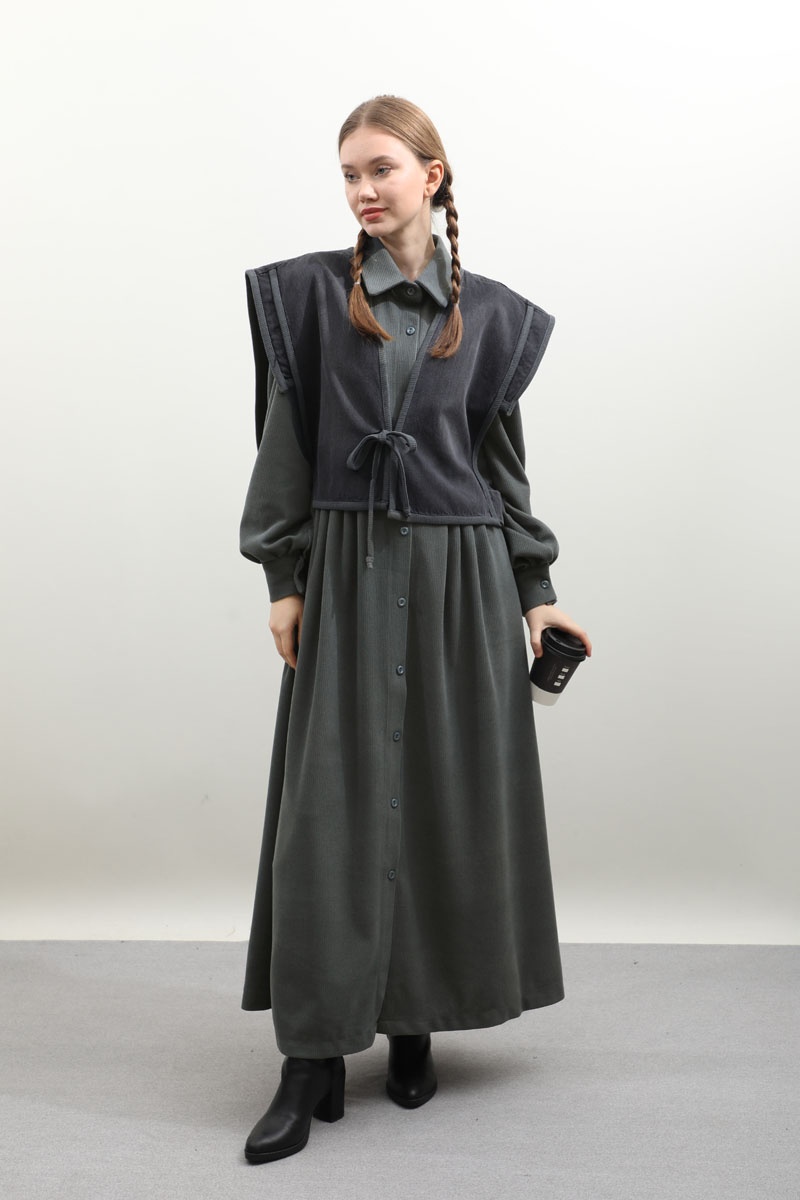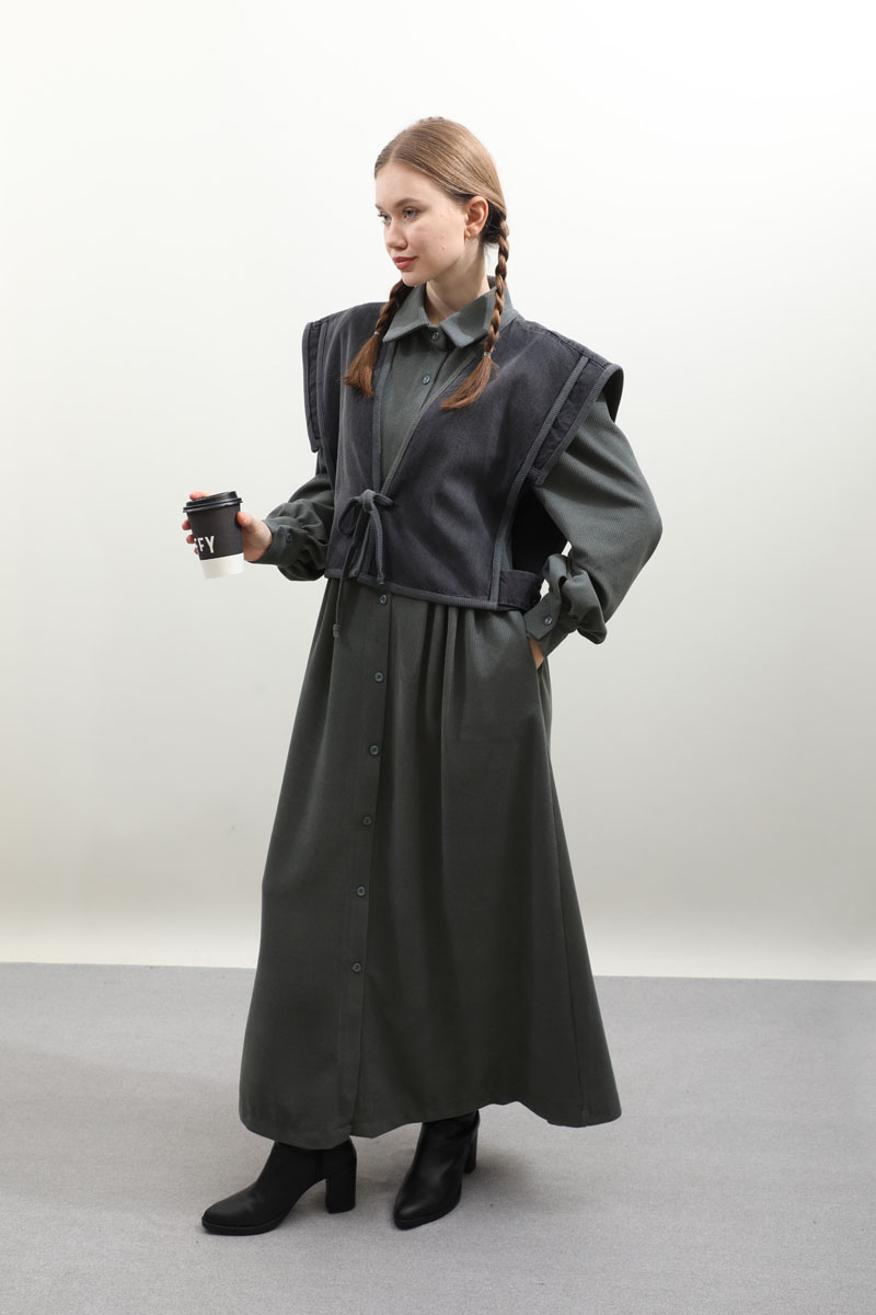 Kot Yelekli Triko Elbise Antrasit. Gömlek yakadır, önden ceplidir, belden pile detaylıdır, yandan ceplidir. astarsızdır. Yelek kenarları elbise kumaşından biye detaylıdır, v yakadır, önden bağlamalıdır, yanlarıdan düğme detaylıdır. Günlük kullanım ve özel günlerinizde tercih edebilirsiniz.
