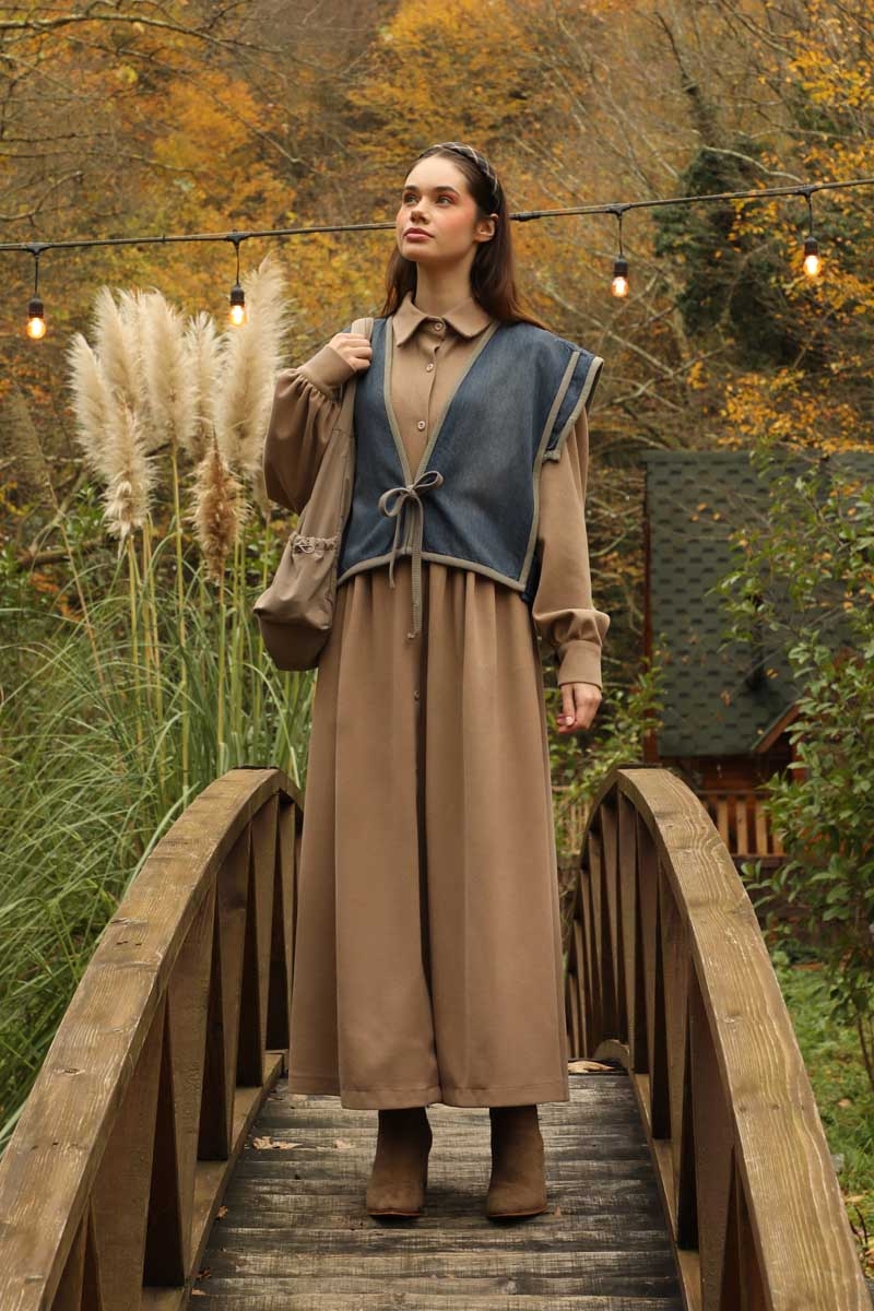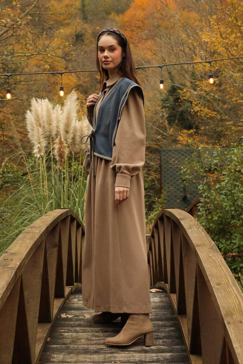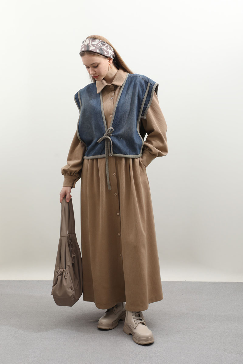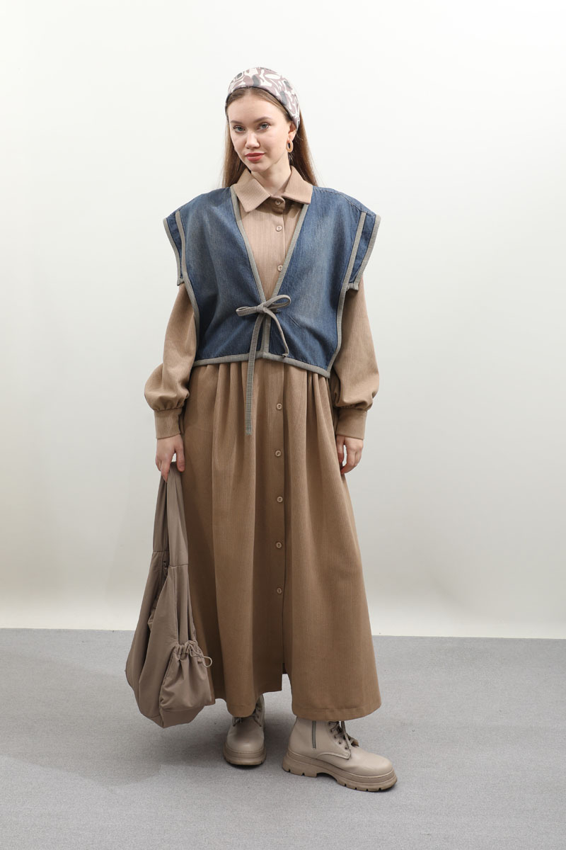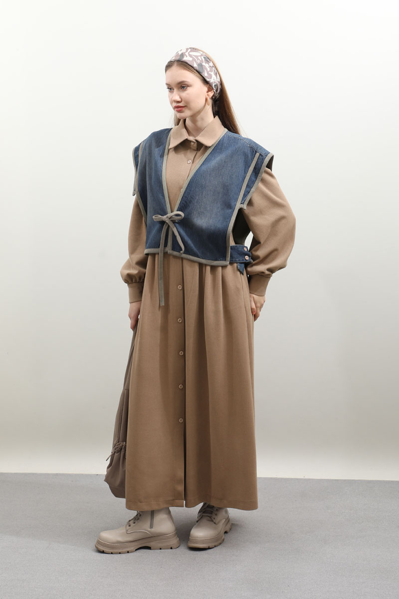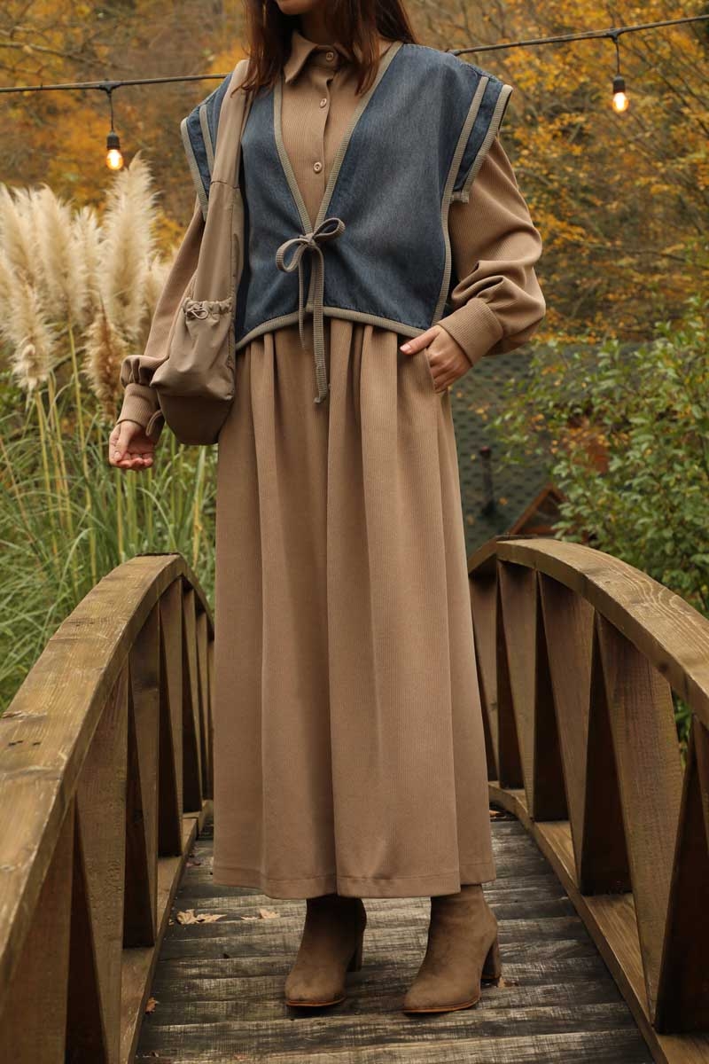 Kot Yelekli Triko Elbise Vizon. Gömlek yakadır, önden ceplidir, belden pile detaylıdır, yandan ceplidir. astarsızdır. Yelek kenarları elbise kumaşından biye detaylıdır, v yakadır, önden bağlamalıdır, yanlarıdan düğme detaylıdır. Günlük kullanım ve özel günlerinizde tercih edebilirsiniz.