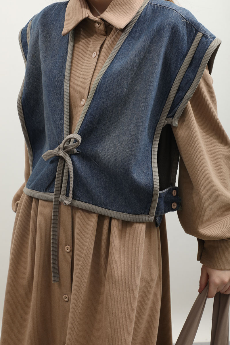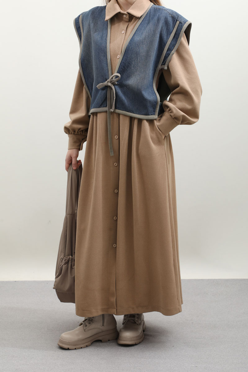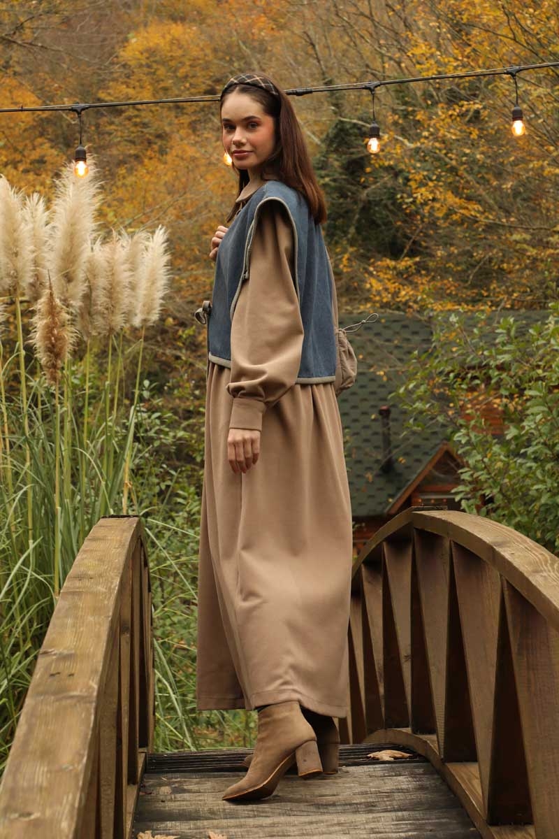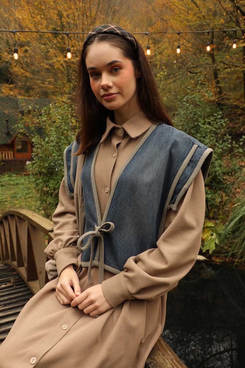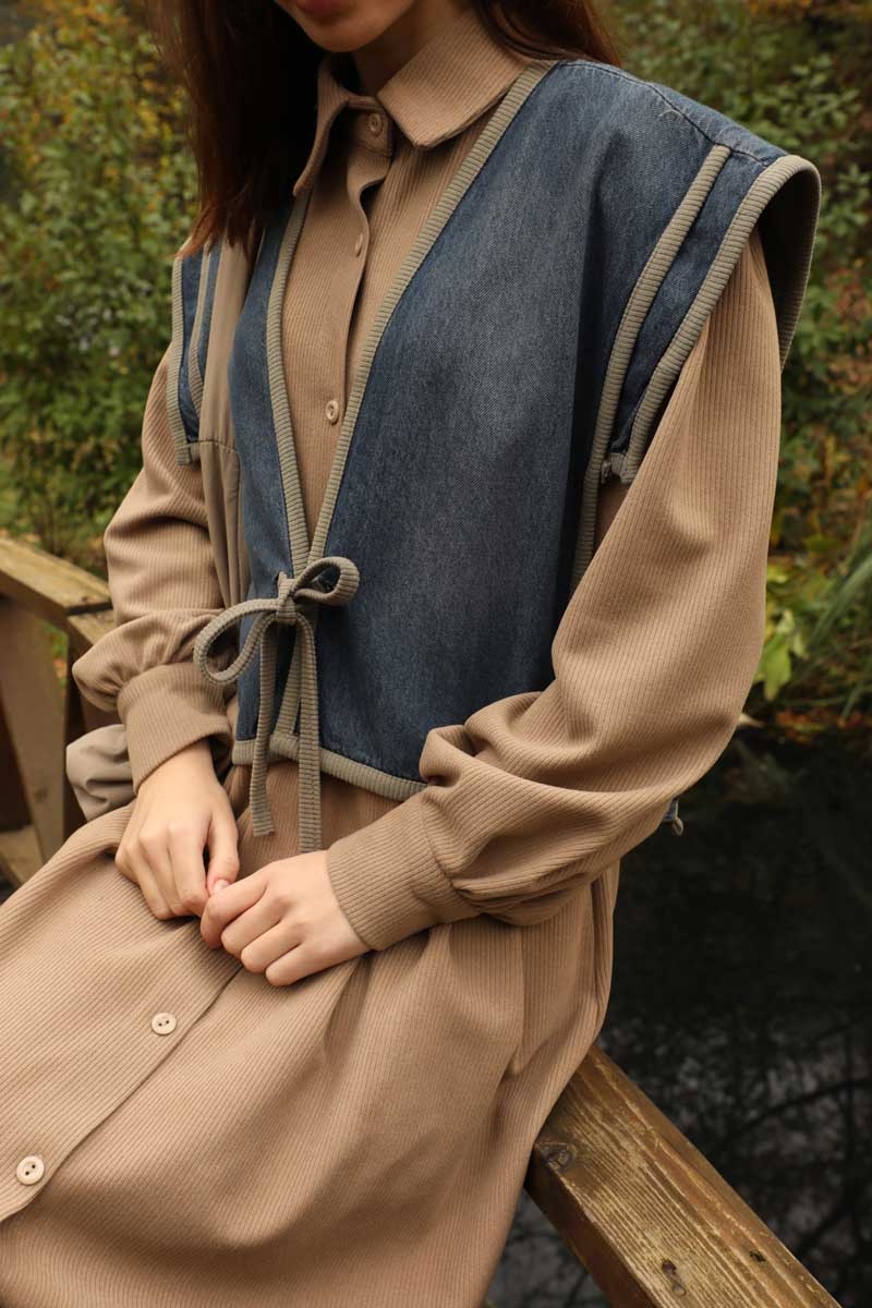 Kot Yelekli Triko Elbise Vizon. Gömlek yakadır, önden ceplidir, belden pile detaylıdır, yandan ceplidir. astarsızdır. Yelek kenarları elbise kumaşından biye detaylıdır, v yakadır, önden bağlamalıdır, yanlarıdan düğme detaylıdır. Günlük kullanım ve özel günlerinizde tercih edebilirsiniz.