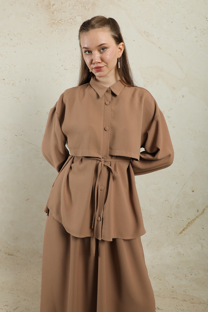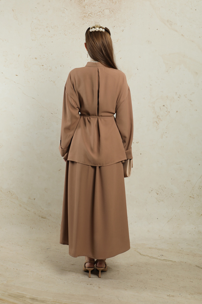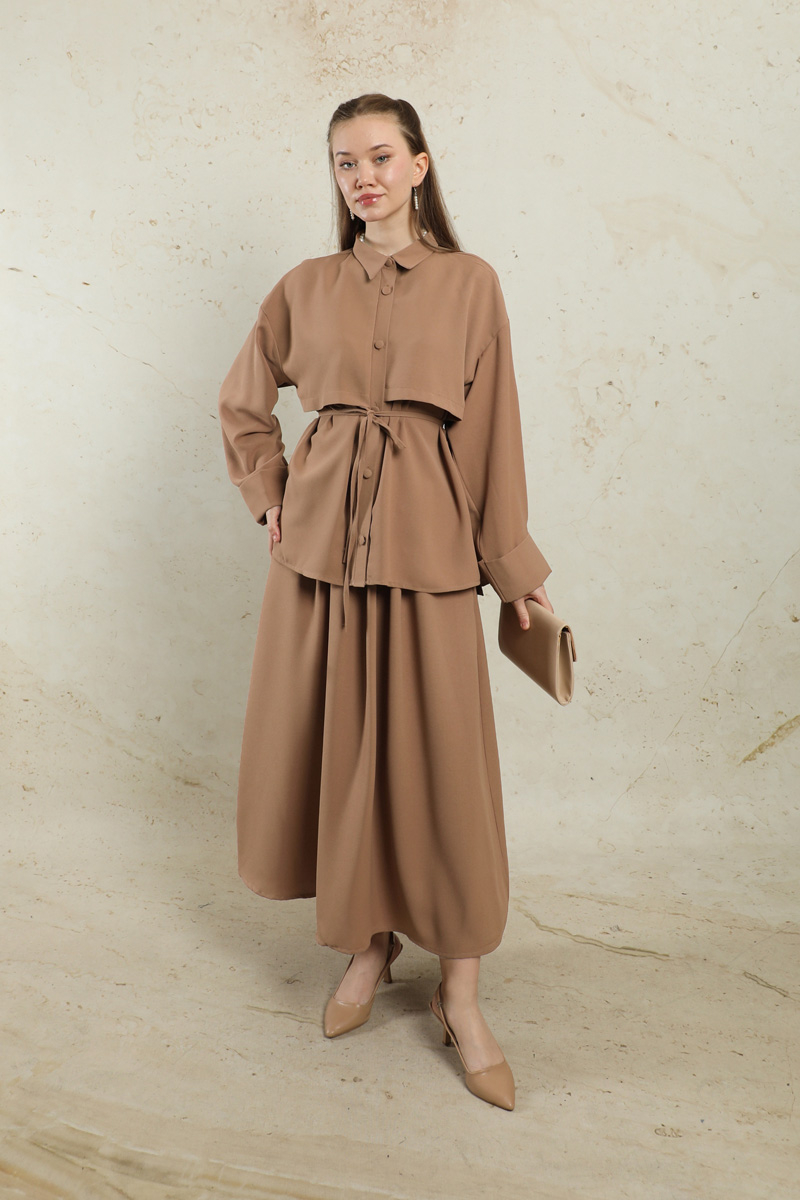 Krep Etek Takım Açık Taba. Düşük kolludur. Arkadan A pile detaylıdır. Önden düğmelidir. Yandan ceplidir. Duble kol detaylıdır. Etek beli lastiklidir. Beli İnce kuşaklıdır. Günlük kullanım ve özel günlerinizde tercih edebilirsiniz.
