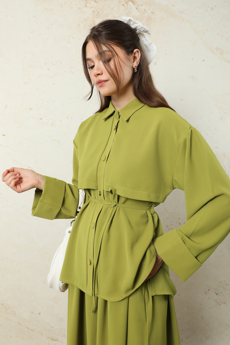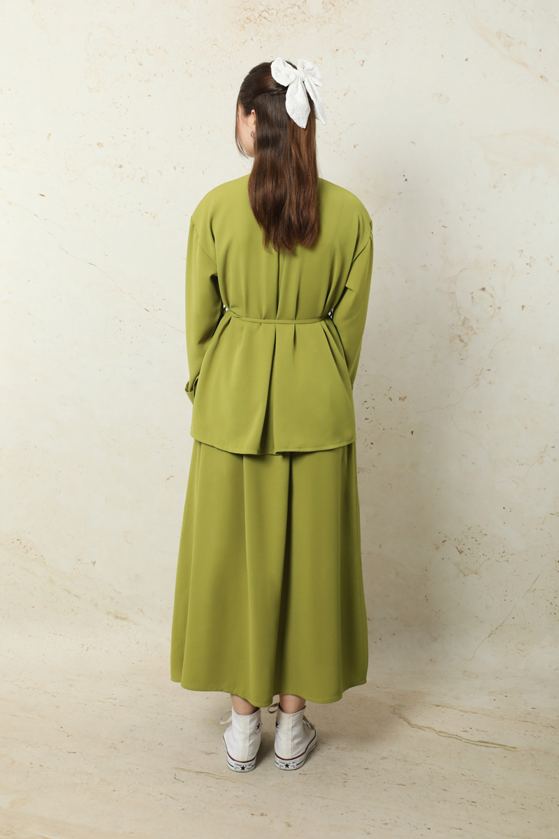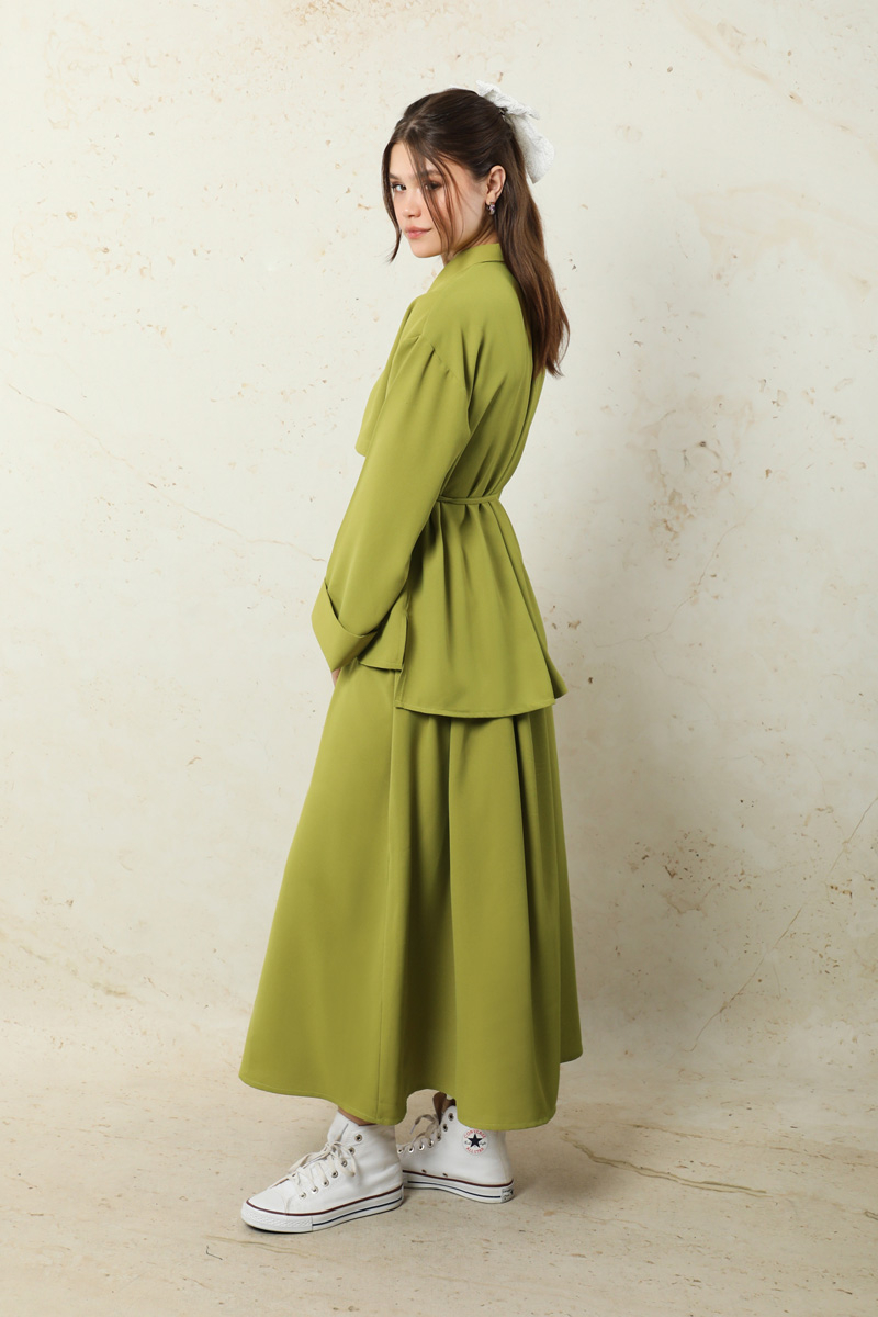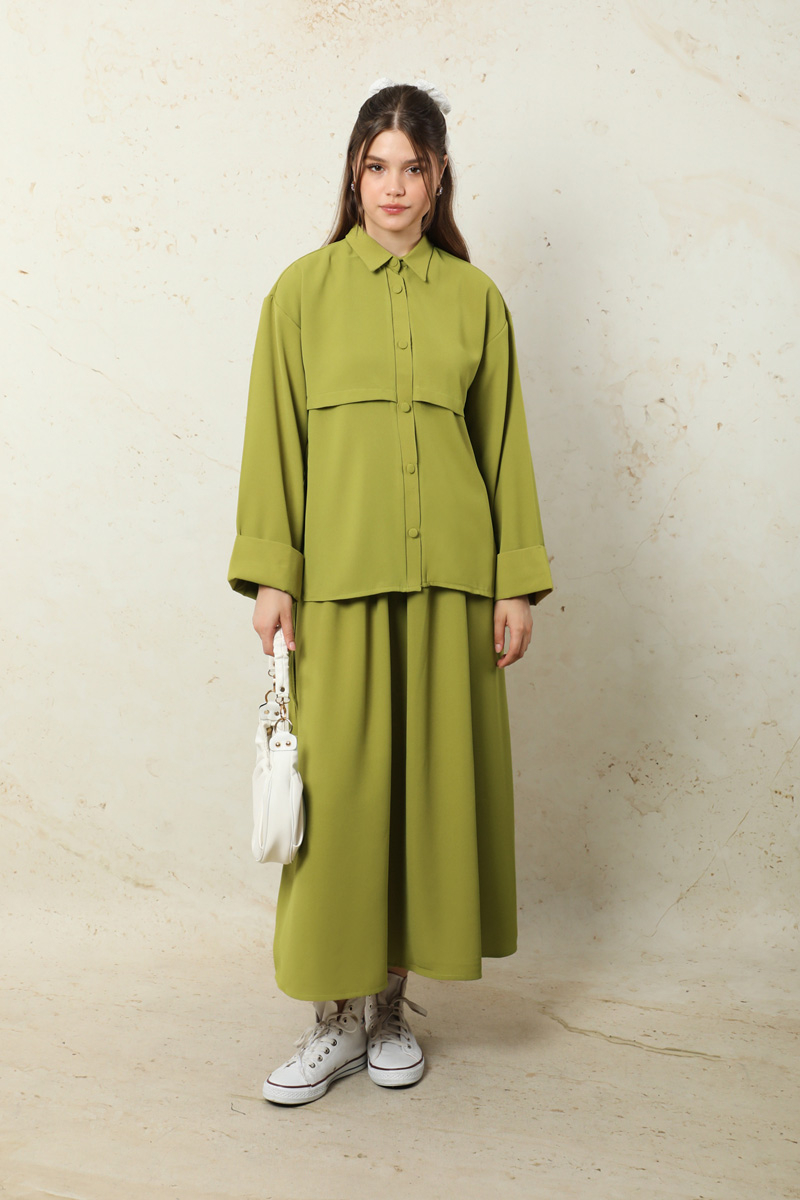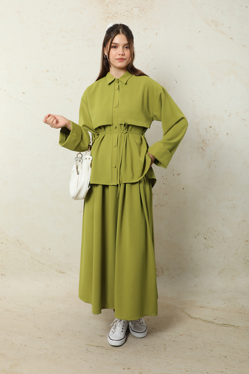 Krep Etek Takım Yağ Yeşili. Düşük kolludur. Arkadan A pile detaylıdır. Önden düğmelidir. Yandan ceplidir. Duble kol detaylıdır. Etek beli lastiklidir. Beli İnce kuşaklıdır. Günlük kullanım ve özel günlerinizde tercih edebilirsiniz.