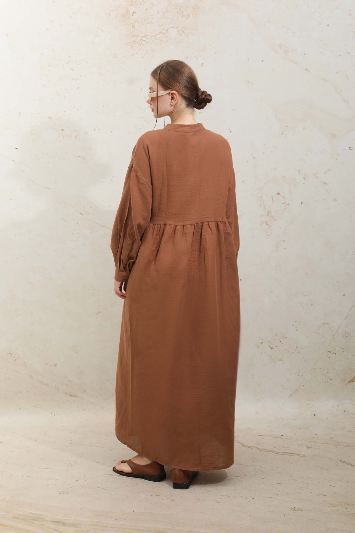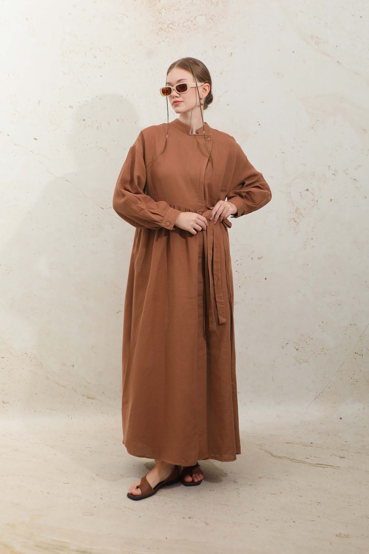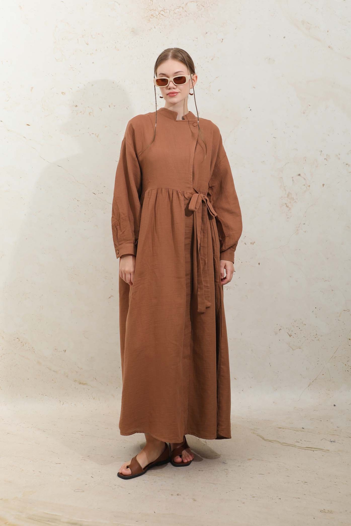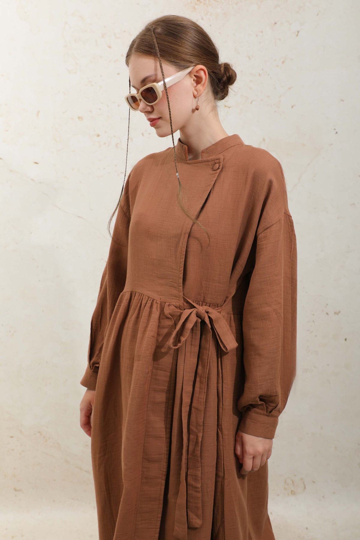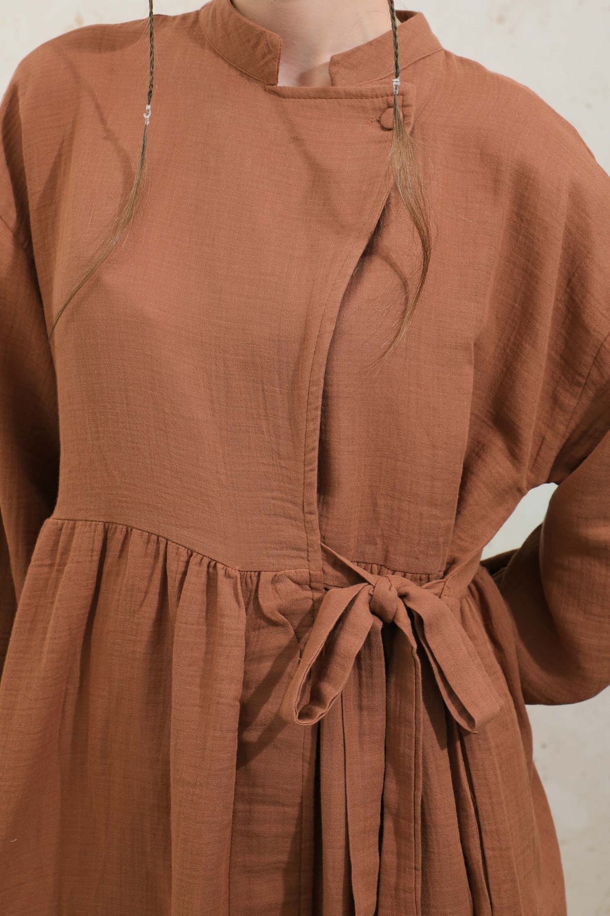 Kruvaze Bağlamalı Müslin Elbise Kiremit. Belden aşağısı gizli düğmeli, Üst kısmın kapaması yandan bağlamalı ve yakadan tek düğmelidir. Hakim yaka, yandan gizli cepli, düşük omuz, belden büzgülü, salaş kalıptır. Ürün müslin kumaş olduğu için iç gösterebilir içine içlik ürünlerimizden tercih edebilirsiniz. Yazlık, günlük kullanıma uygundur.