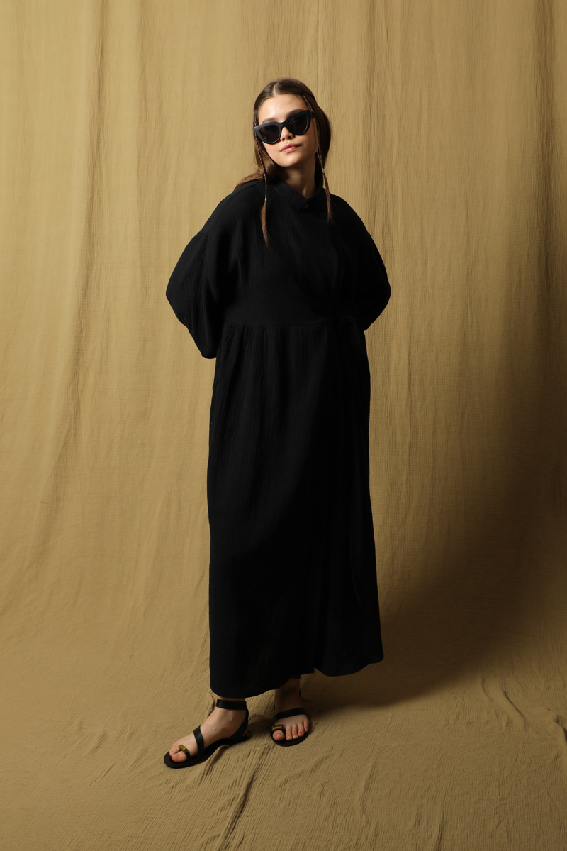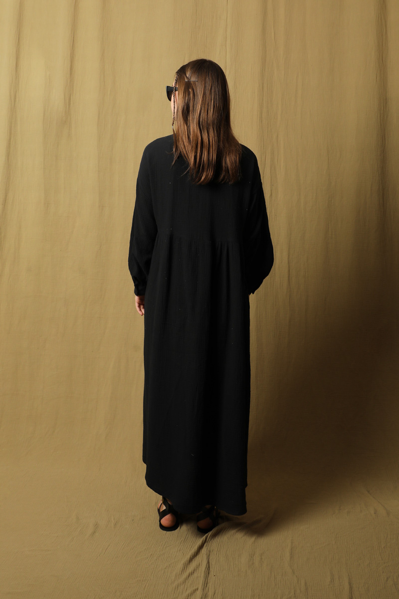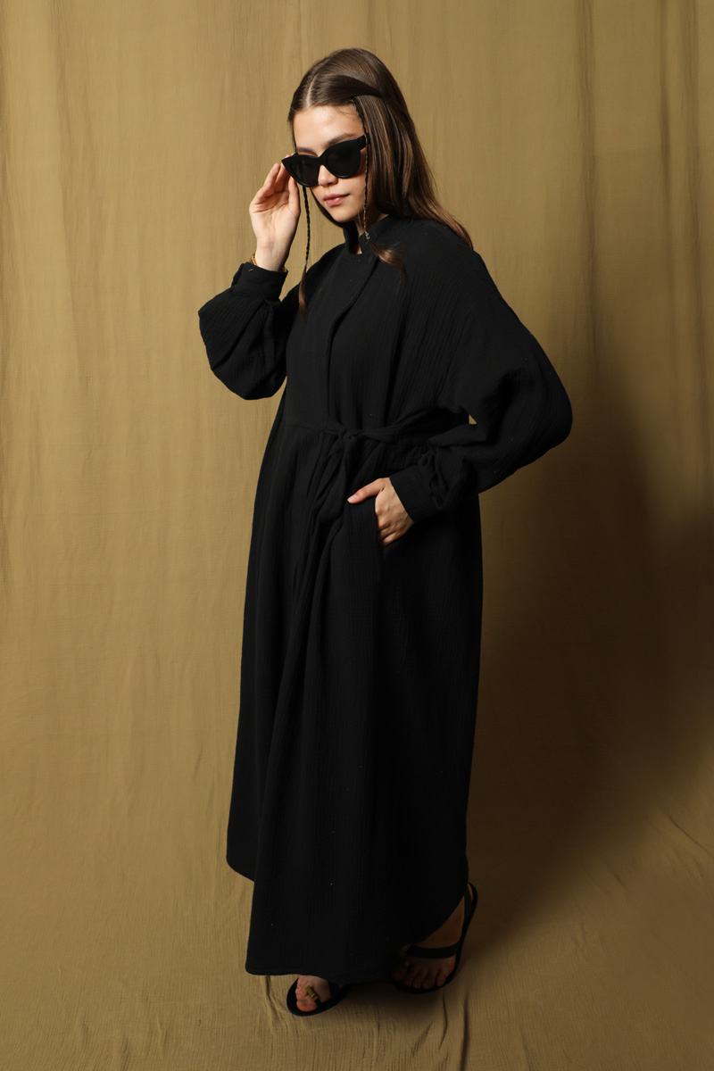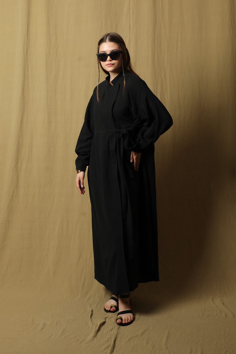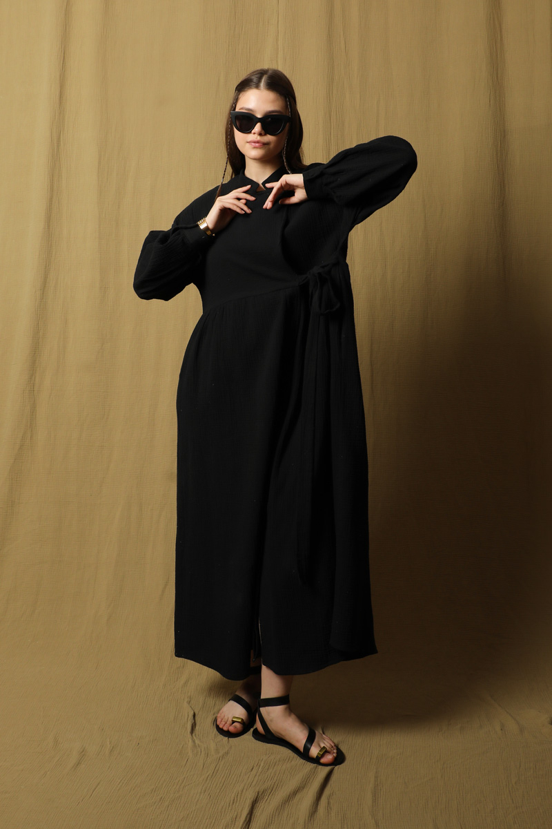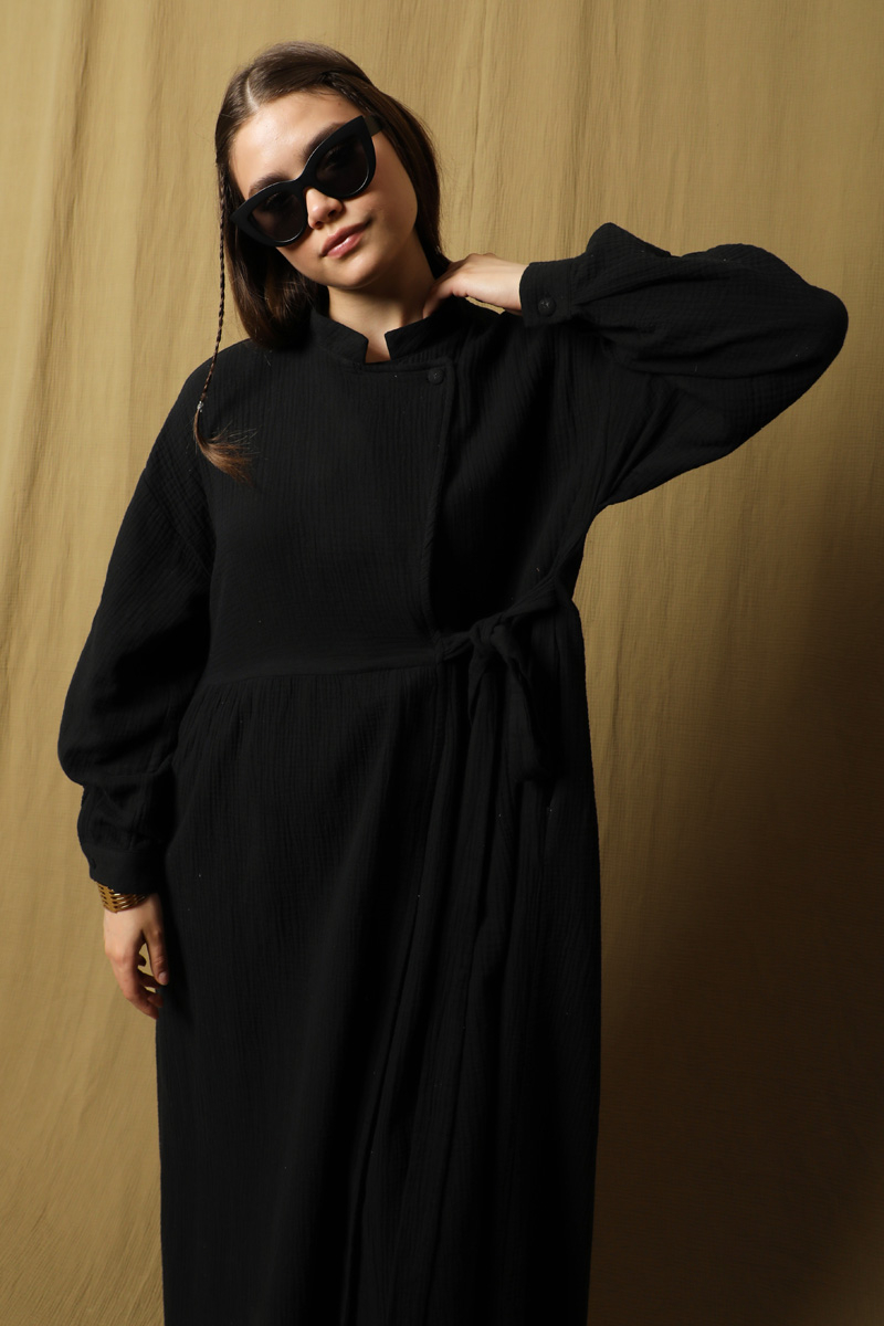 Kruvaze Bağlamalı Müslin Elbise Siyah. Belden aşağısı gizli düğmeli, Üst kısmın kapaması yandan bağlamalı ve yakadan tek düğmelidir. Hakim yaka, yandan gizli cepli, düşük omuz, belden büzgülü, salaş kalıptır. Ürün müslin kumaş olduğu için iç gösterebilir içine içlik ürünlerimizden tercih edebilirsiniz. Yazlık, günlük kullanıma uygundur.