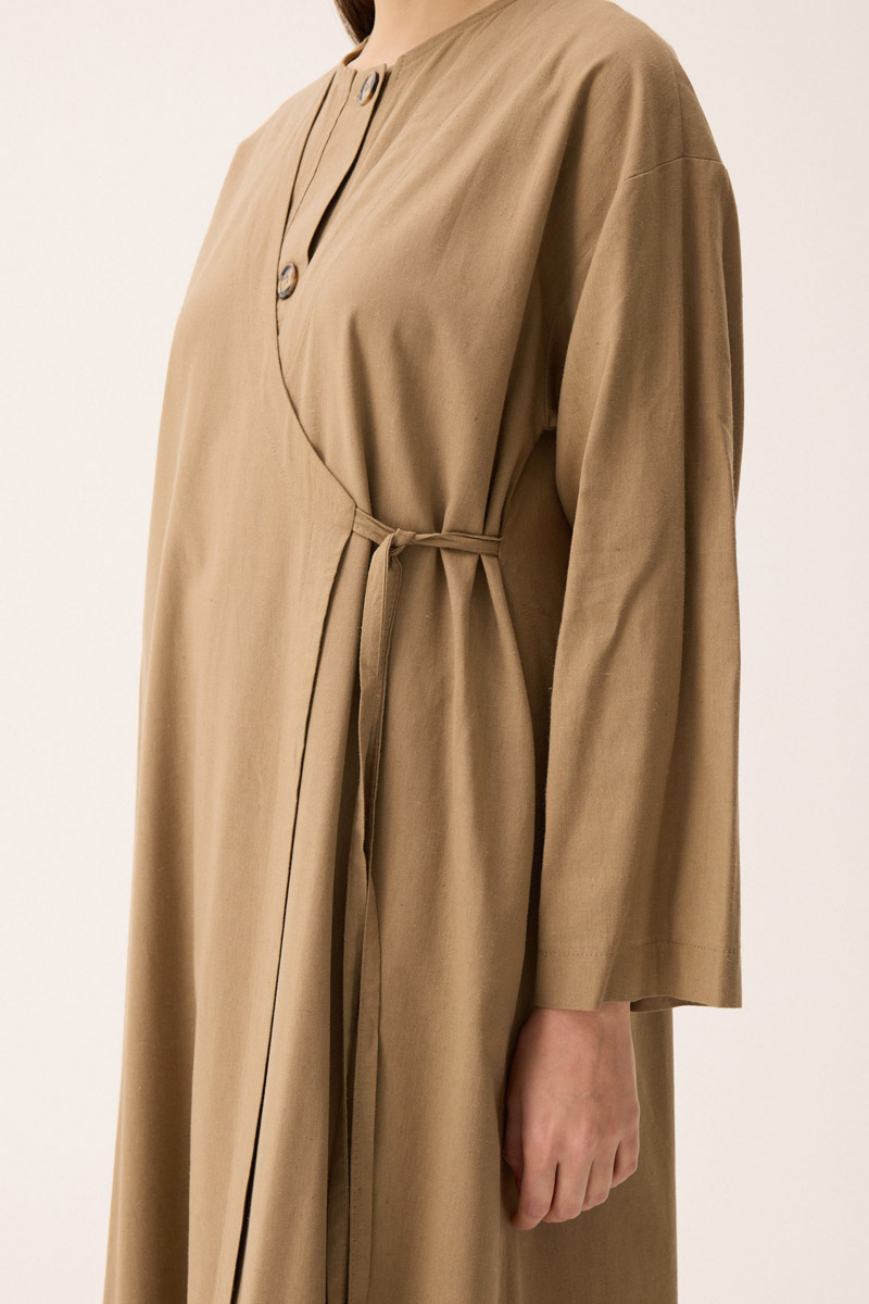 Kruvaze Dehna Abaya Takım Camel. İç elbise bisiklet yakadır, sıfır kolludur, önden süs pat ve düğmelidir, Abaya kruvaze yakadır, yandan bağlamalı tahta boncuk detaylıdır, düşük kolludur, yandan ceplidir, astarsızdır, Günlük kullanım ve özel günlerinizde tercih edebilirsiniz.