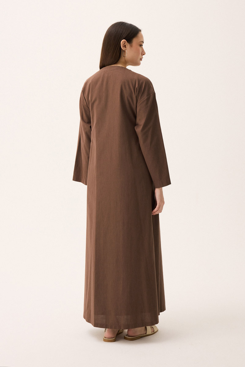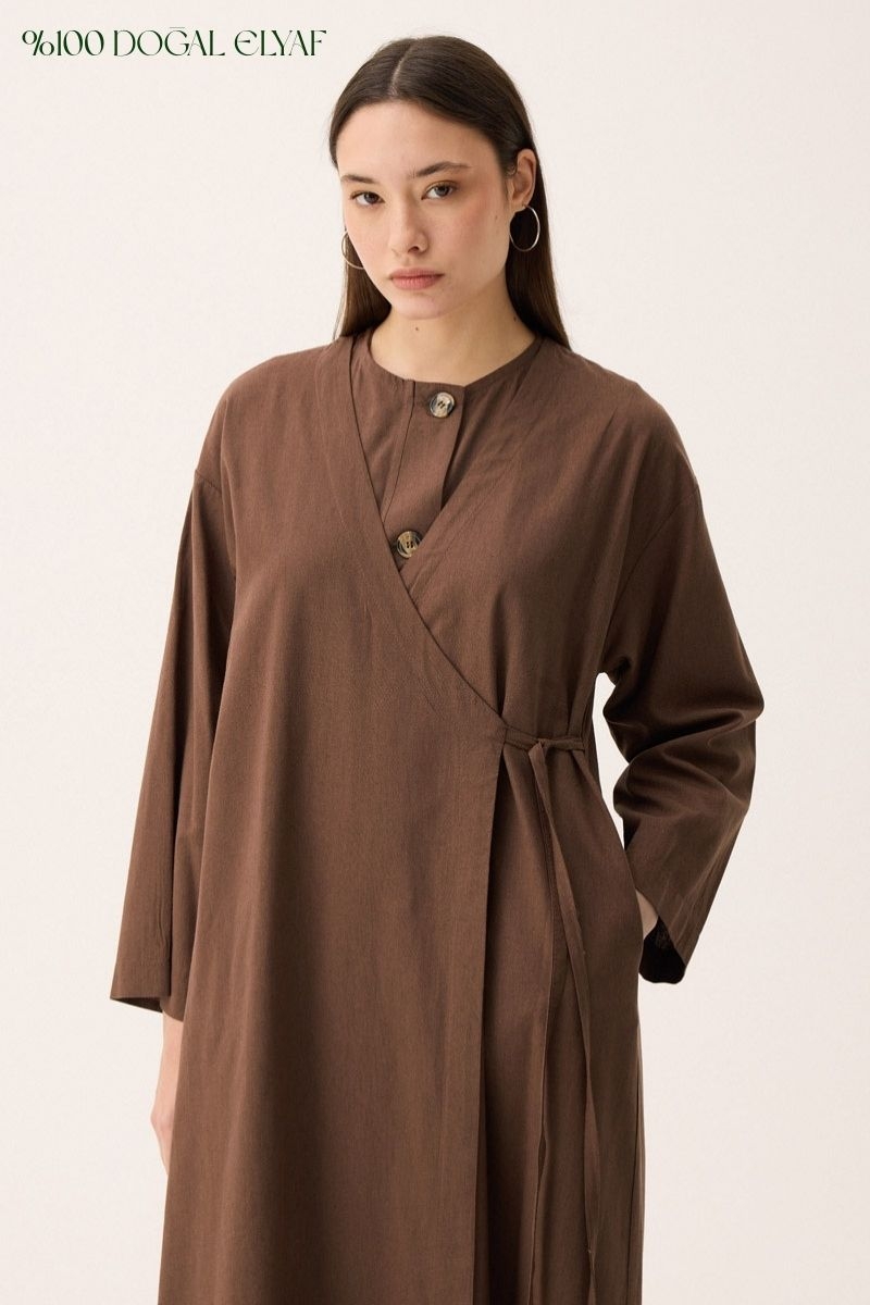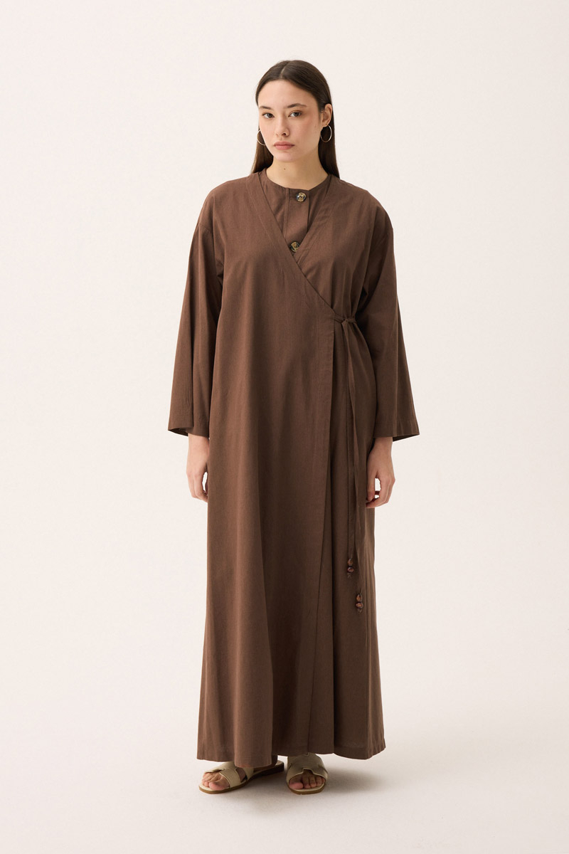 Kruvaze Dehna Abaya Takım Kahverengi. İç elbise bisiklet yakadır, sıfır kolludur, önden süs pat ve düğmelidir, Abaya kruvaze yakadır, yandan bağlamalı tahta boncuk detaylıdır, düşük kolludur, yandan ceplidir, astarsızdır, Günlük kullanım ve özel günlerinizde tercih edebilirsiniz.