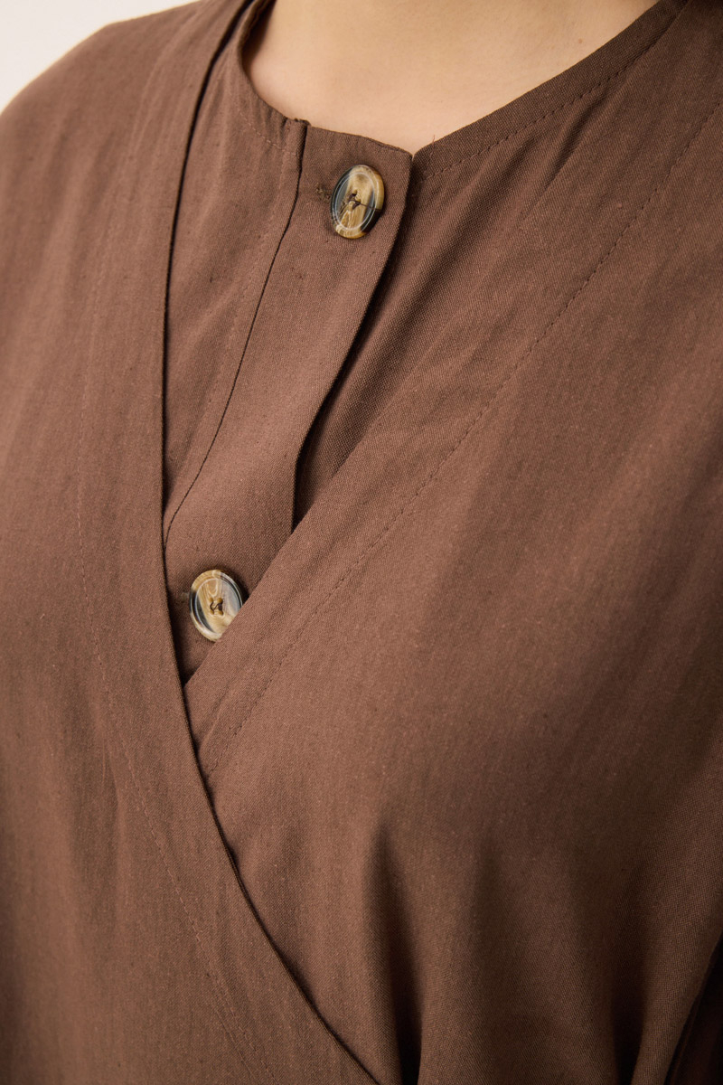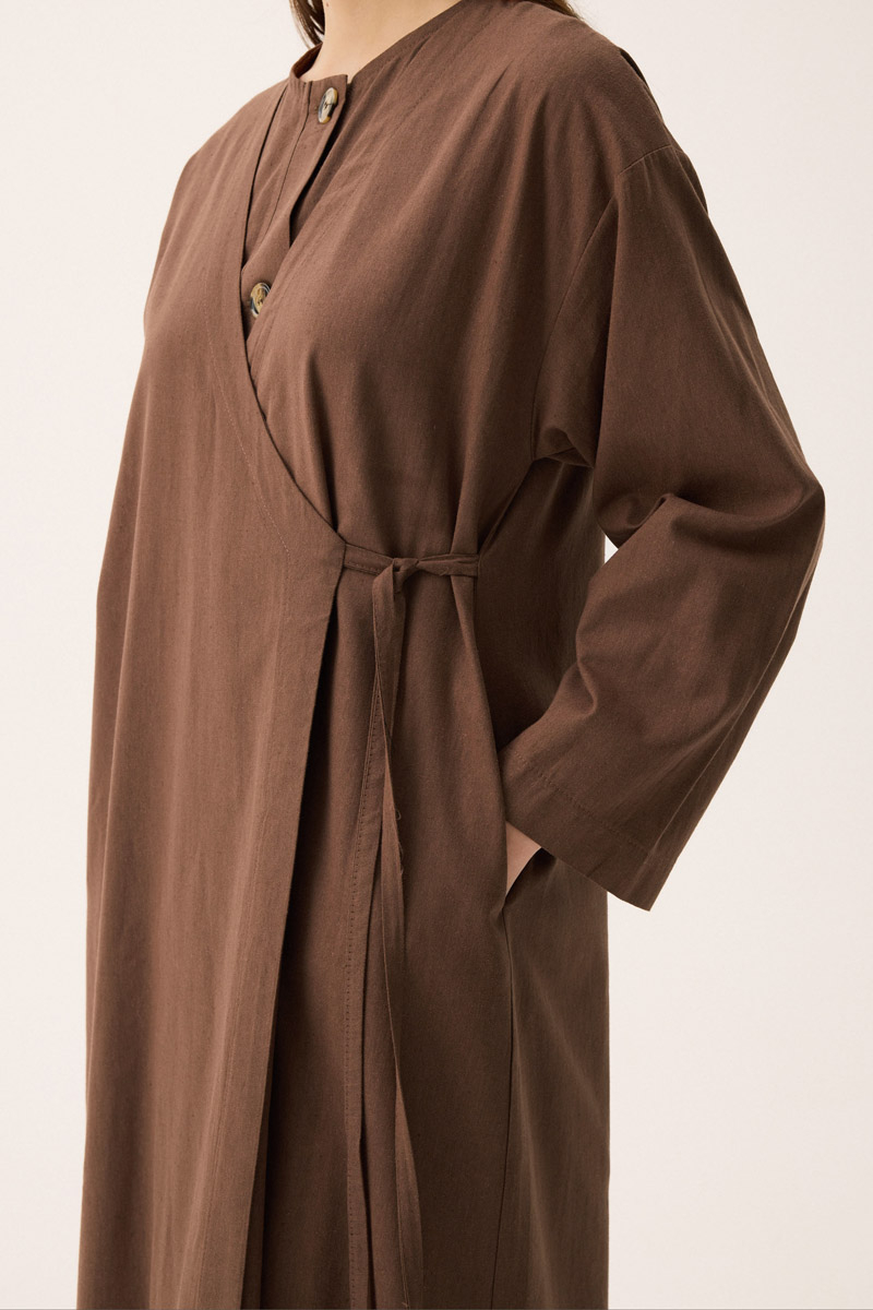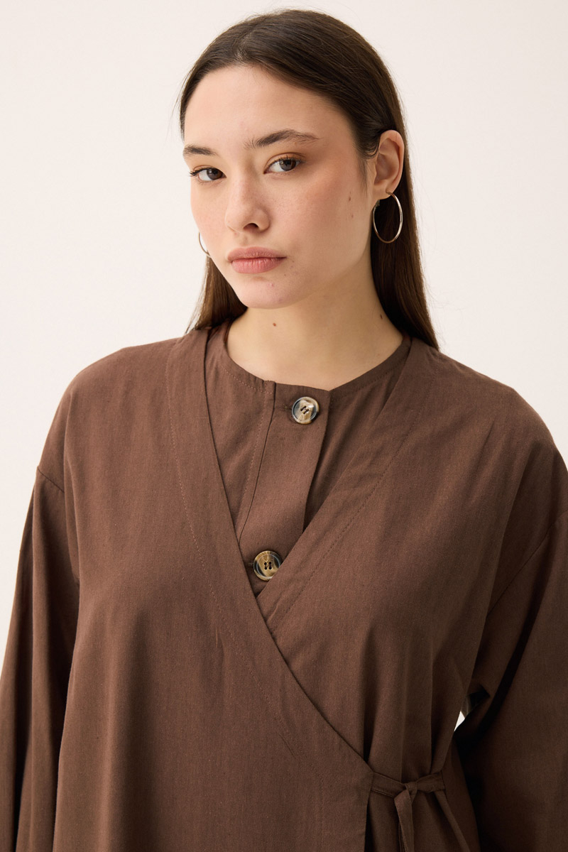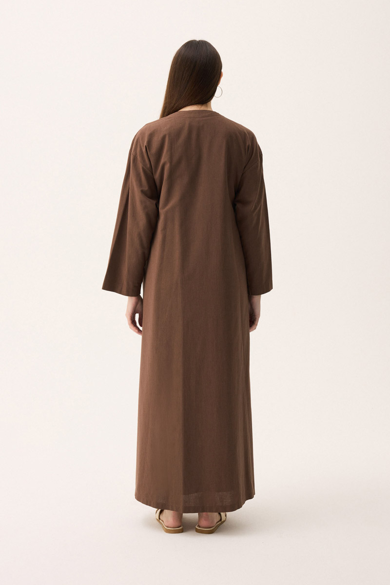 Kruvaze Dehna Abaya Takım Kahverengi. İç elbise bisiklet yakadır, sıfır kolludur, önden süs pat ve düğmelidir, Abaya kruvaze yakadır, yandan bağlamalı tahta boncuk detaylıdır, düşük kolludur, yandan ceplidir, astarsızdır, Günlük kullanım ve özel günlerinizde tercih edebilirsiniz.