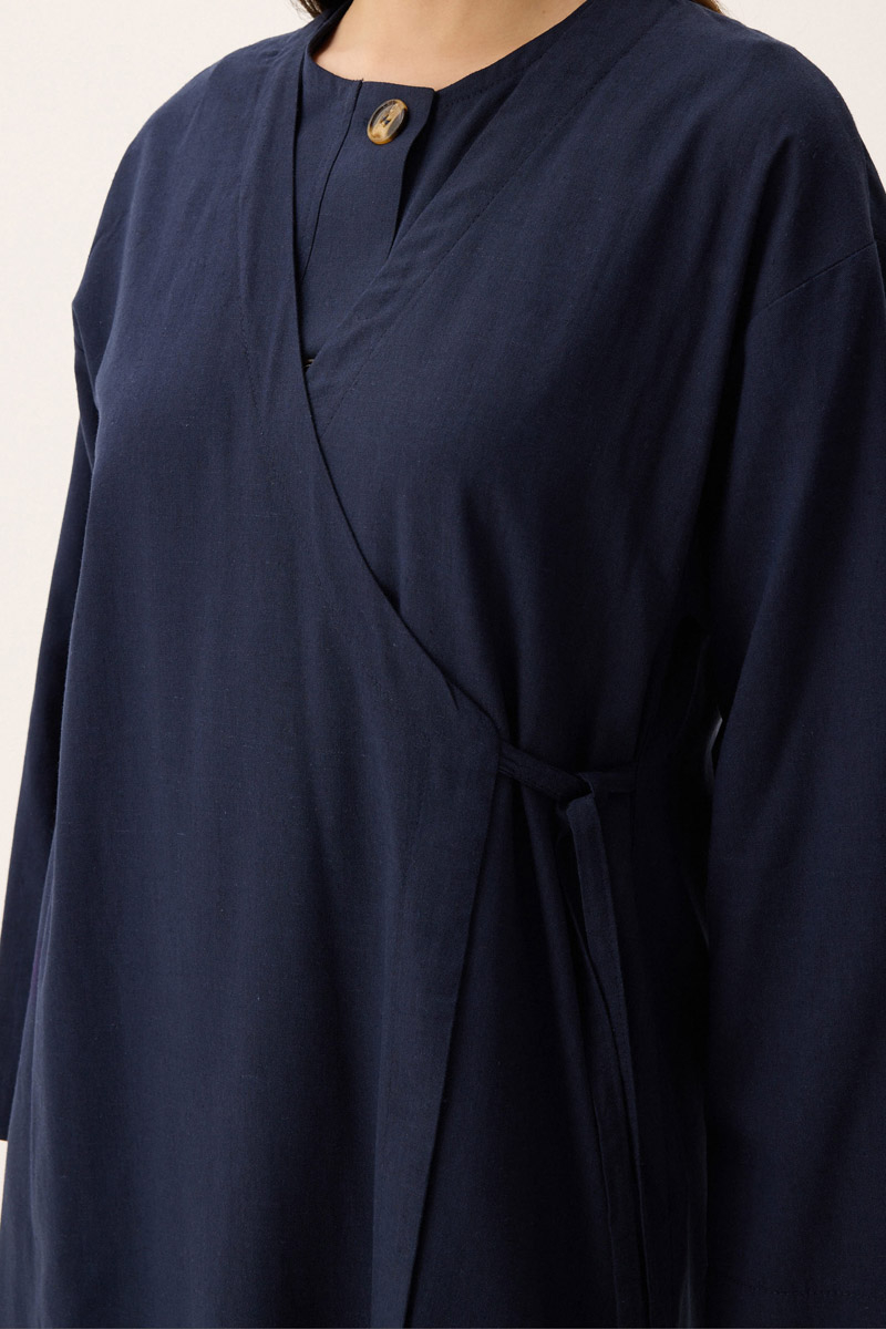 Kruvaze Dehna Abaya Takım Lacivert. İç elbise bisiklet yakadır, sıfır kolludur, önden süs pat ve düğmelidir, Abaya kruvaze yakadır, yandan bağlamalı tahta boncuk detaylıdır, düşük kolludur, yandan ceplidir, astarsızdır, Günlük kullanım ve özel günlerinizde tercih edebilirsiniz.