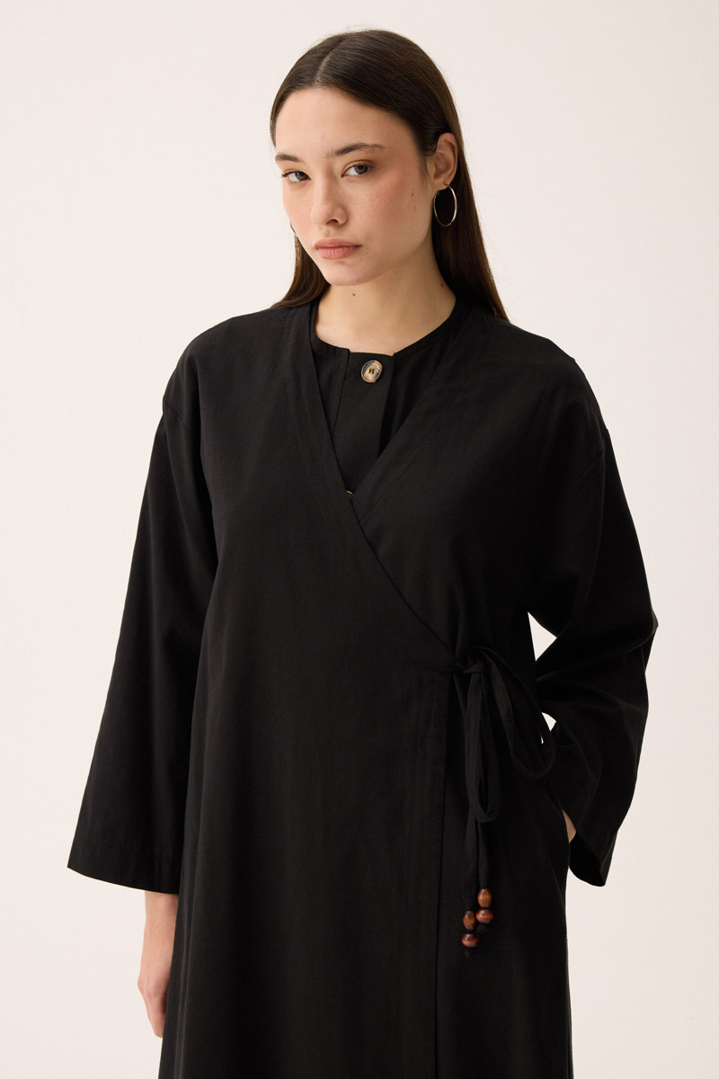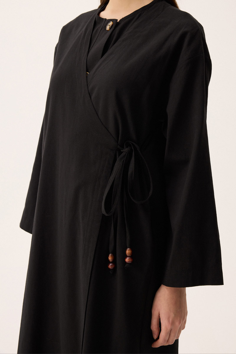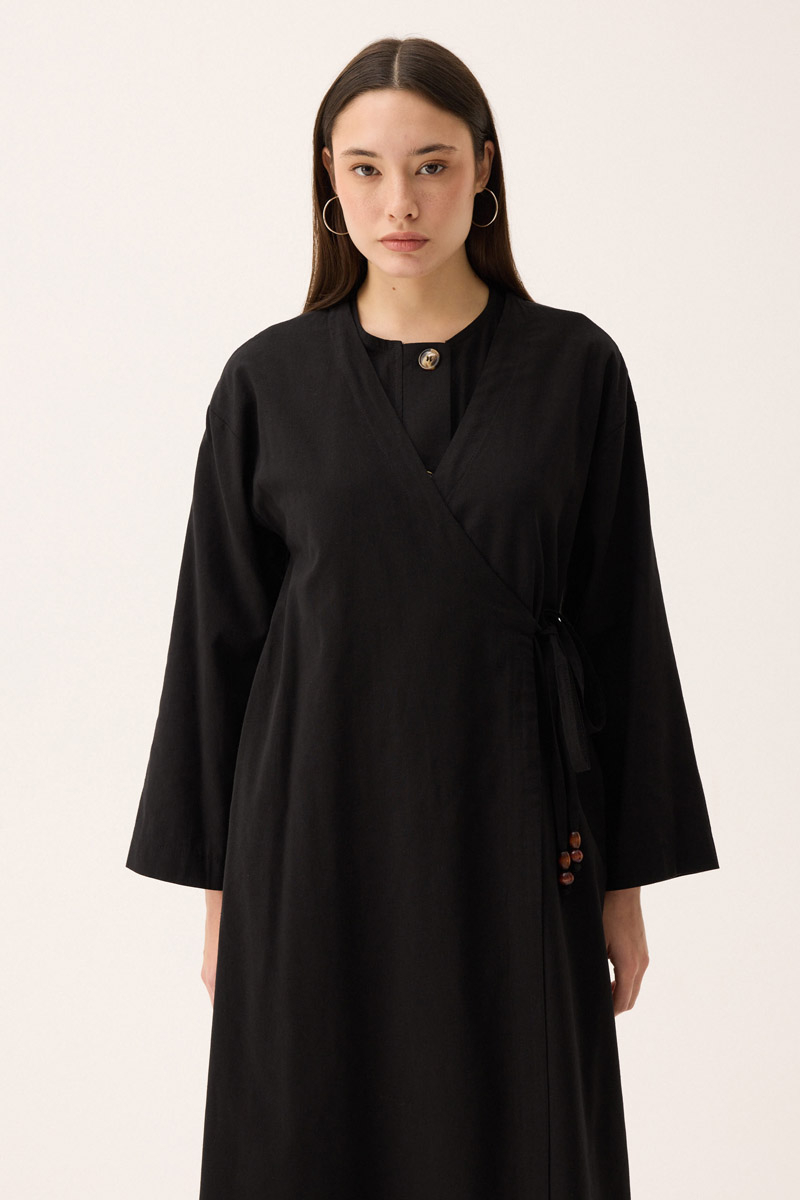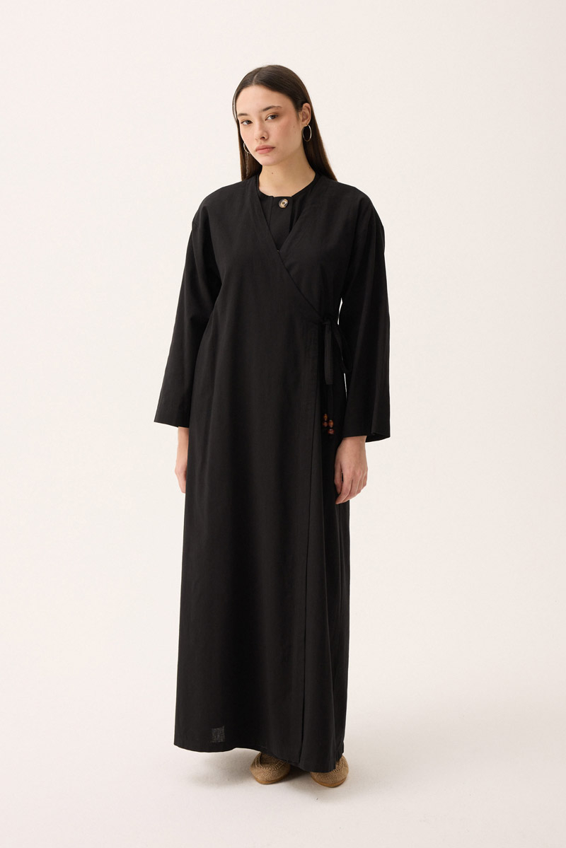 Kruvaze Dehna Abaya Takım Siyah. İç elbise bisiklet yakadır, sıfır kolludur, önden süs pat ve düğmelidir, Abaya kruvaze yakadır, yandan bağlamalı tahta boncuk detaylıdır, düşük kolludur, yandan ceplidir, astarsızdır, Günlük kullanım ve özel günlerinizde tercih edebilirsiniz.