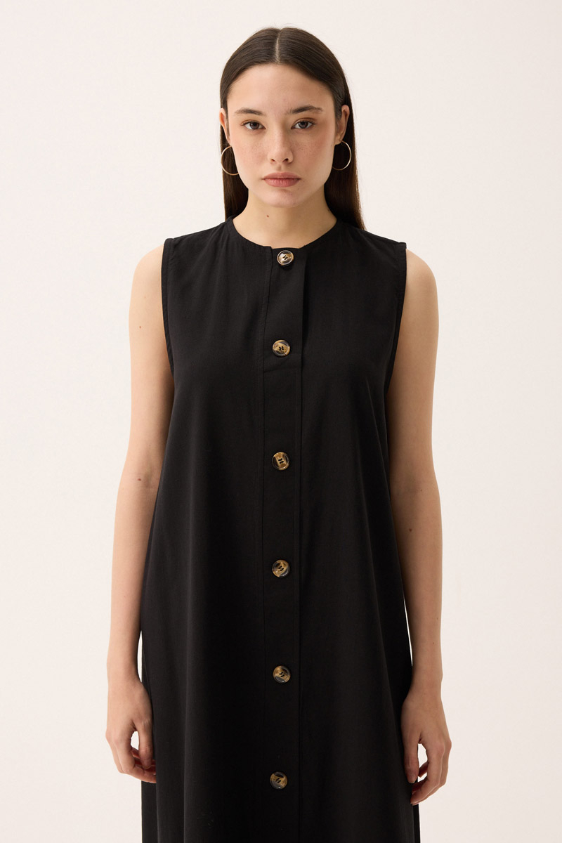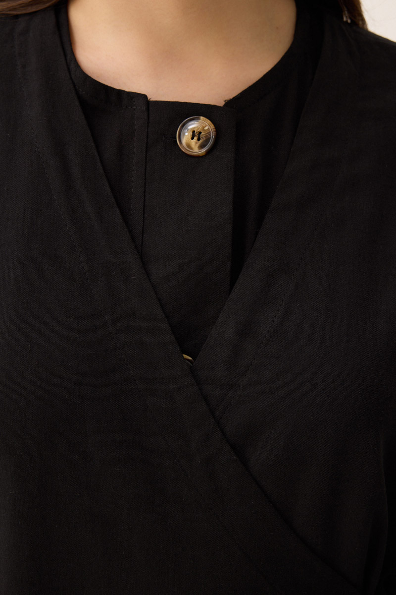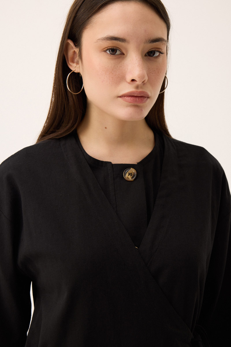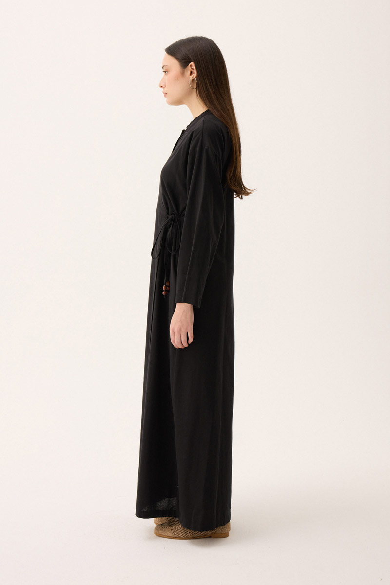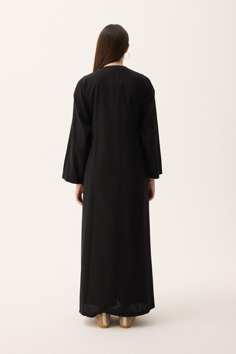 Kruvaze Dehna Abaya Takım Siyah. İç elbise bisiklet yakadır, sıfır kolludur, önden süs pat ve düğmelidir, Abaya kruvaze yakadır, yandan bağlamalı tahta boncuk detaylıdır, düşük kolludur, yandan ceplidir, astarsızdır, Günlük kullanım ve özel günlerinizde tercih edebilirsiniz.