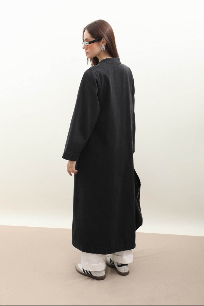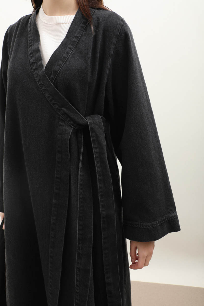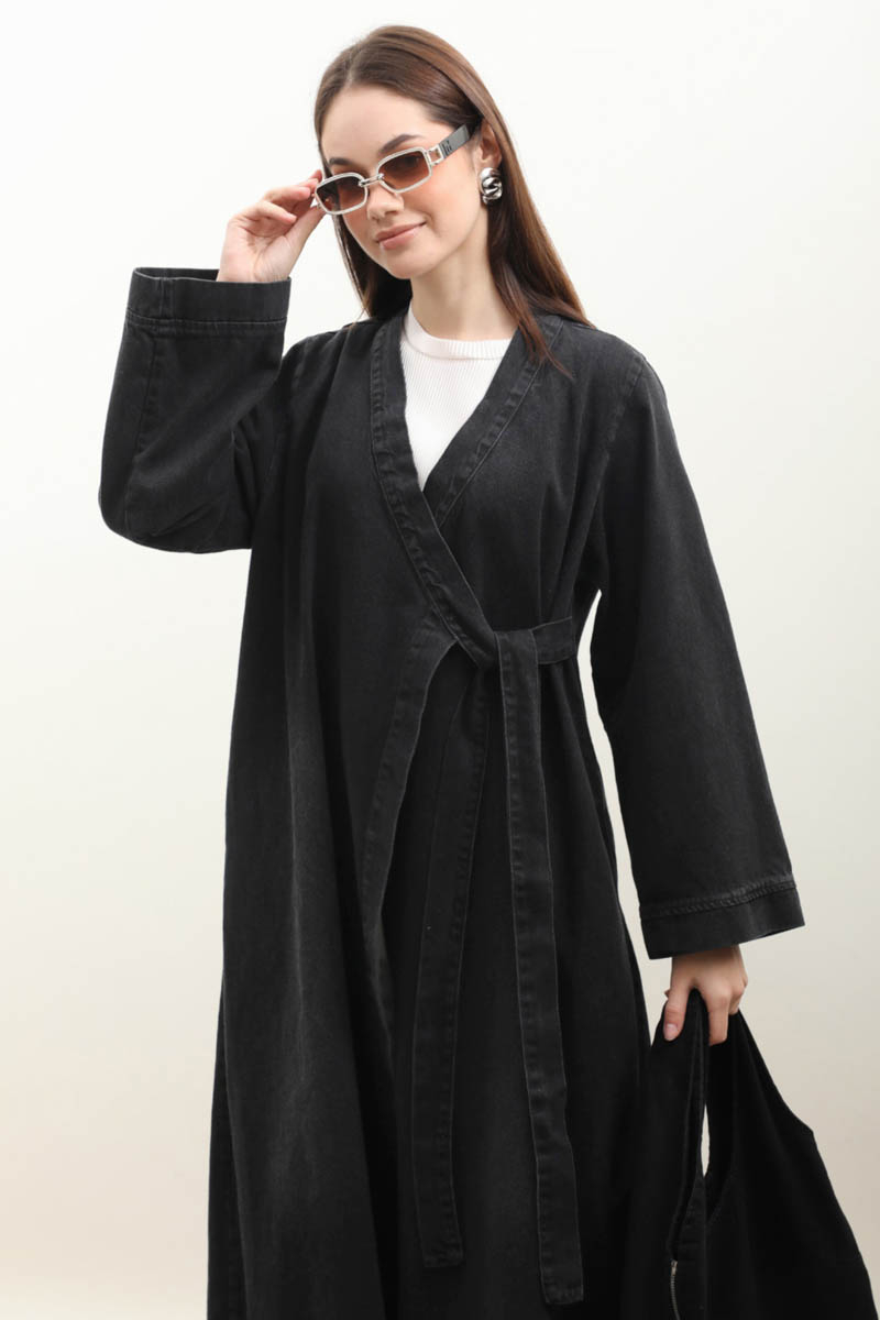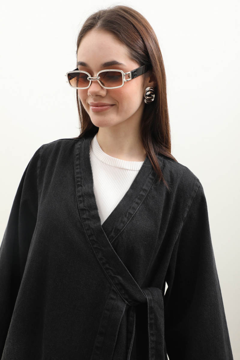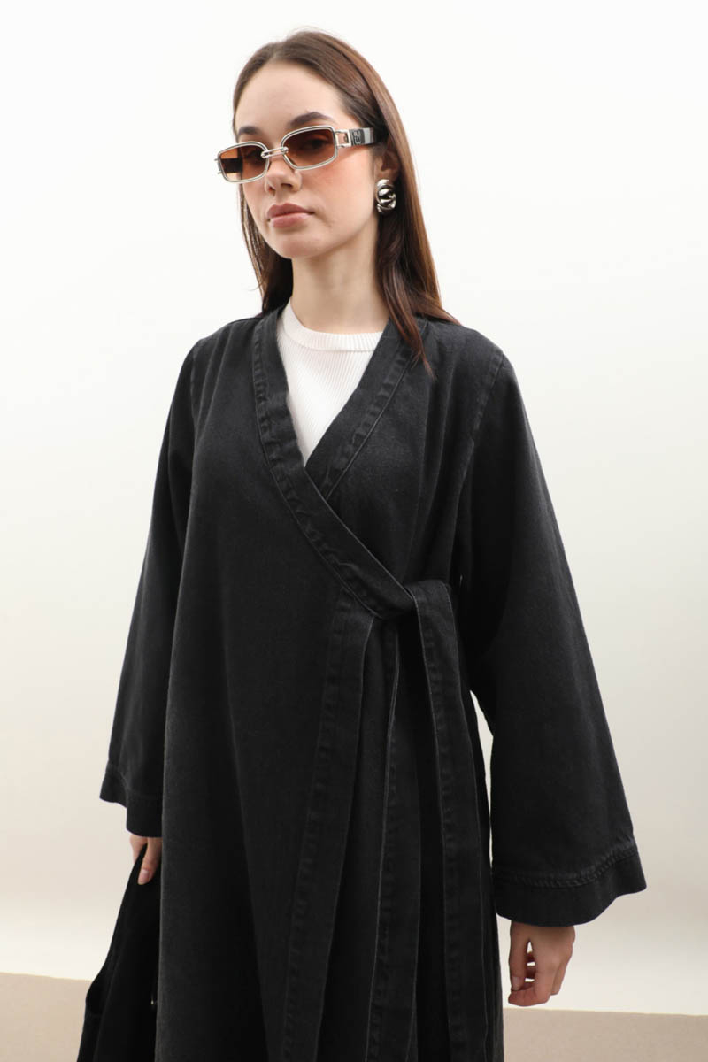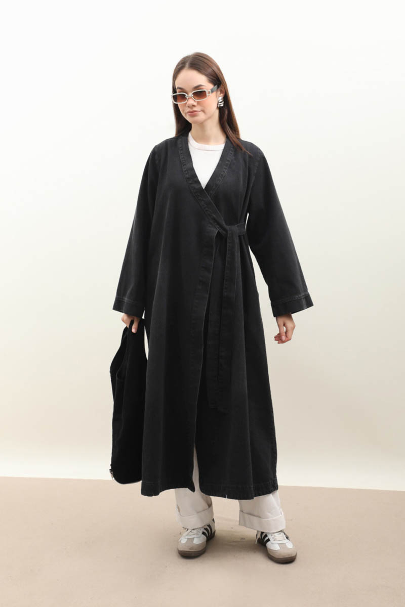 Kruvaze Denim Trençkot Siyah. İçten ve dıştan yandan bağlamalıdır, kruvaze yakadır, geniş kolludur, ceplidir, astarsızdır, Günlük kullanım ve özel günlerinizde tercih edebilirsiniz.