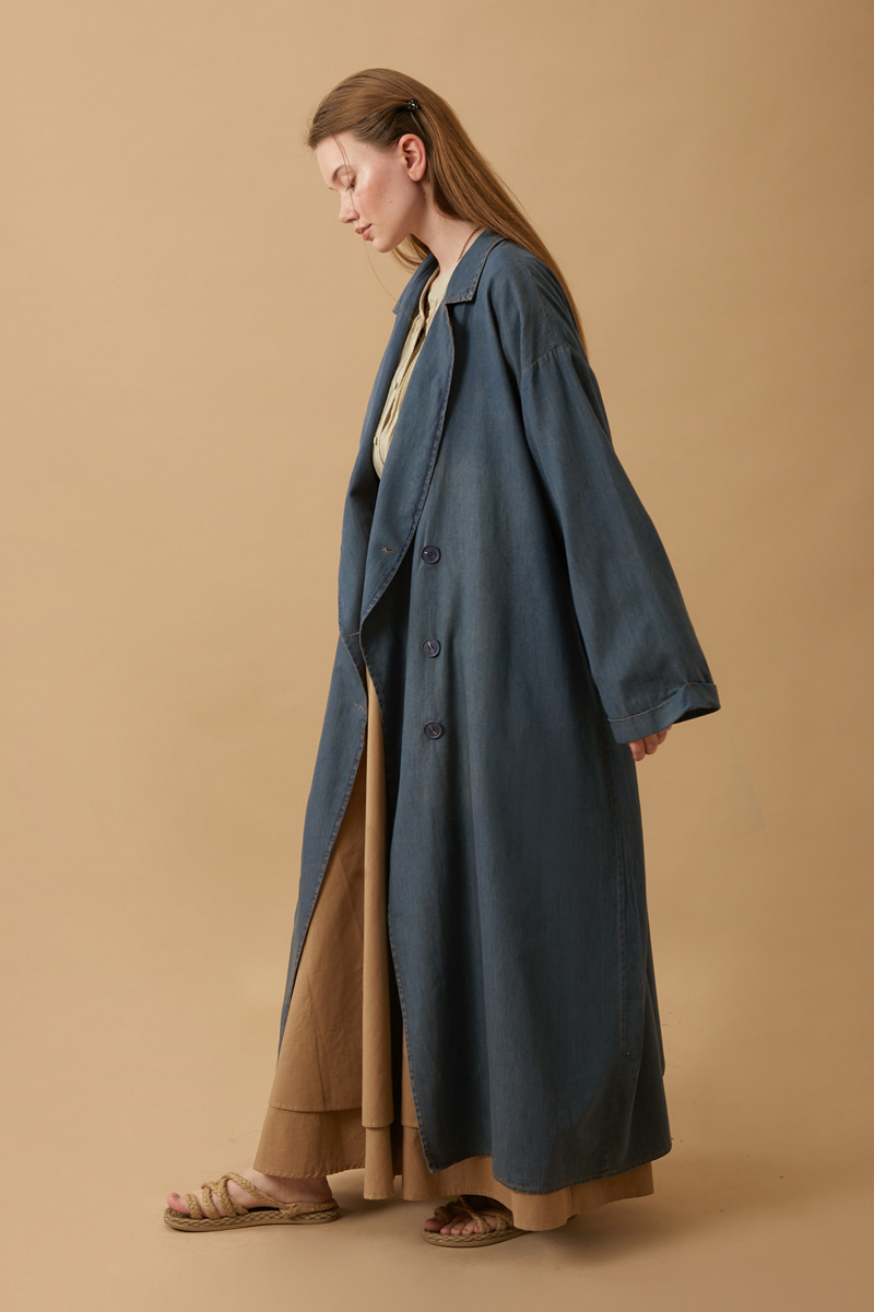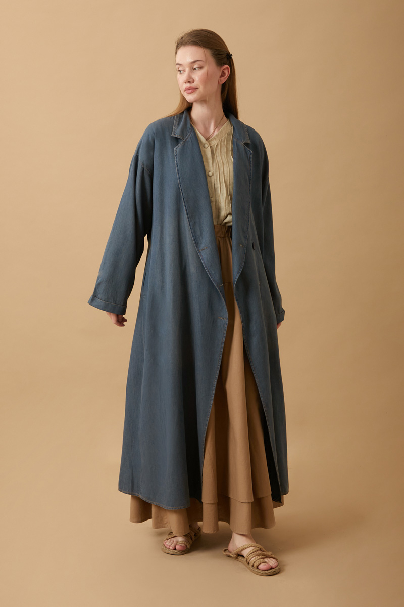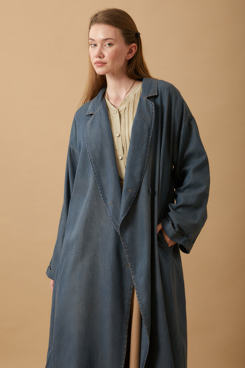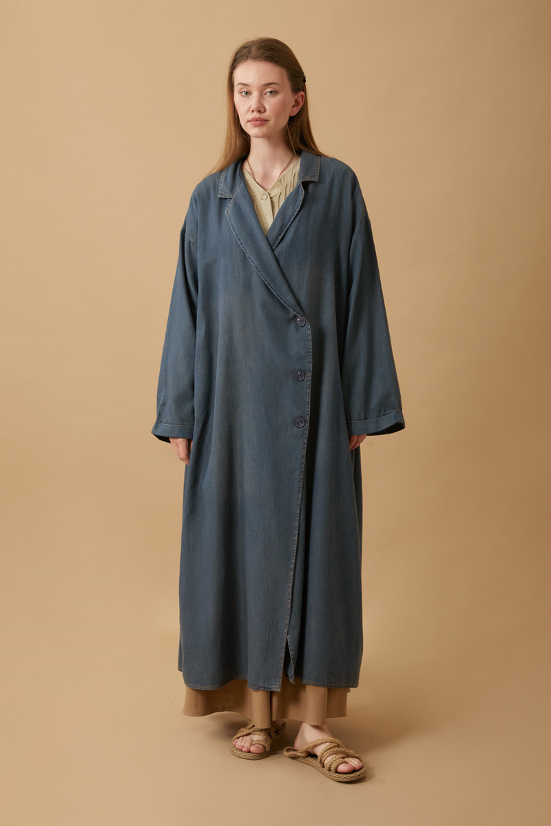 Kruvaze Düğmeli Denim Trençkot Koyu Mavi