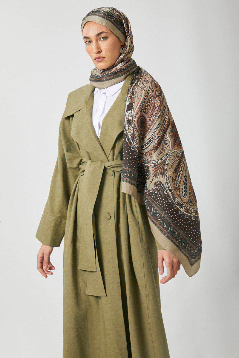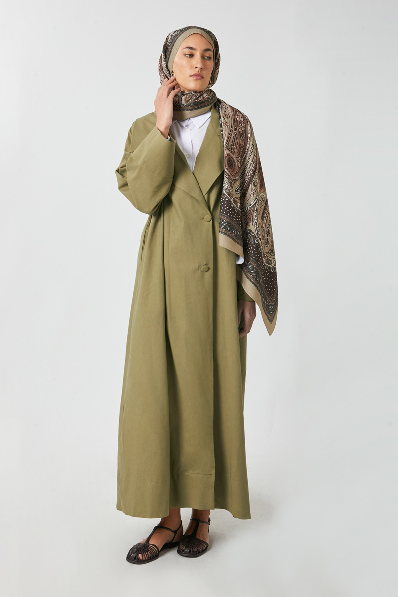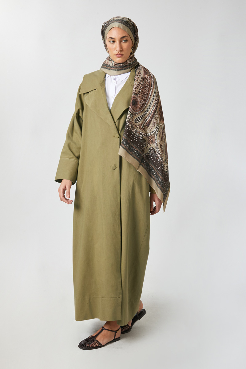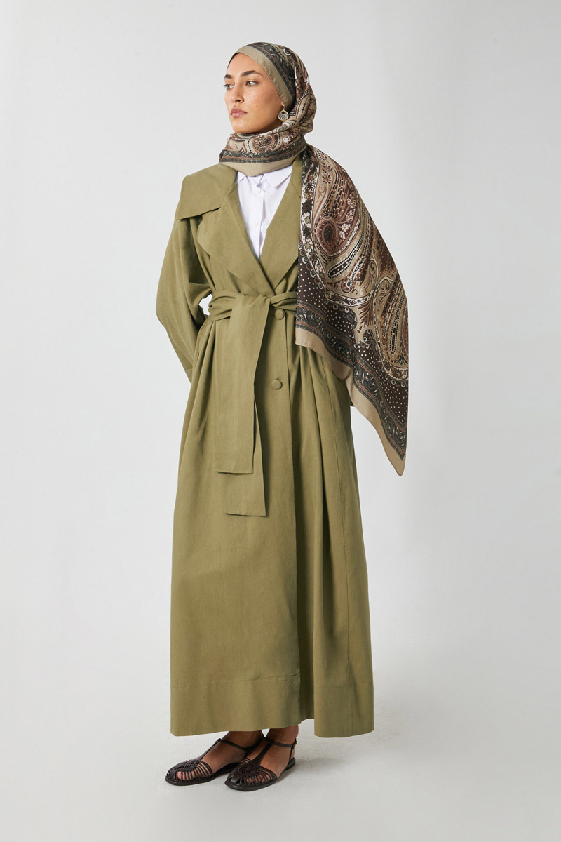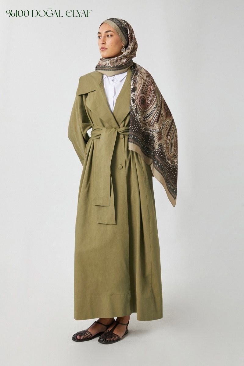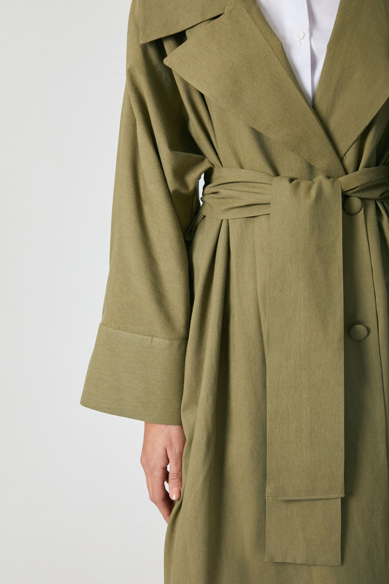 Kruvaze Keten Trenç Haki. Kruvaze kapamadır, düşük omuzludur, beli kemerlidir, yandan ceplidir, astarsızdır. Günlük kullanım ve özel günlerinizde tercih edebilirsiniz.