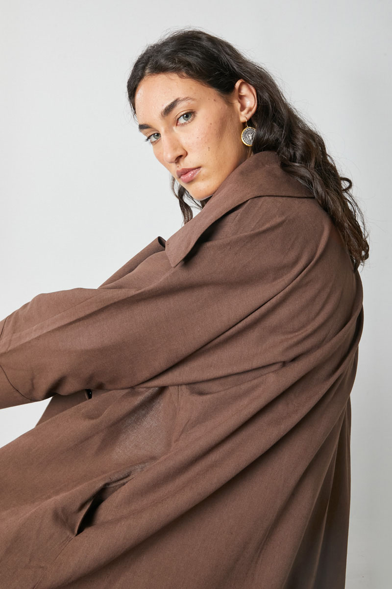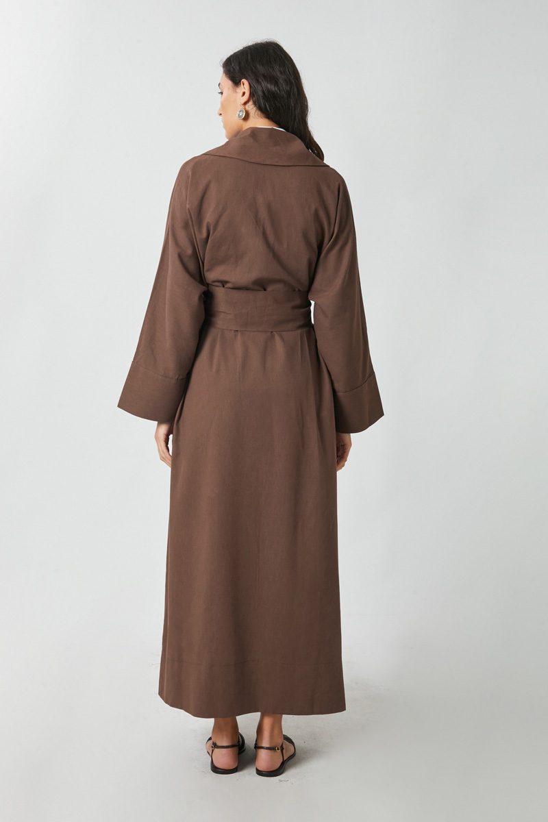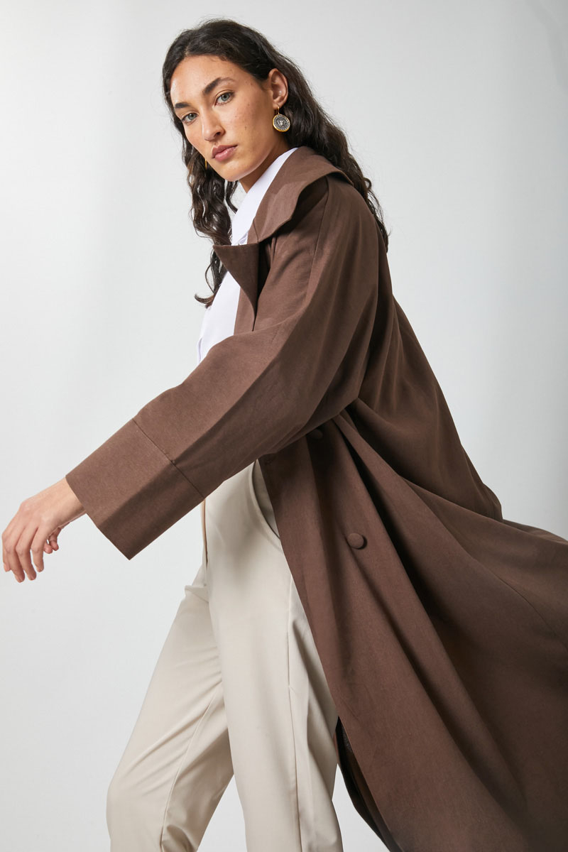Kruvaze Keten Trenç Kahverengi. Kruvaze kapamadır, düşük omuzludur, beli kemerlidir, yandan ceplidir, astarsızdır. Günlük kullanım ve özel günlerinizde tercih edebilirsiniz.