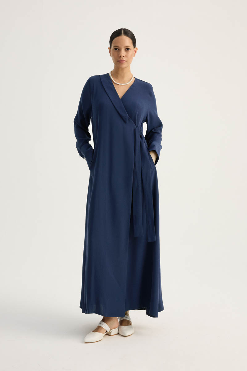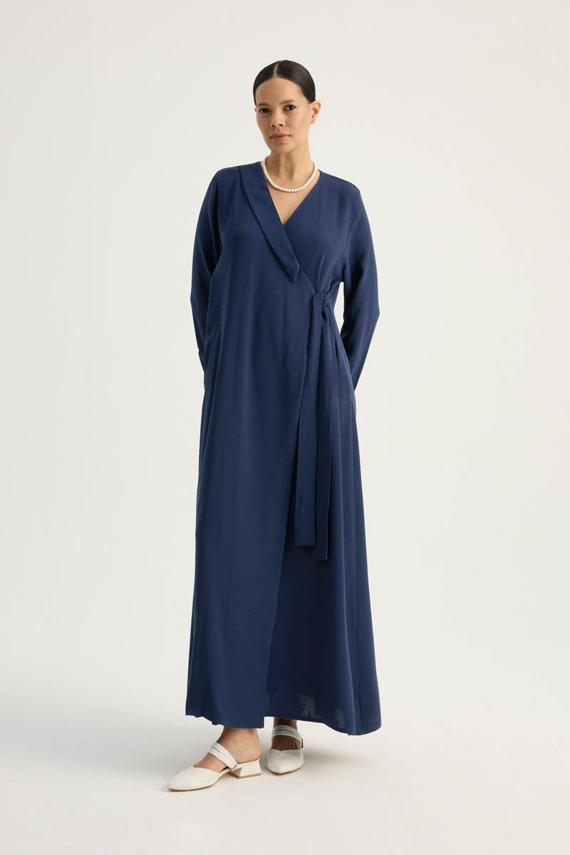 Kruvaze Krep Abaya Lacivert. Kruvaze kesim v yakadır, yandan bağlamalıdır, manşeti inci düğme detaylıdır, yandan ceplidir. Günlük kullanım ve özel günlerinizde tercih edebilirsiniz.