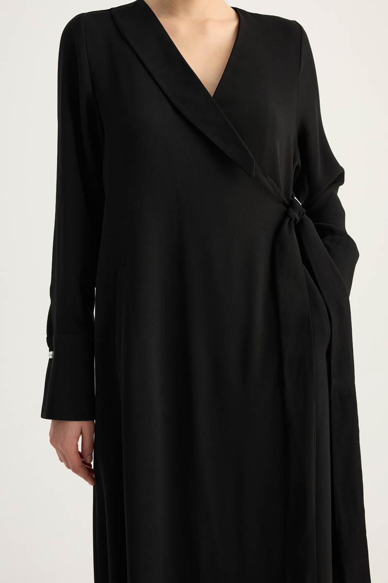 Kruvaze Krep Abaya Siyah. Kruvaze kesim v yakadır, yandan bağlamalıdır, manşeti inci düğme detaylıdır, yandan ceplidir. Günlük kullanım ve özel günlerinizde tercih edebilirsiniz.