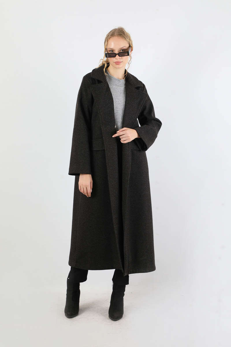 Kruvaze Tokalı Uzun Kaban Siyah