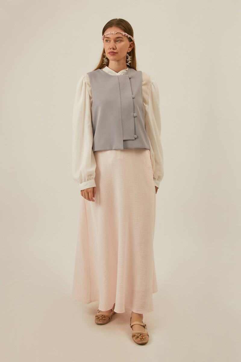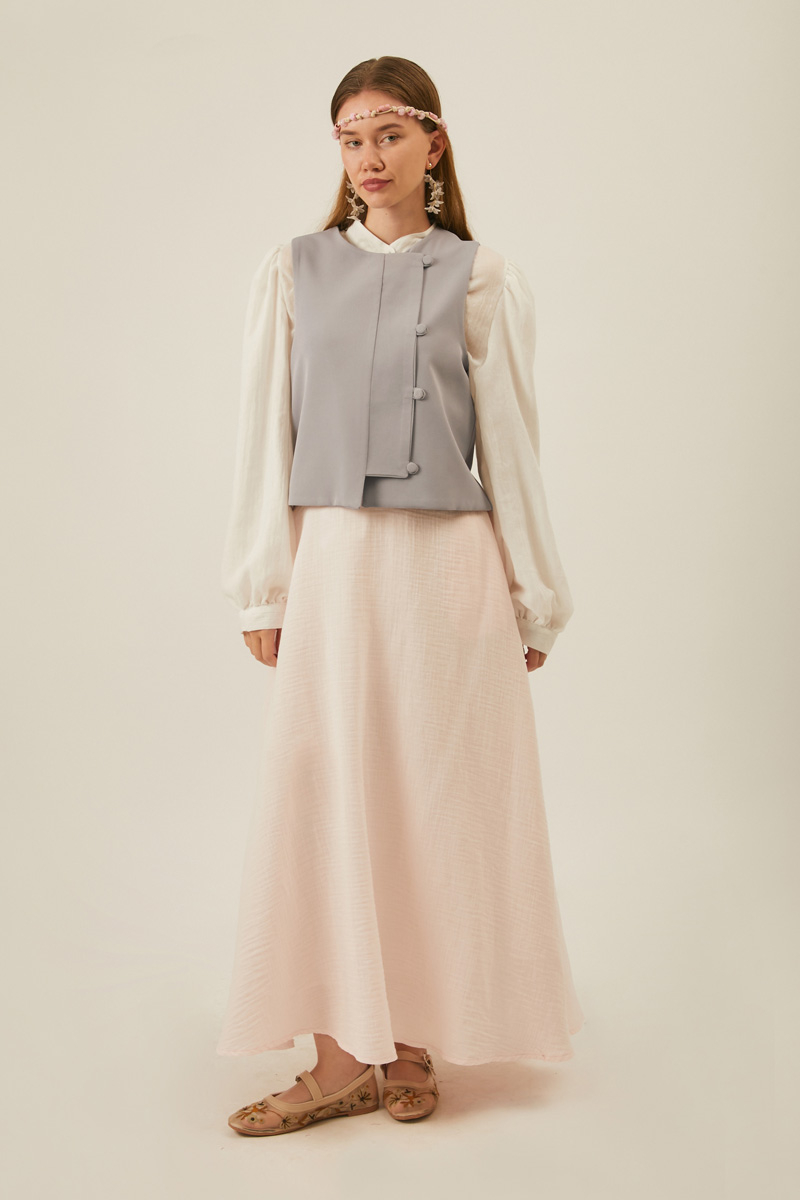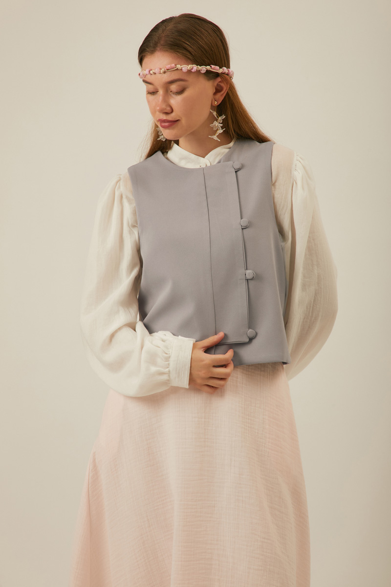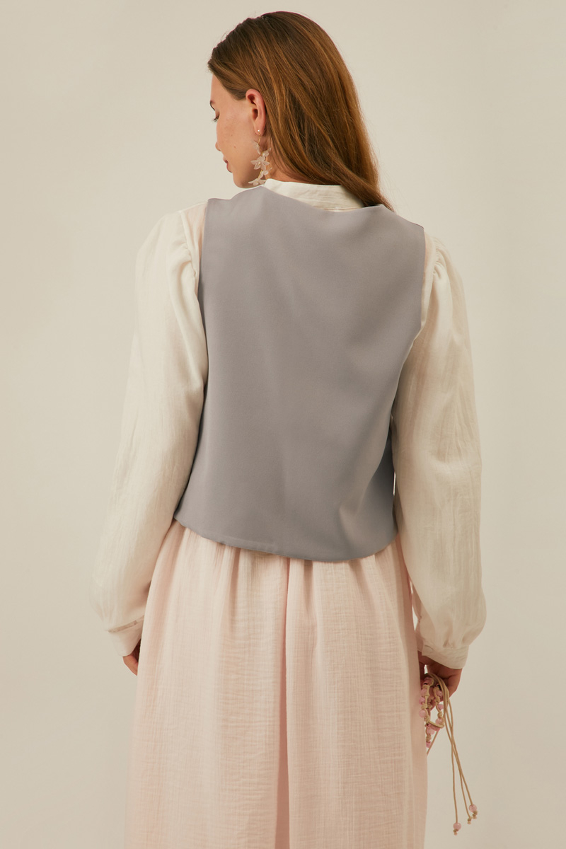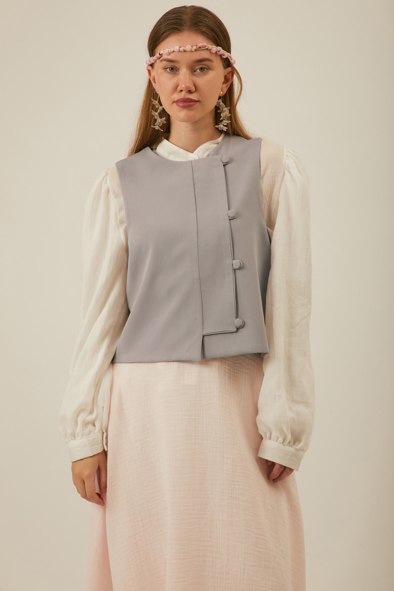 Kruvaze Yelek Gri. Geniş patlıdır. Birit düğmelidir. Kruvaze kapamadır. Astarlıdır. Elbise ve etek kombinlerinizde tercih edebilirsiniz. Mevsimlik üründür.