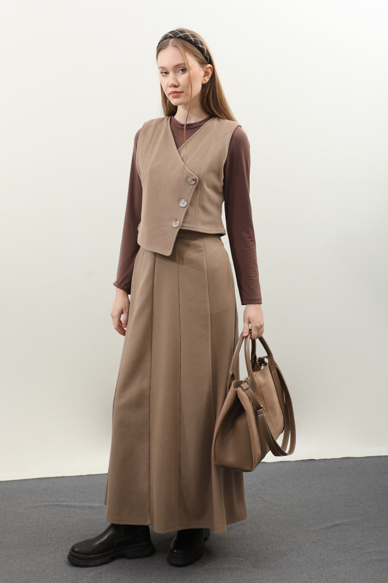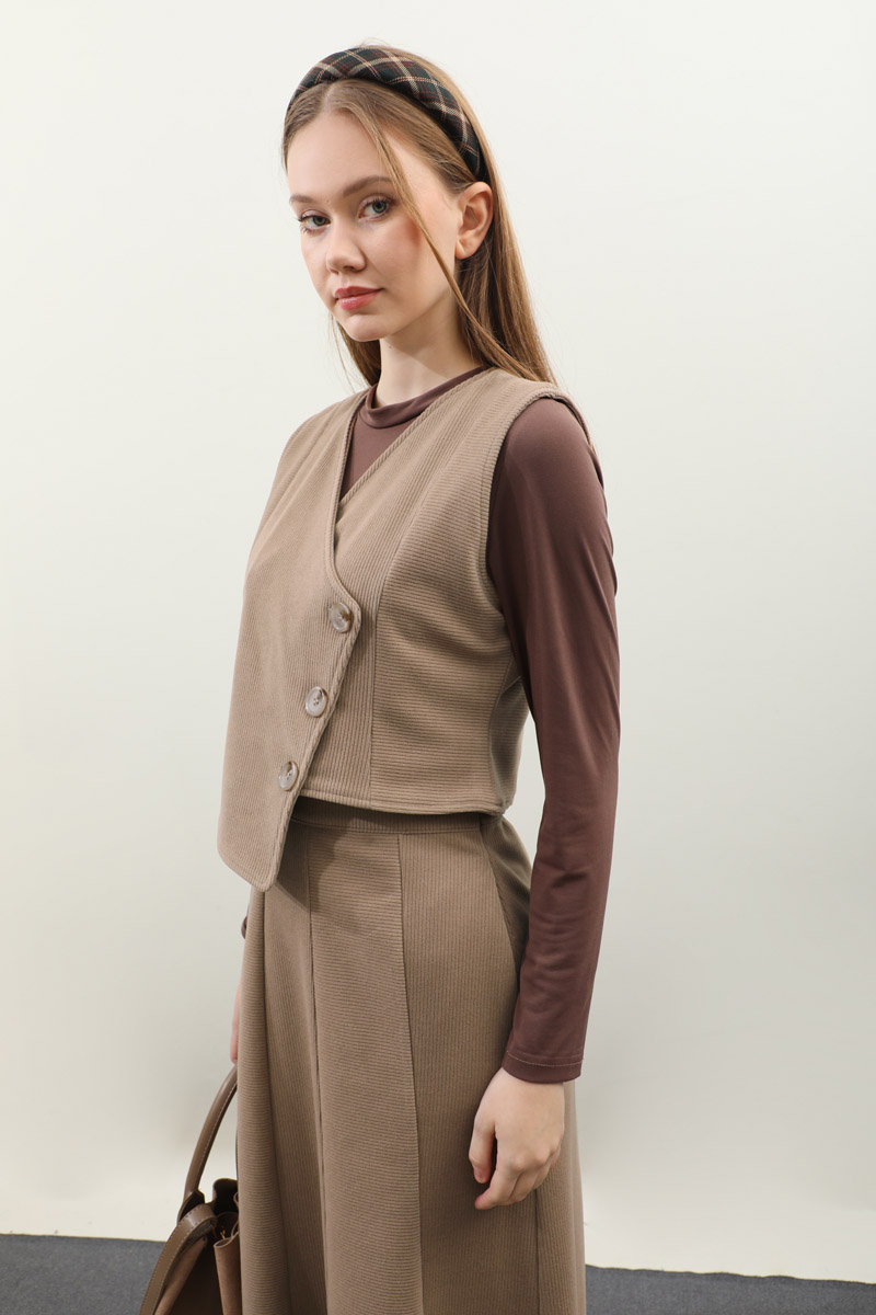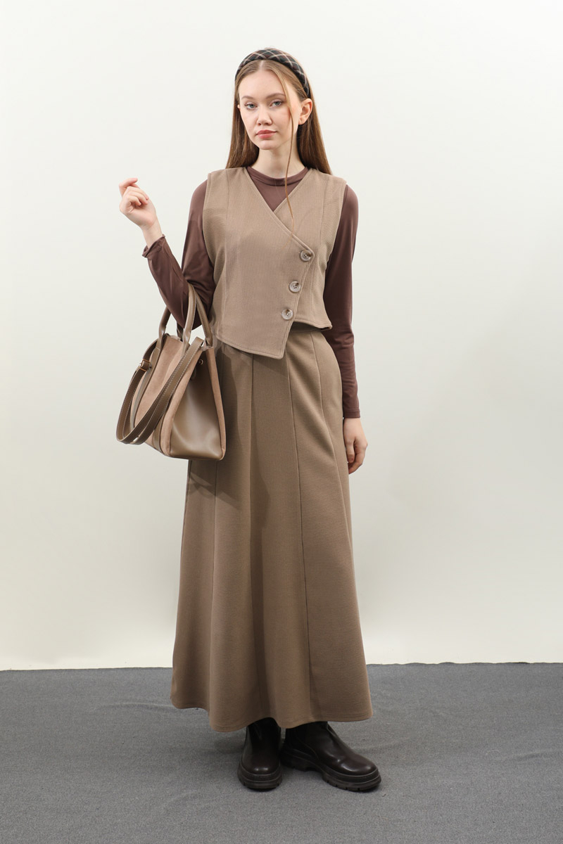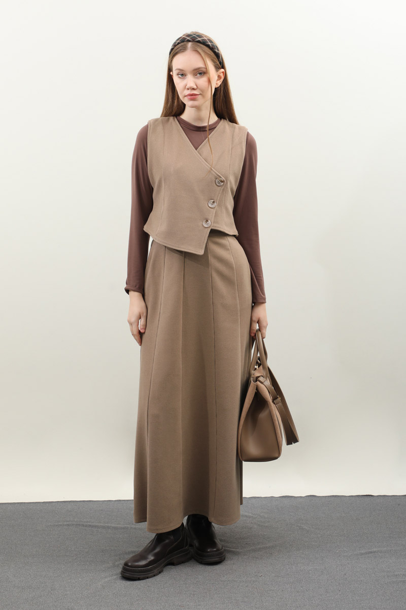 Kruvaze Yelekli Takım Koyu Vizon. Asimetrik yelek takım, yelek tam kalıptır, tam kalıptır, kumaşı esnektir, eteği yandan ceplidir, belden lastiklidir, astarsızdır. Günlük kullanım ve özel günlerinizde tercih edebilirsiniz.