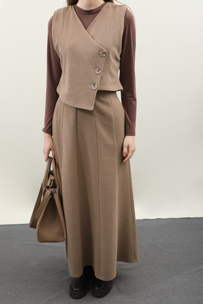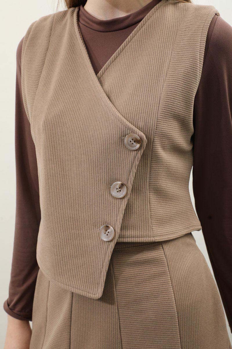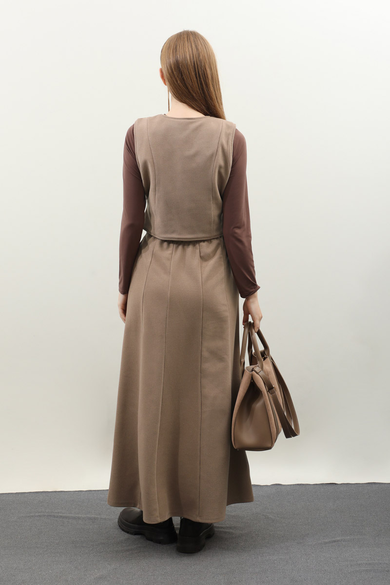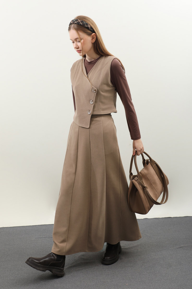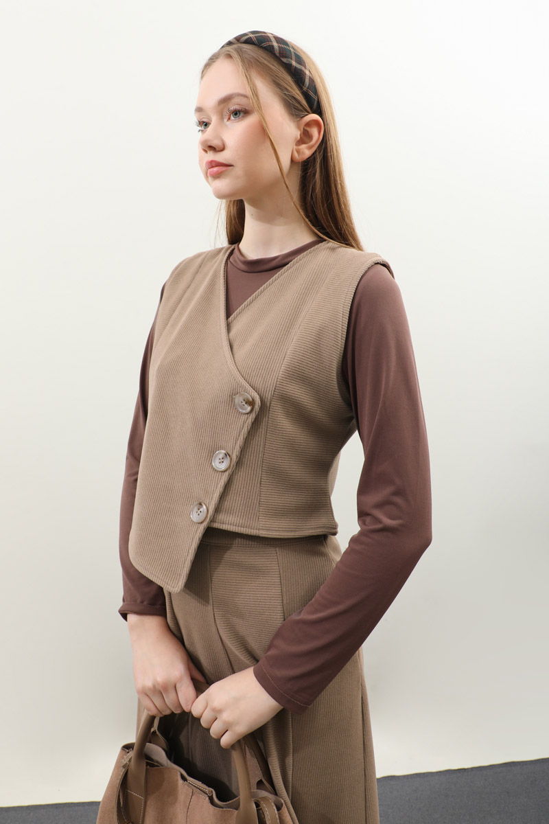 Kruvaze Yelekli Takım Koyu Vizon. Asimetrik yelek takım, yelek tam kalıptır, tam kalıptır, kumaşı esnektir, eteği yandan ceplidir, belden lastiklidir, astarsızdır. Günlük kullanım ve özel günlerinizde tercih edebilirsiniz.