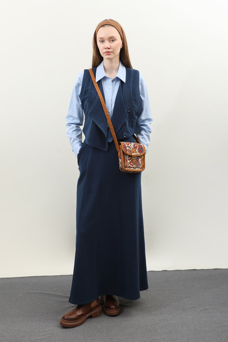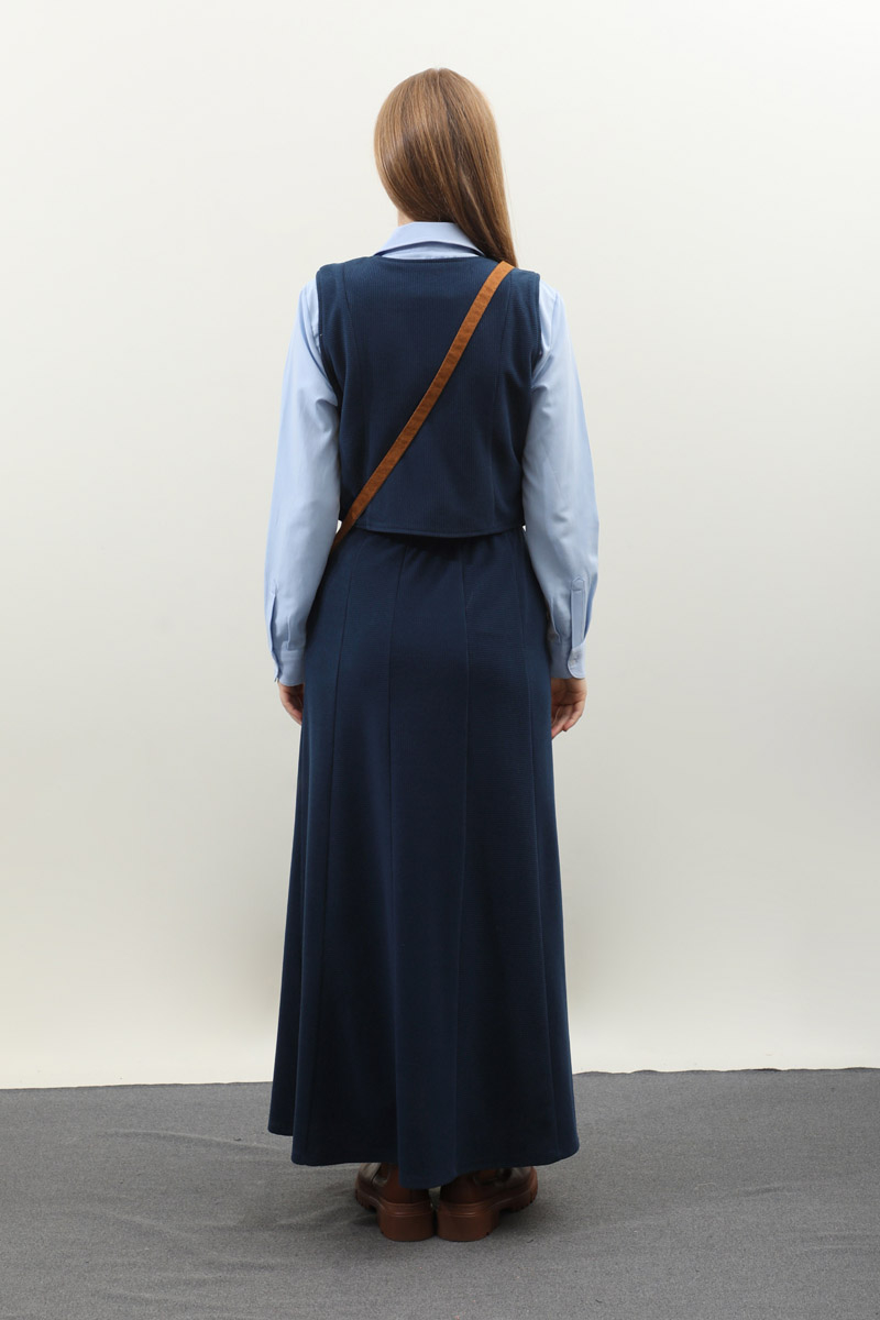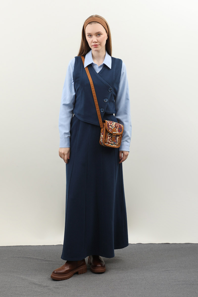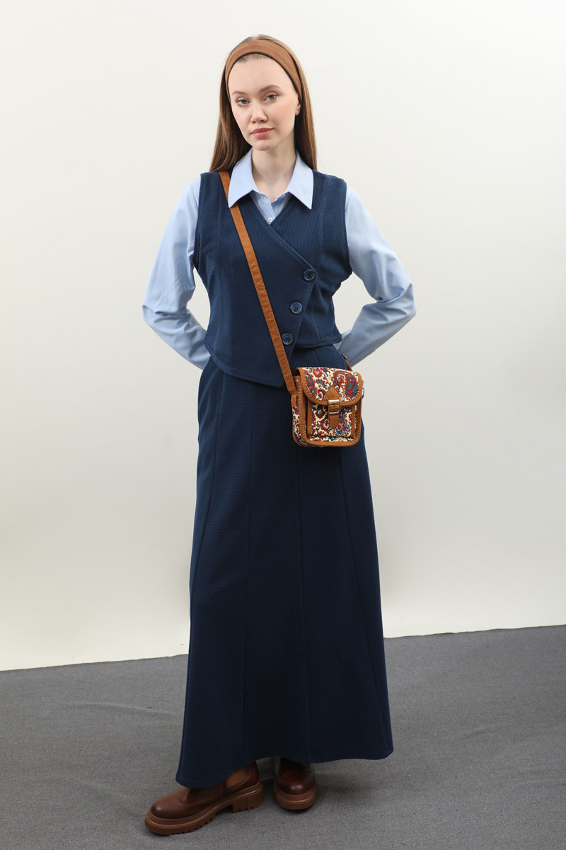 Kruvaze Yelekli Takım Lacivert. Asimetrik yelek takım, yelek tam kalıptır, tam kalıptır, kumaşı esnektir, eteği yandan ceplidir, belden lastiklidir, astarsızdır. Günlük kullanım ve özel günlerinizde tercih edebilirsiniz.