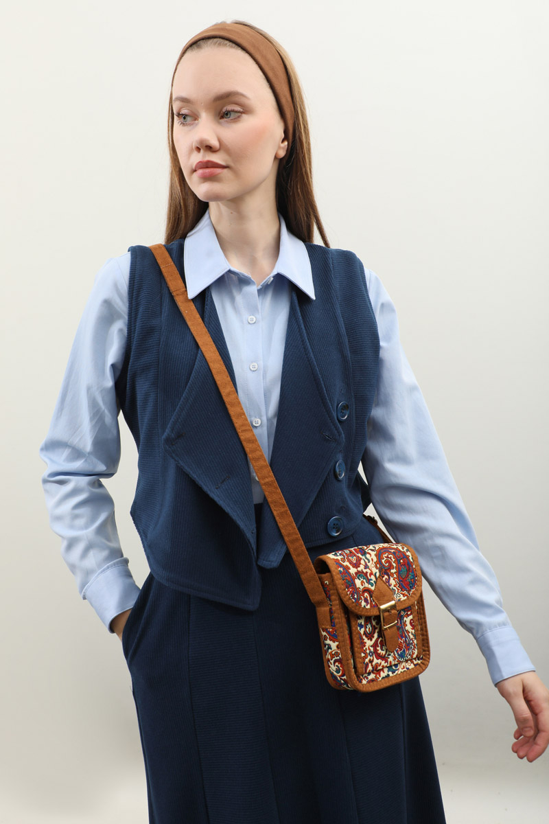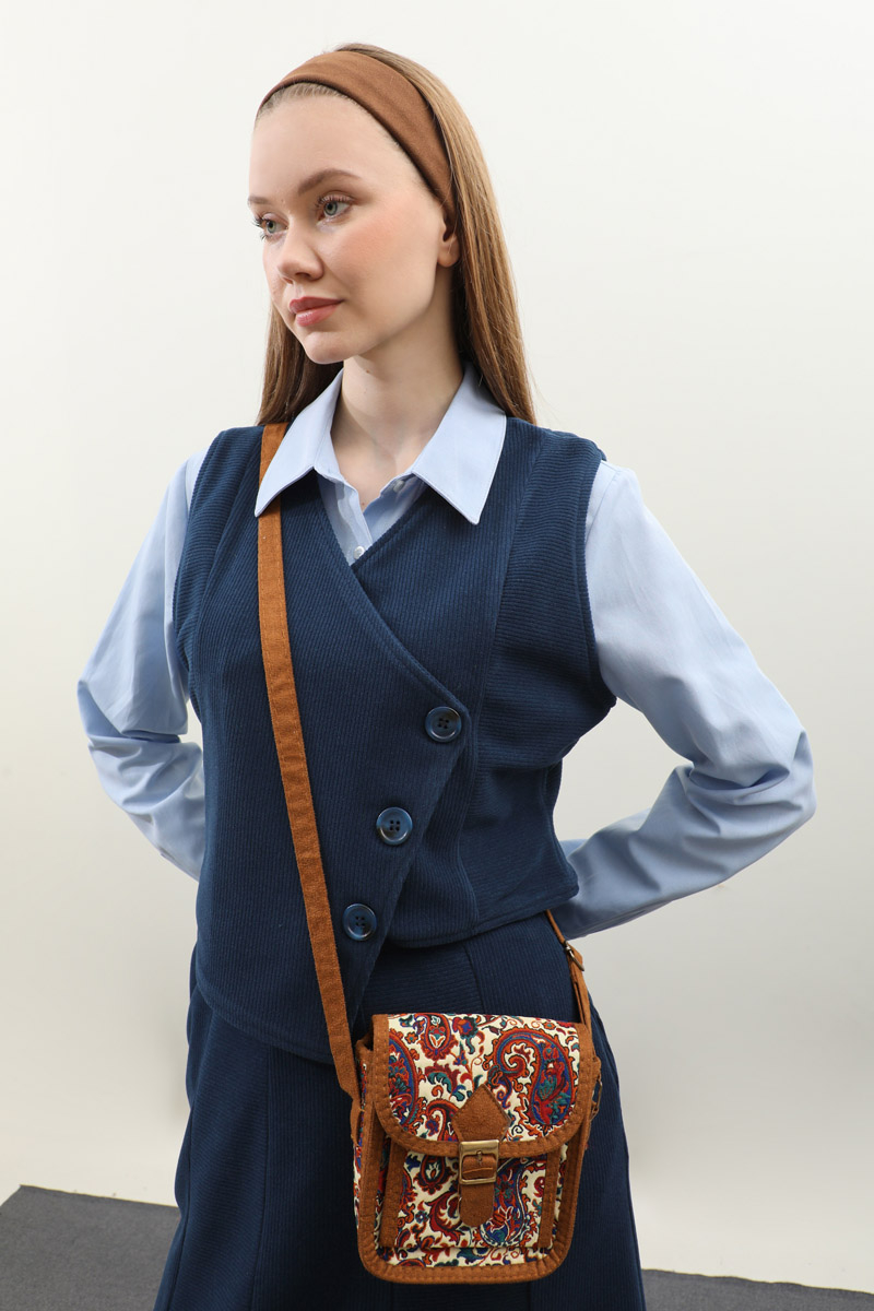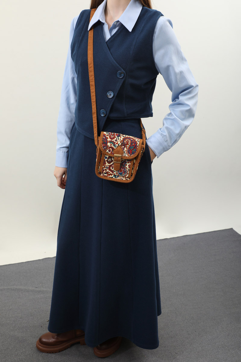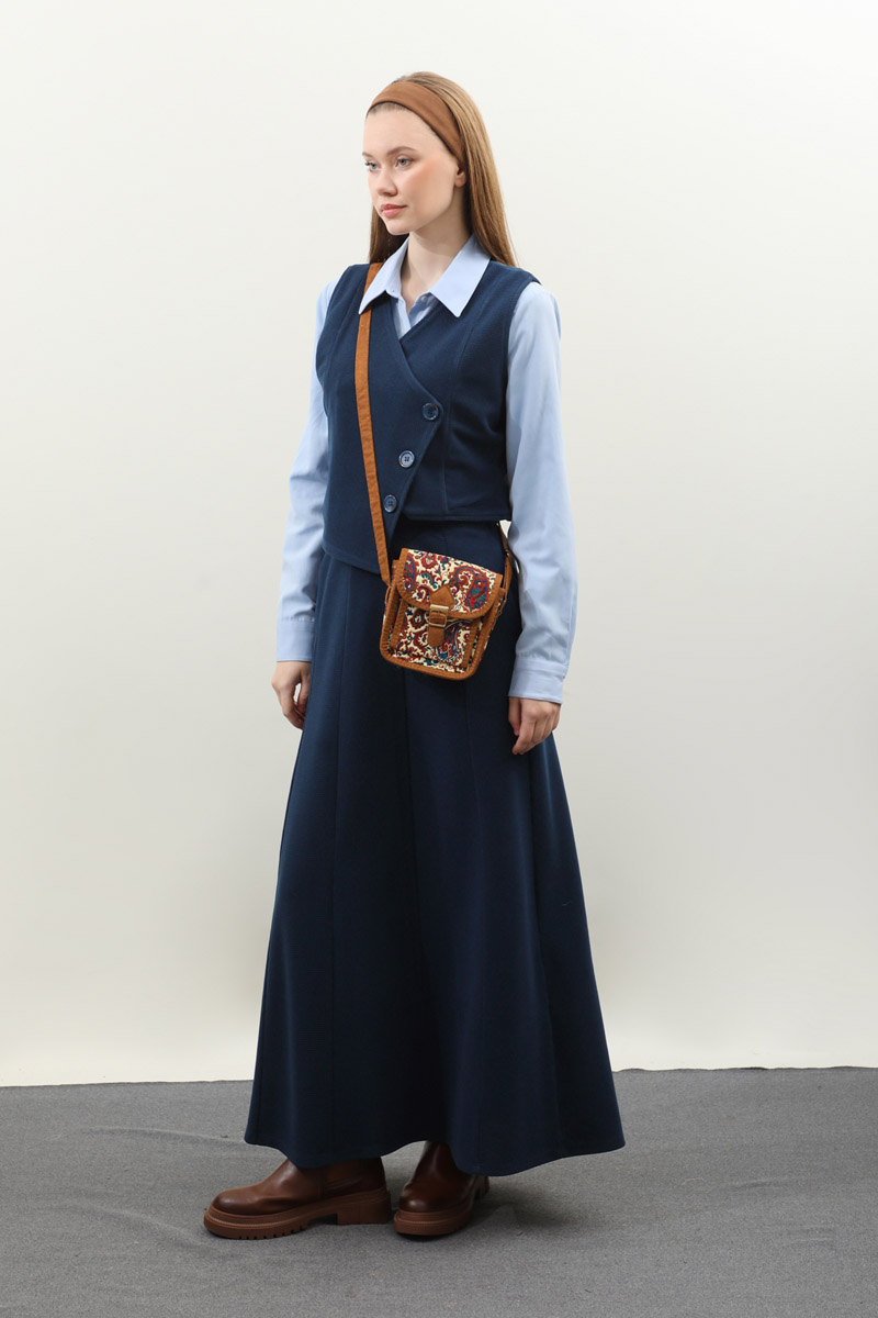 Kruvaze Yelekli Takım Lacivert. Asimetrik yelek takım, yelek tam kalıptır, tam kalıptır, kumaşı esnektir, eteği yandan ceplidir, belden lastiklidir, astarsızdır. Günlük kullanım ve özel günlerinizde tercih edebilirsiniz.