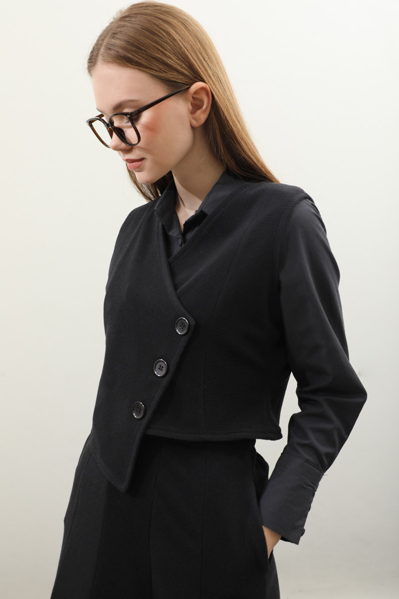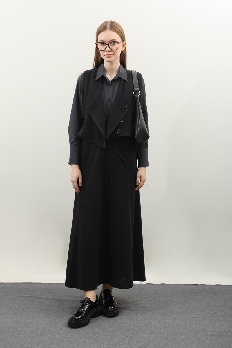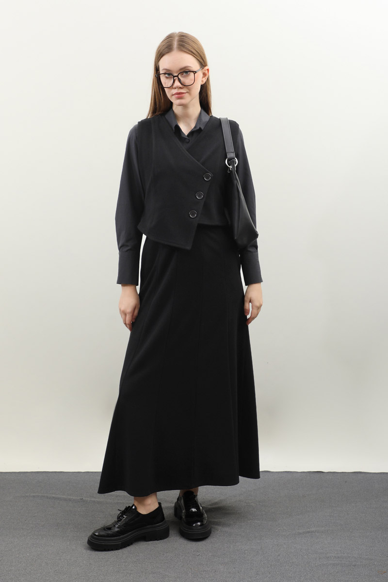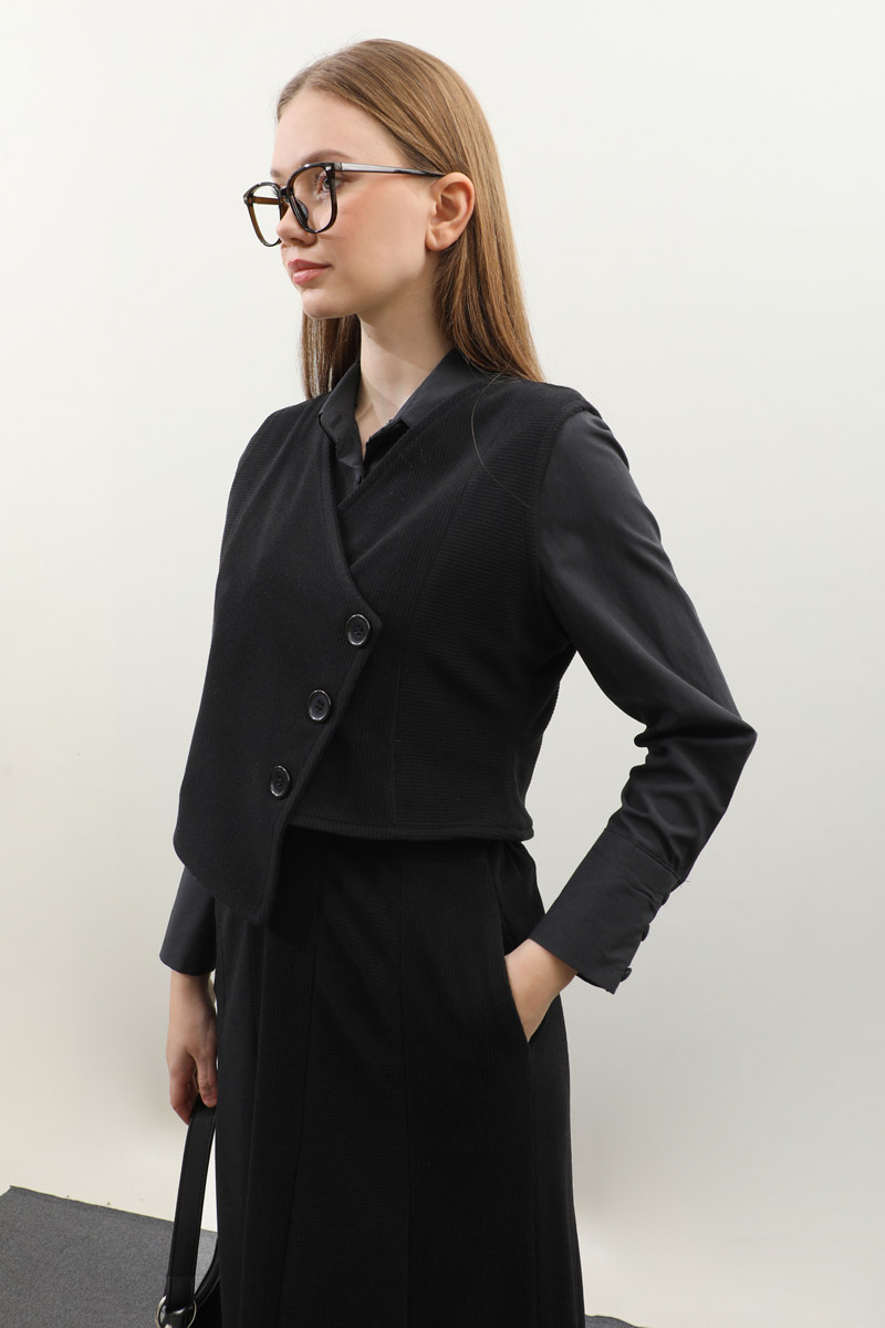 Kruvaze Yelekli Takım Siyah. Asimetrik yelek takım, yelek tam kalıptır, tam kalıptır, kumaşı esnektir, eteği yandan ceplidir, belden lastiklidir, astarsızdır. Günlük kullanım ve özel günlerinizde tercih edebilirsiniz.