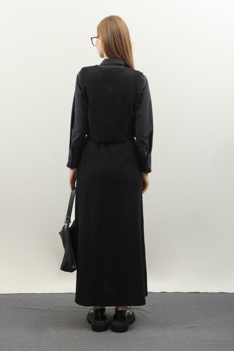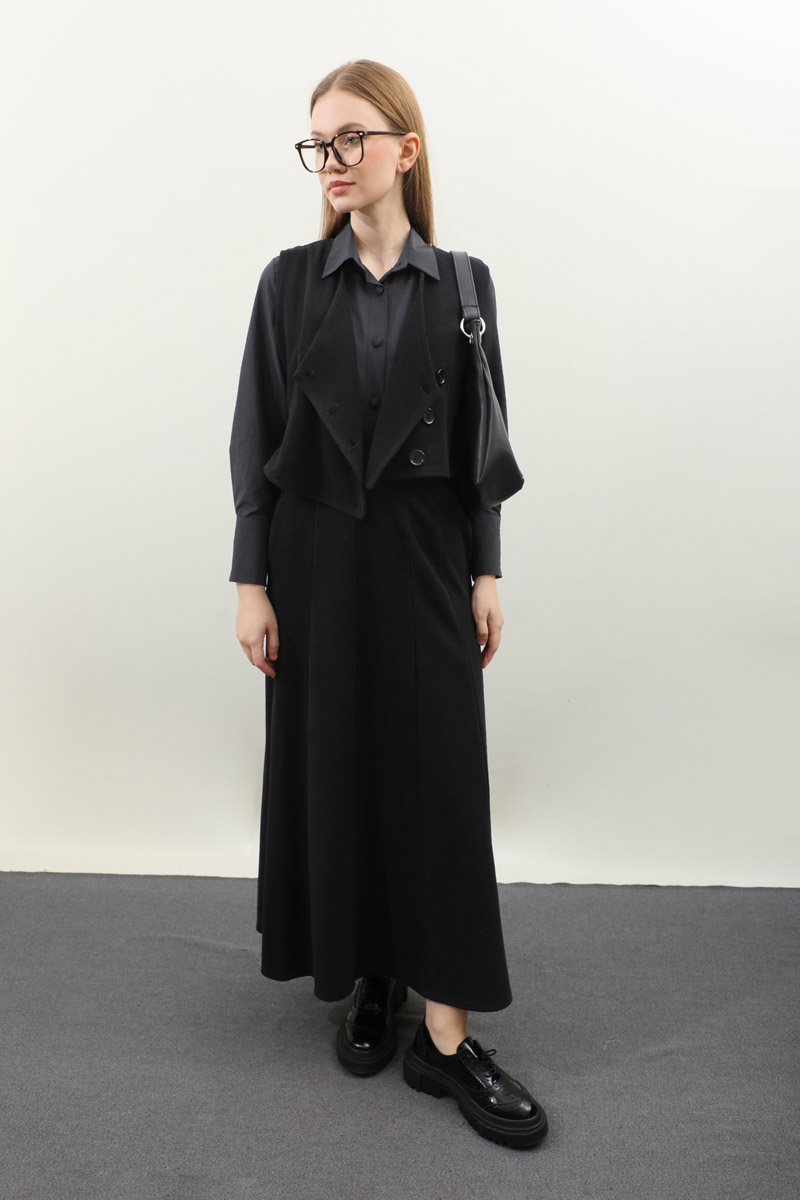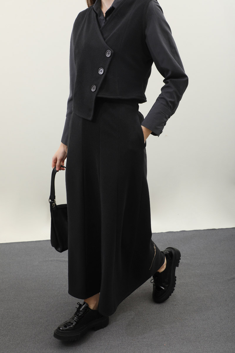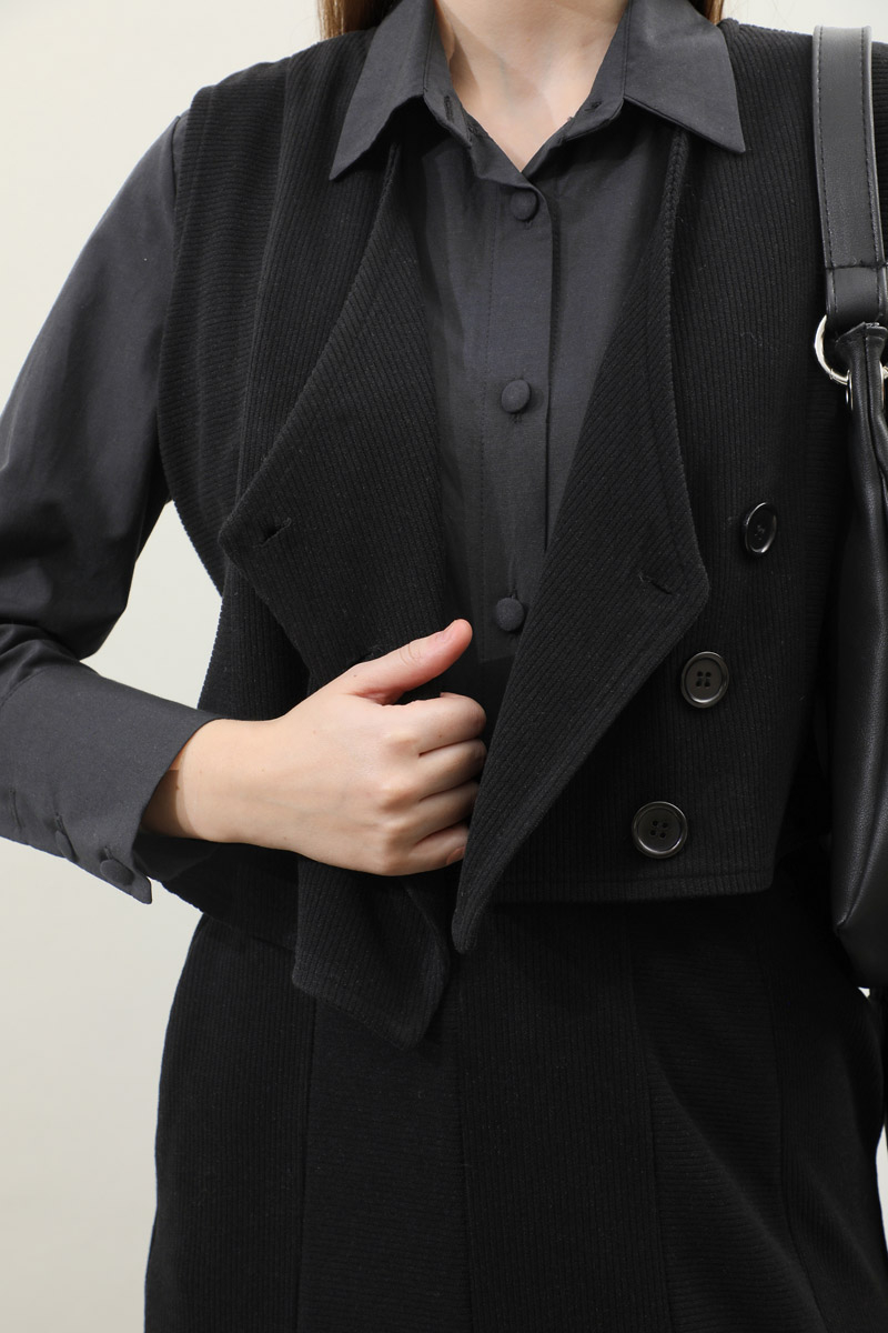 Kruvaze Yelekli Takım Siyah. Asimetrik yelek takım, yelek tam kalıptır, tam kalıptır, kumaşı esnektir, eteği yandan ceplidir, belden lastiklidir, astarsızdır. Günlük kullanım ve özel günlerinizde tercih edebilirsiniz.