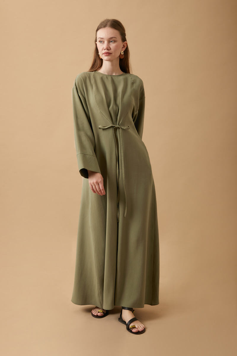 Kurdele Detaylı Elbise Haki. Bisiklet yakadır, önden kup parça dikiş detaylıdır, kurdele bağlama detaylıdır, düsük kolludur, kalın manşetlidir, yandan ceplidir, astarsızdır, Günlük kullanım ve özel günlerinizde tercih edebilirsiniz.