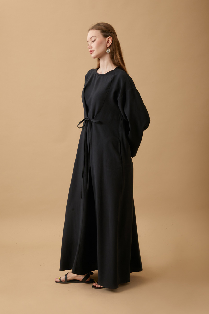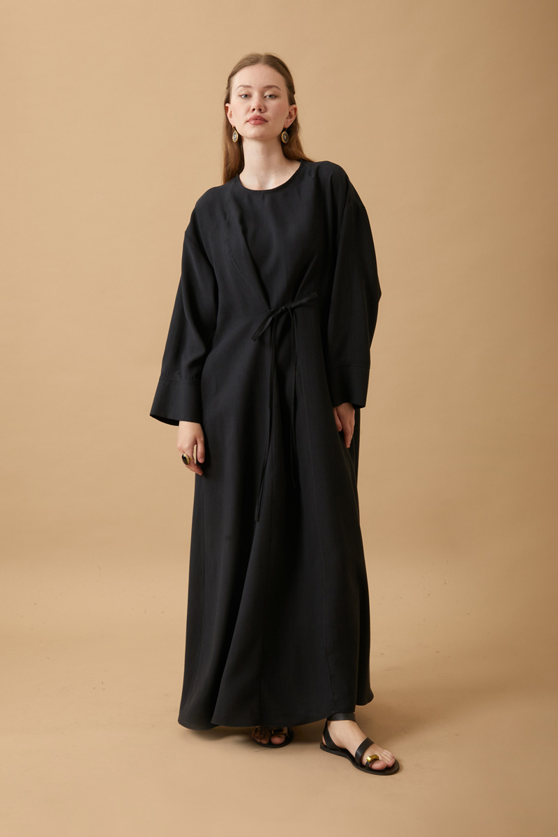 Kurdele Detaylı Elbise Siyah. Bisiklet yakadır, önden kup parça dikiş detaylıdır, kurdele bağlama detaylıdır, düsük kolludur, kalın manşetlidir, yandan ceplidir, astarsızdır, Günlük kullanım ve özel günlerinizde tercih edebilirsiniz.