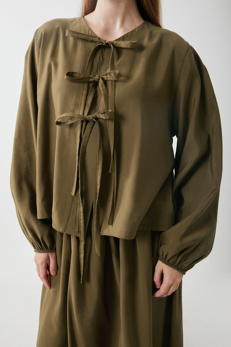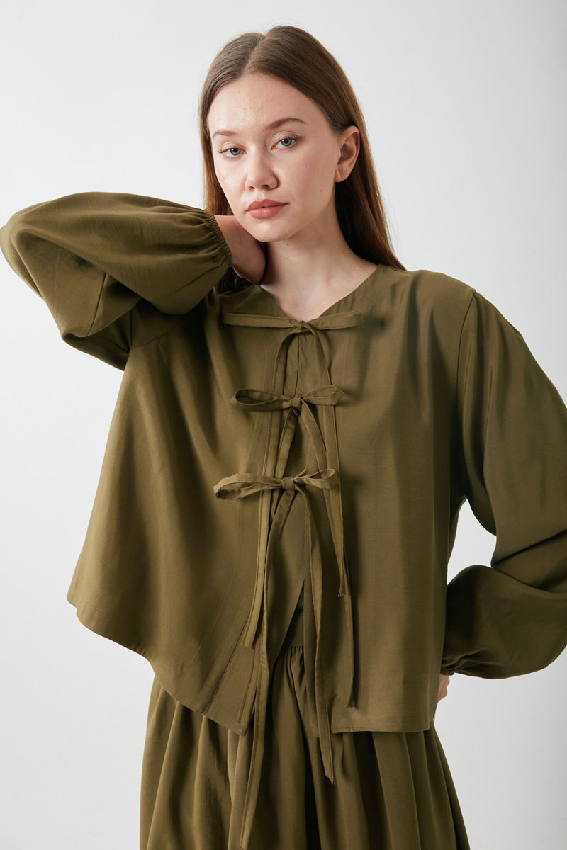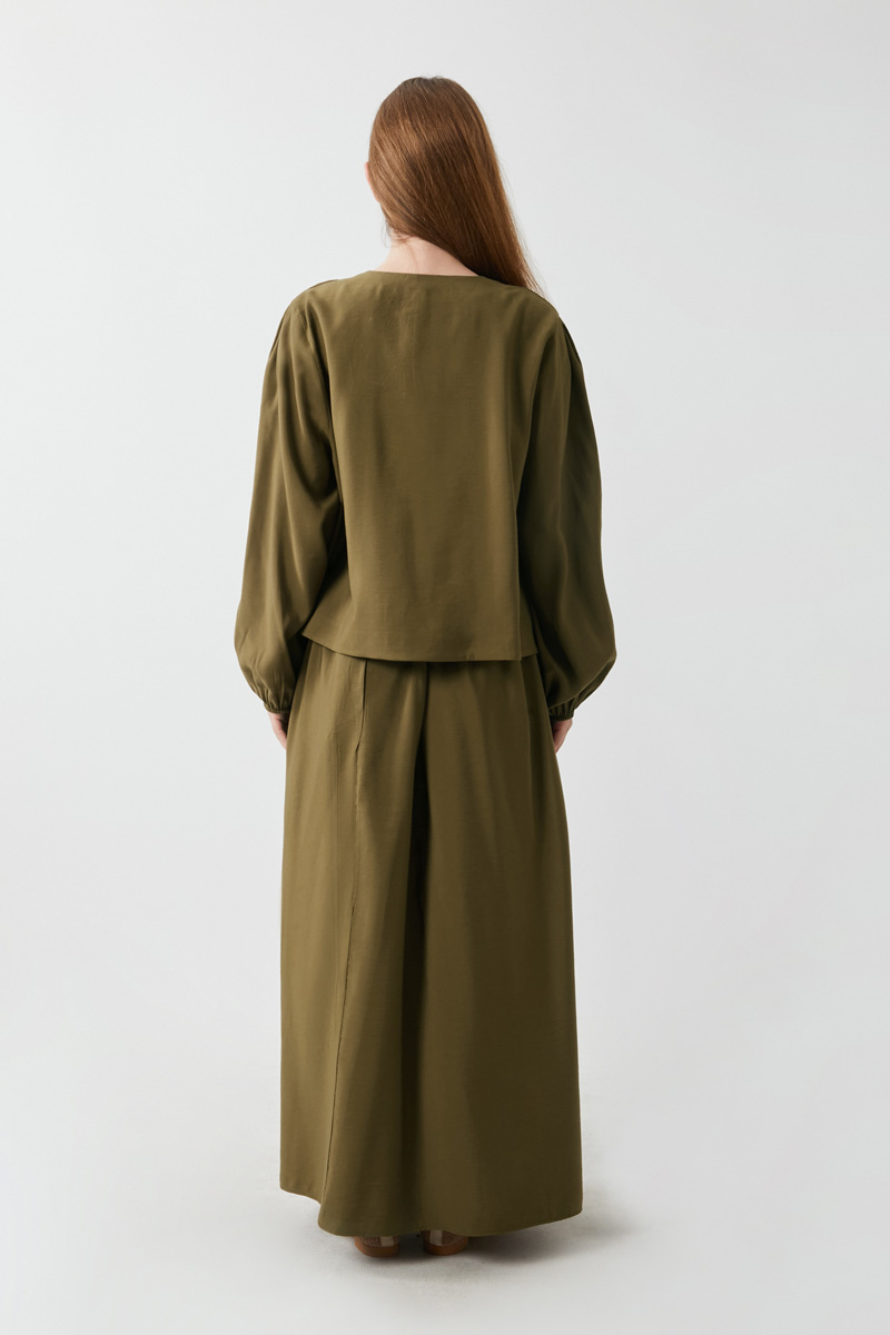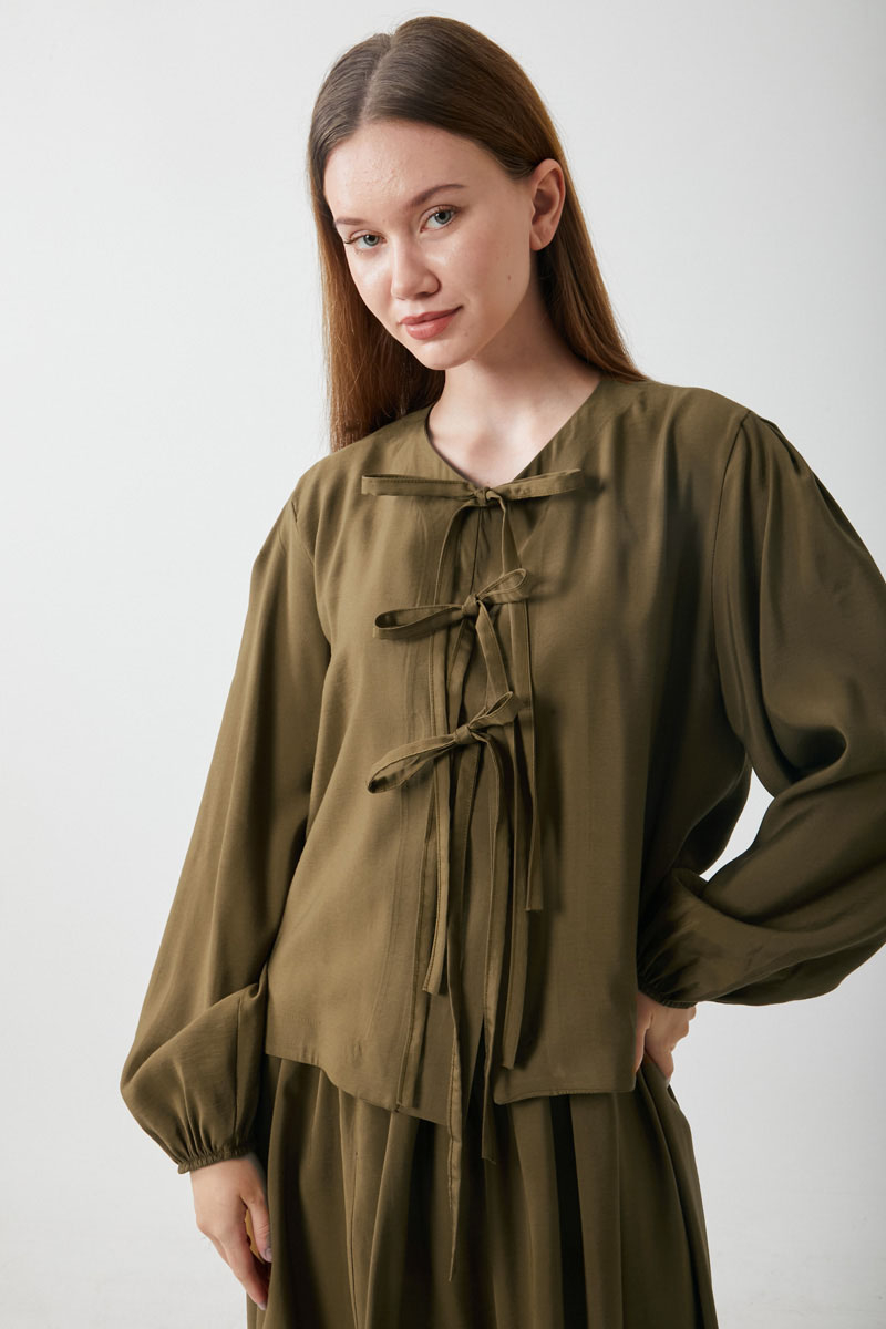 Kurdele Detaylı Etek Takım Koyu Bronz. Bisiklet yakadır, bluzu önden kurdele bağlama detaylıdır, kol üstü pilikaşe detaylıdır, kol ucu lastiklidir, Etek beli büzgülü arkadan fermuarlıdır, önden pilelidir, yandan ceplidir, Günlük kullanım ve özel günlerinizde tercih edebilirsiniz.