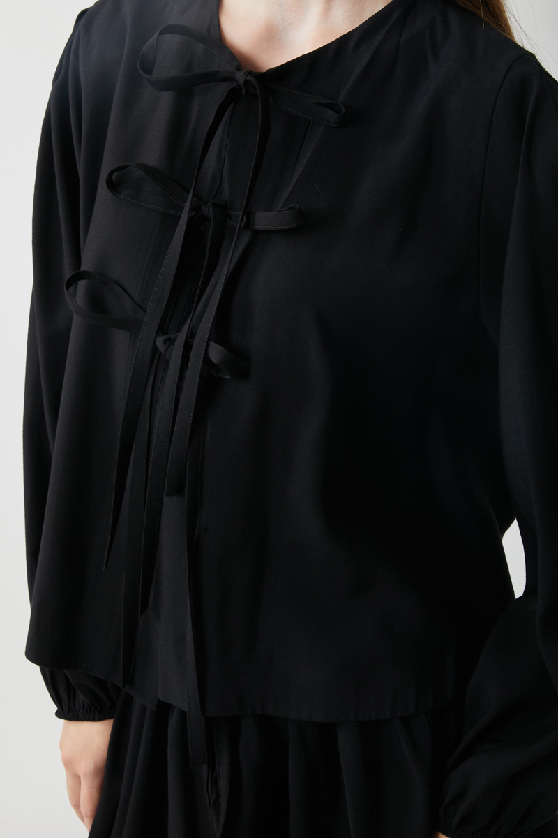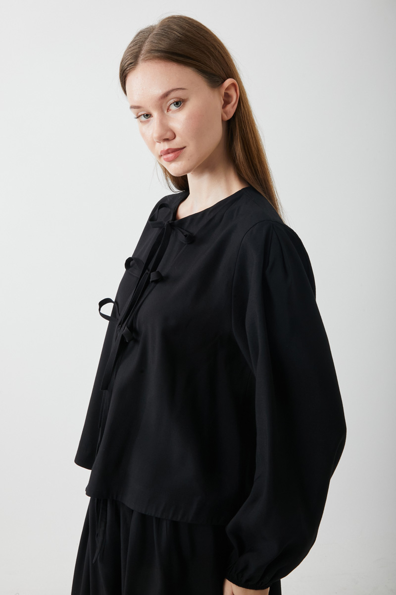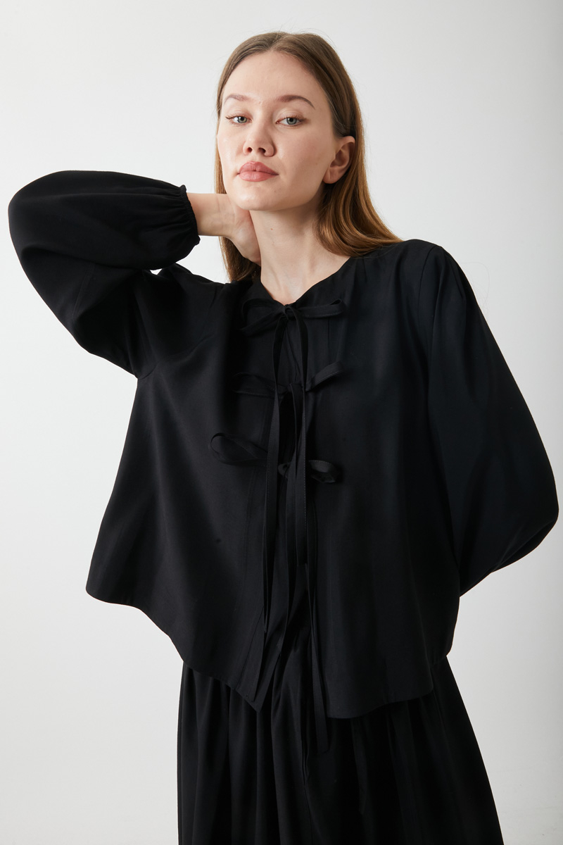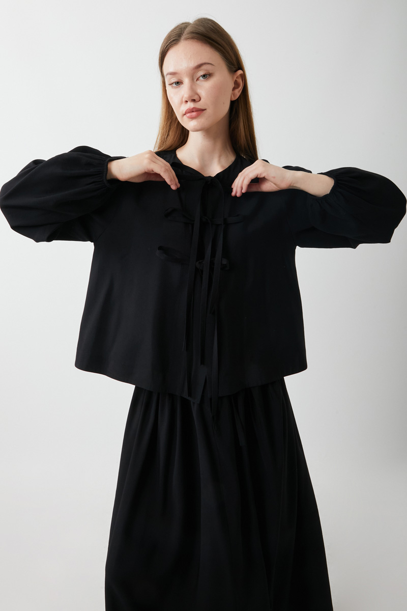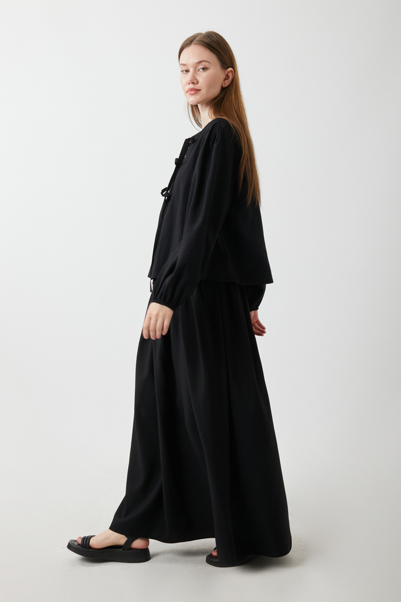 Kurdele Detaylı Etek Takım Siyah. Bisiklet yakadır, bluzu önden kurdele bağlama detaylıdır, kol üstü pilikaşe detaylıdır, kol ucu lastiklidir, Etek beli büzgülü arkadan fermuarlıdır, önden pilelidir, yandan ceplidir, Günlük kullanım ve özel günlerinizde tercih edebilirsiniz.