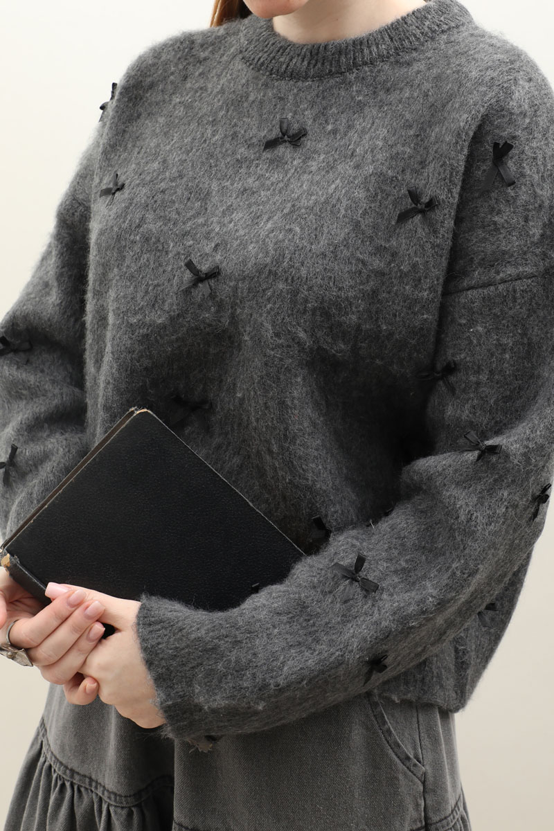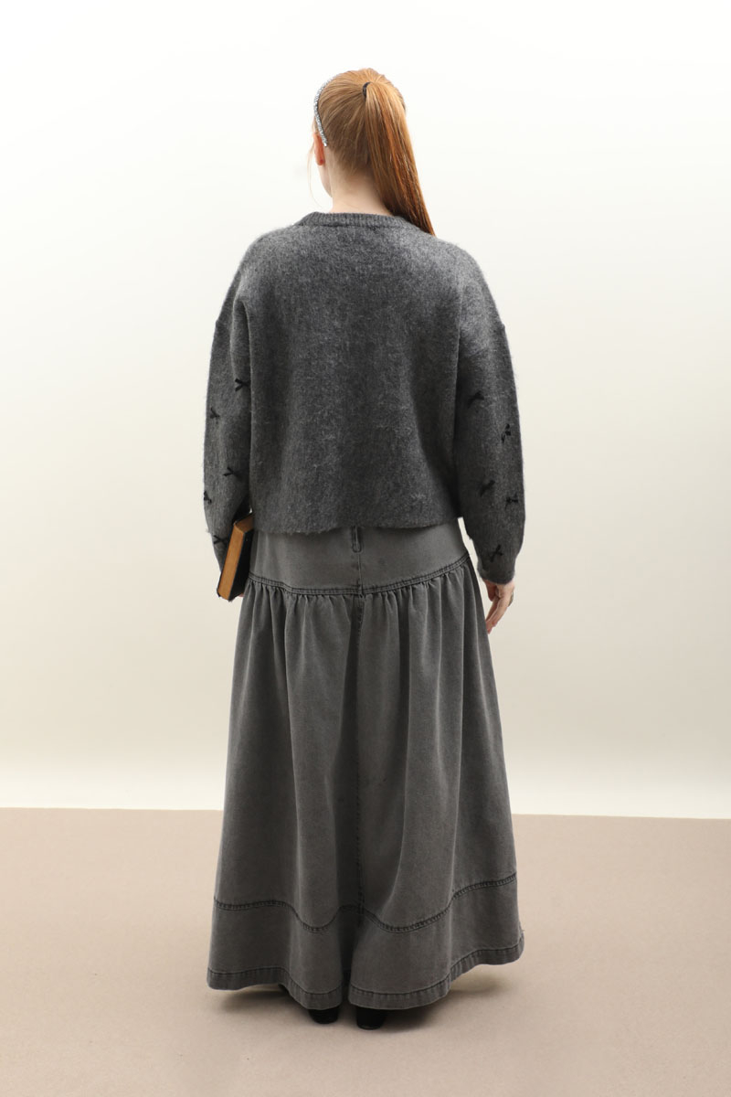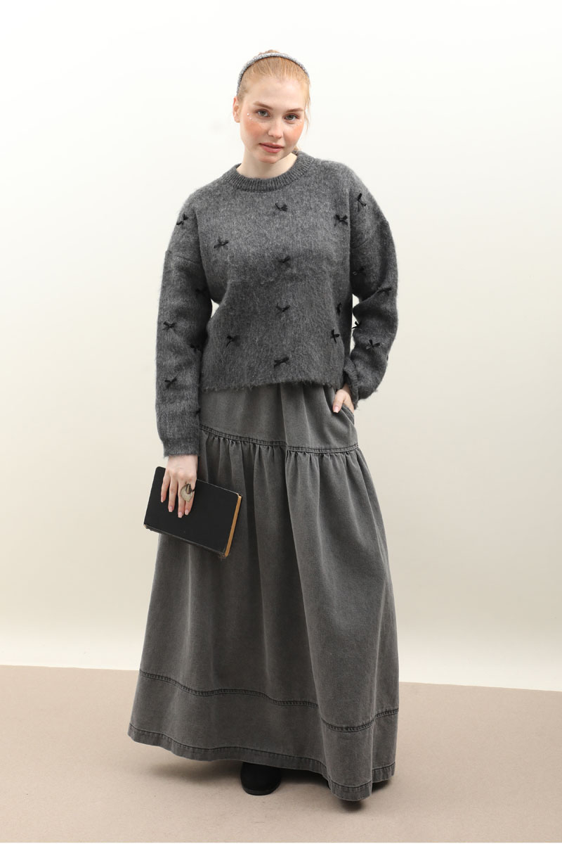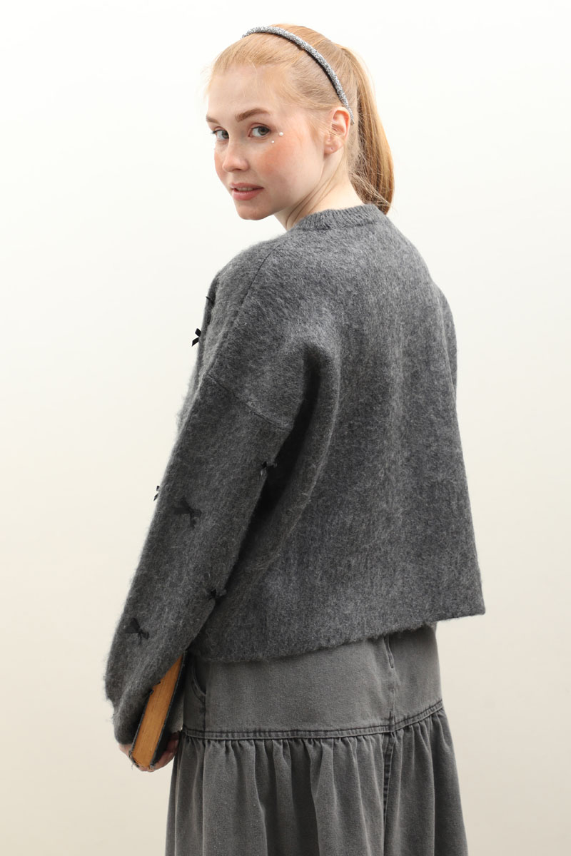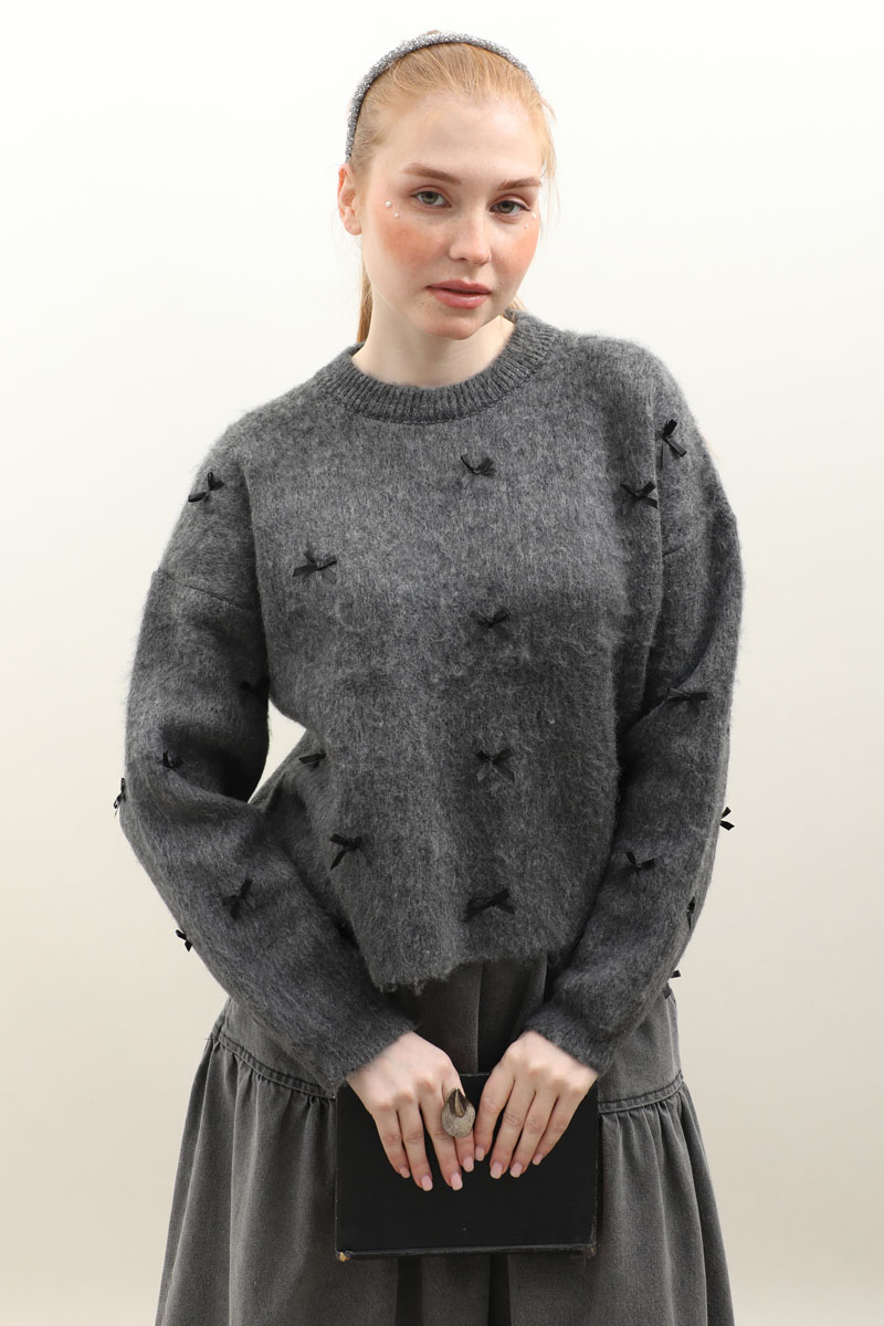 Kurdeleli Kazak Antrasit. Bisiklet yaka, düşük omuzlu, yakası ve manşeti ribanalıdır. küçük kurdele detaylıdır, Etek, elbise ve pantolon üzerine tercih edilebilir. Kış aylarında tercih edebilirsiniz.