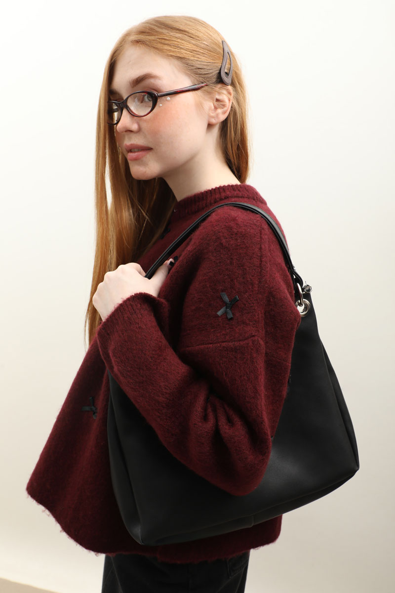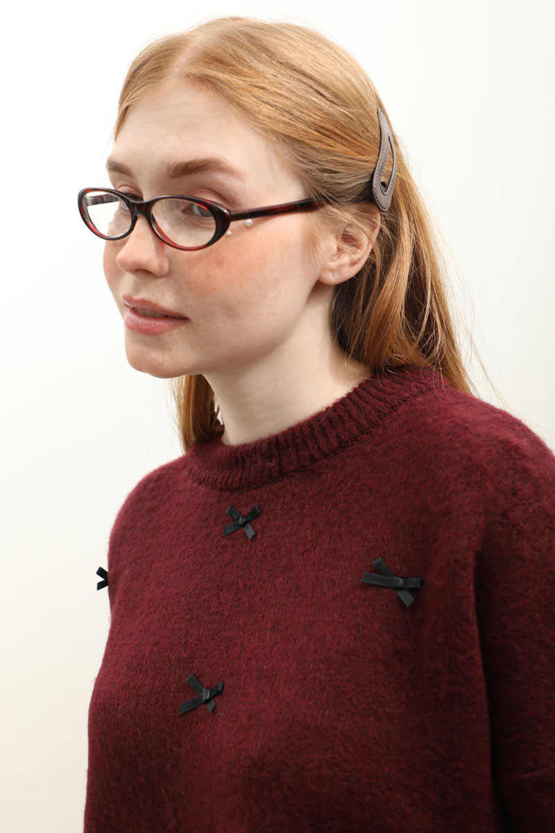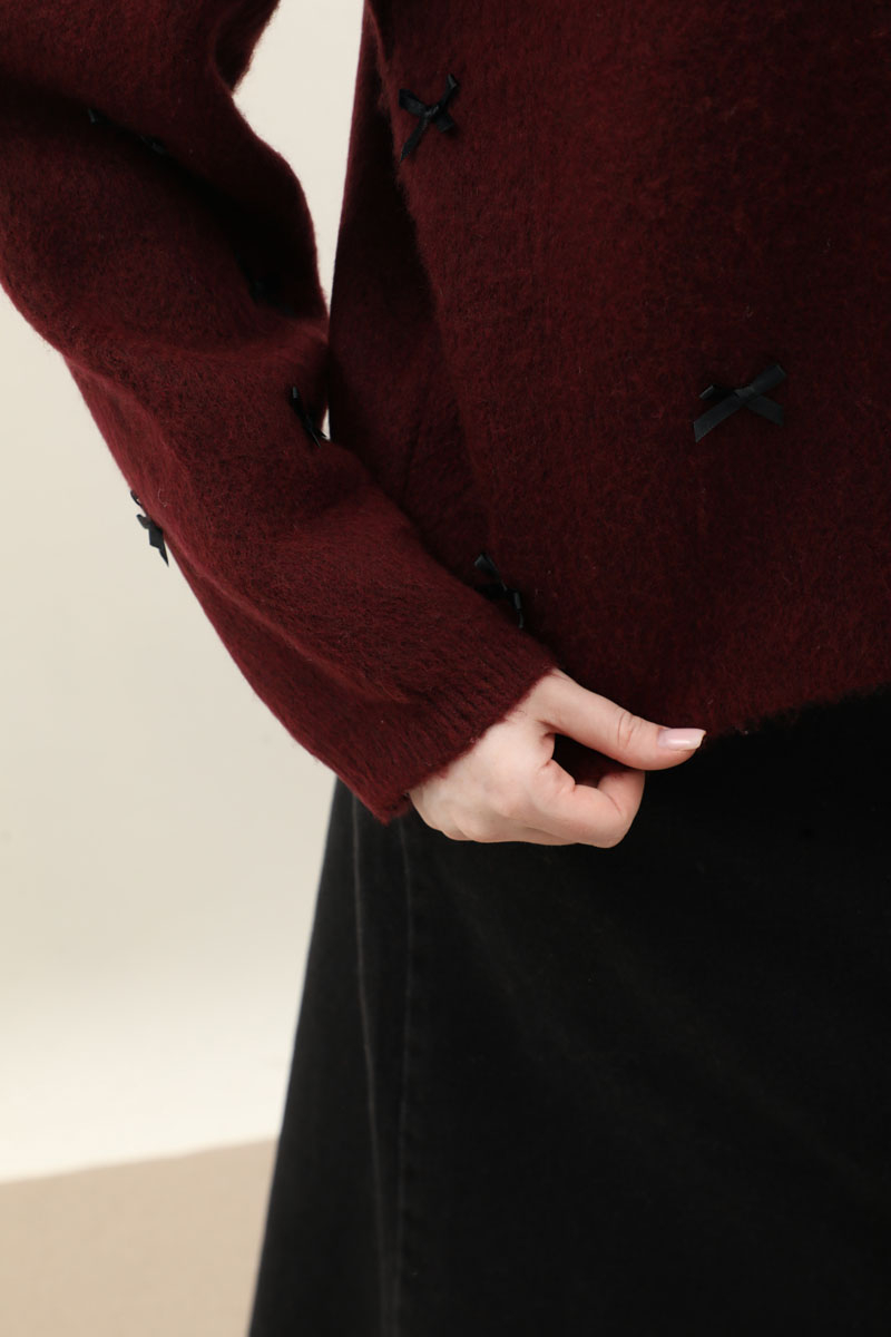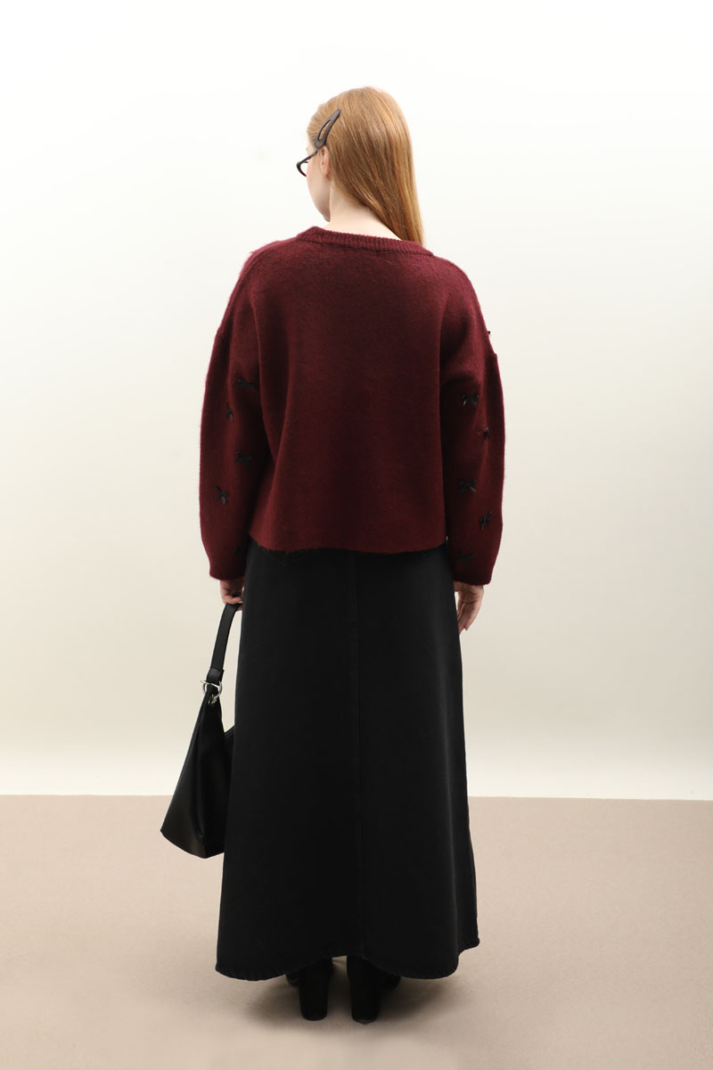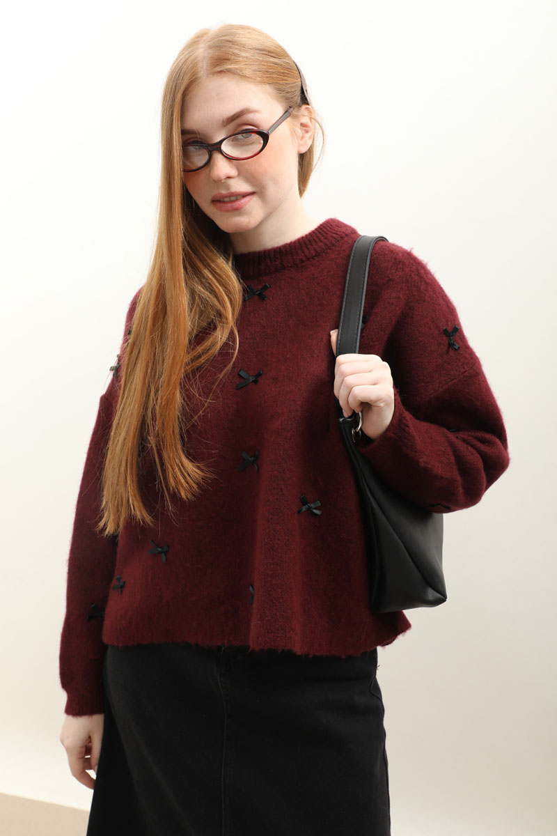 Kurdeleli Kazak Bordo. Bisiklet yaka, düşük omuzlu, yakası ve manşeti ribanalıdır. küçük kurdele detaylıdır, Etek, elbise ve pantolon üzerine tercih edilebilir. Kış aylarında tercih edebilirsiniz.