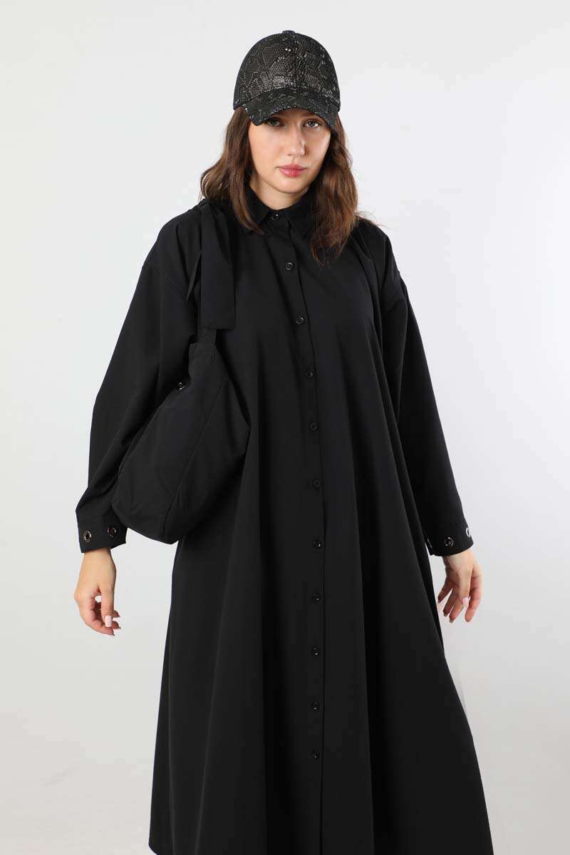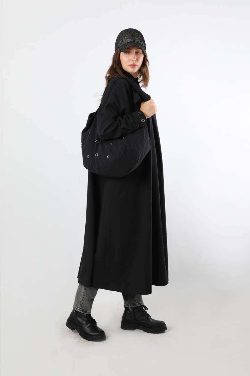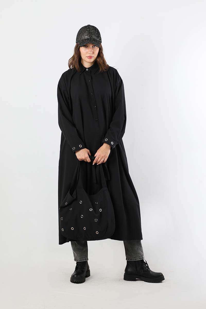 Kuş Gözü Çantalı Tunik Elbise Siyah. Gömlek yakalıdır. Manşeti kuş gözü detaylıdır. Düğmelidir. Kuş gözü detaylı çanta ile birlikte satılmaktadır. Günlük kullanım ve özel günlerinizde tercih edebilirsiniz.