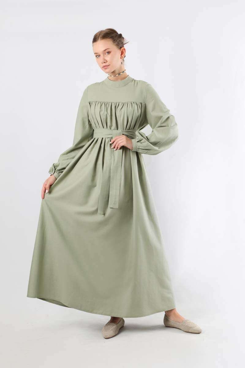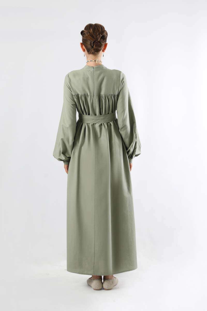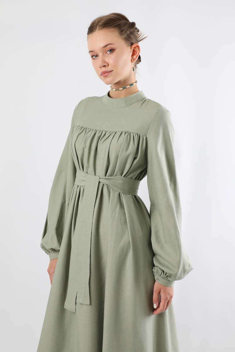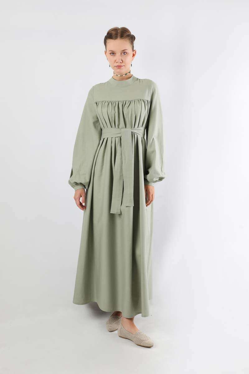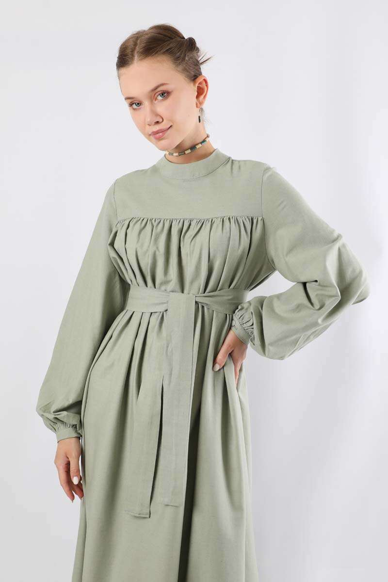 Kuşaklı Büzgülü Elbise Mint. Dik yakalıdır. Roba detaylıdır ve robasından başlayan büzgü detayı mevcuttur. Balon kolludur. Manşeti büzgülüdür ve kaplama düğmelidir. Kuşaklıdır. Şık olan ürüne özel günlerinizde tercih edebilirsiniz.