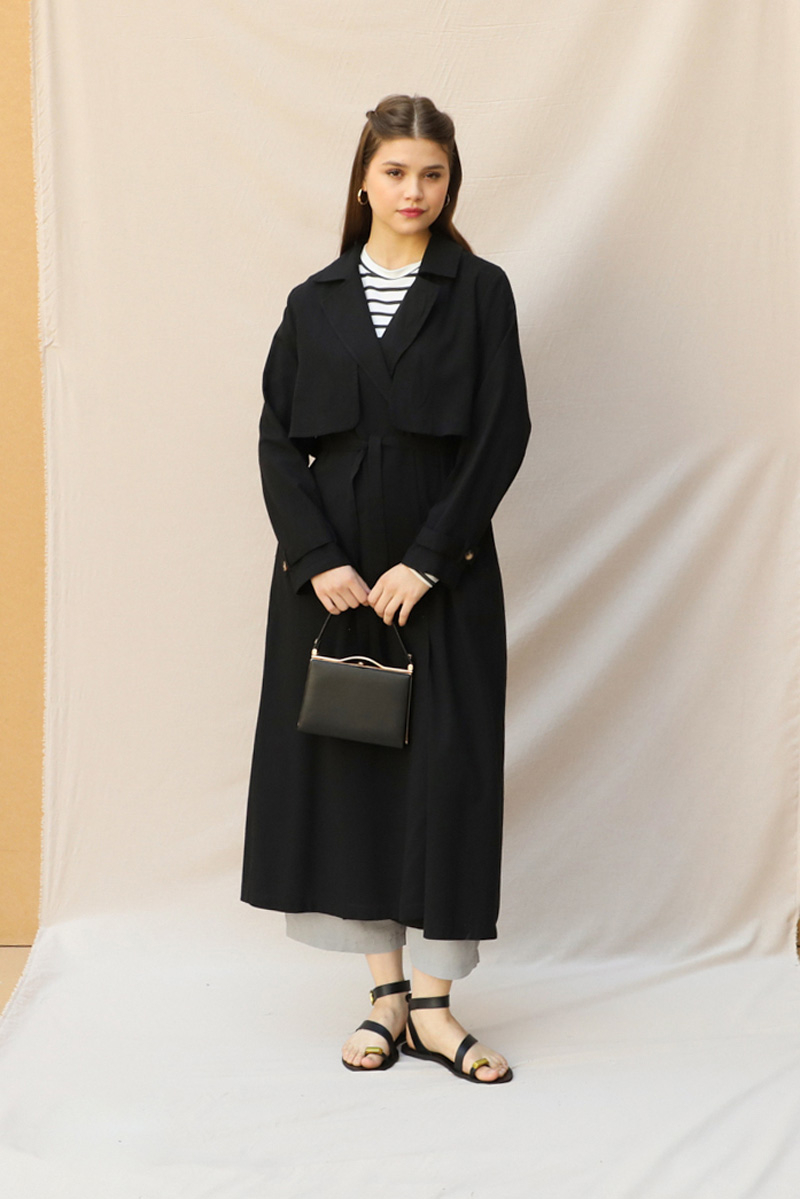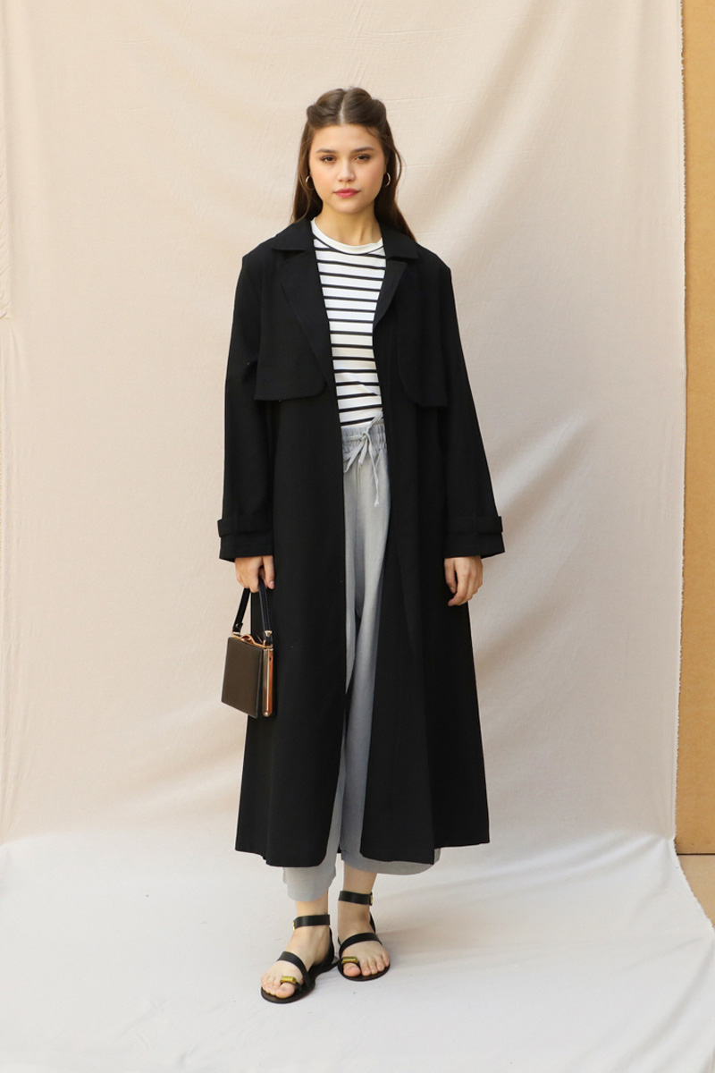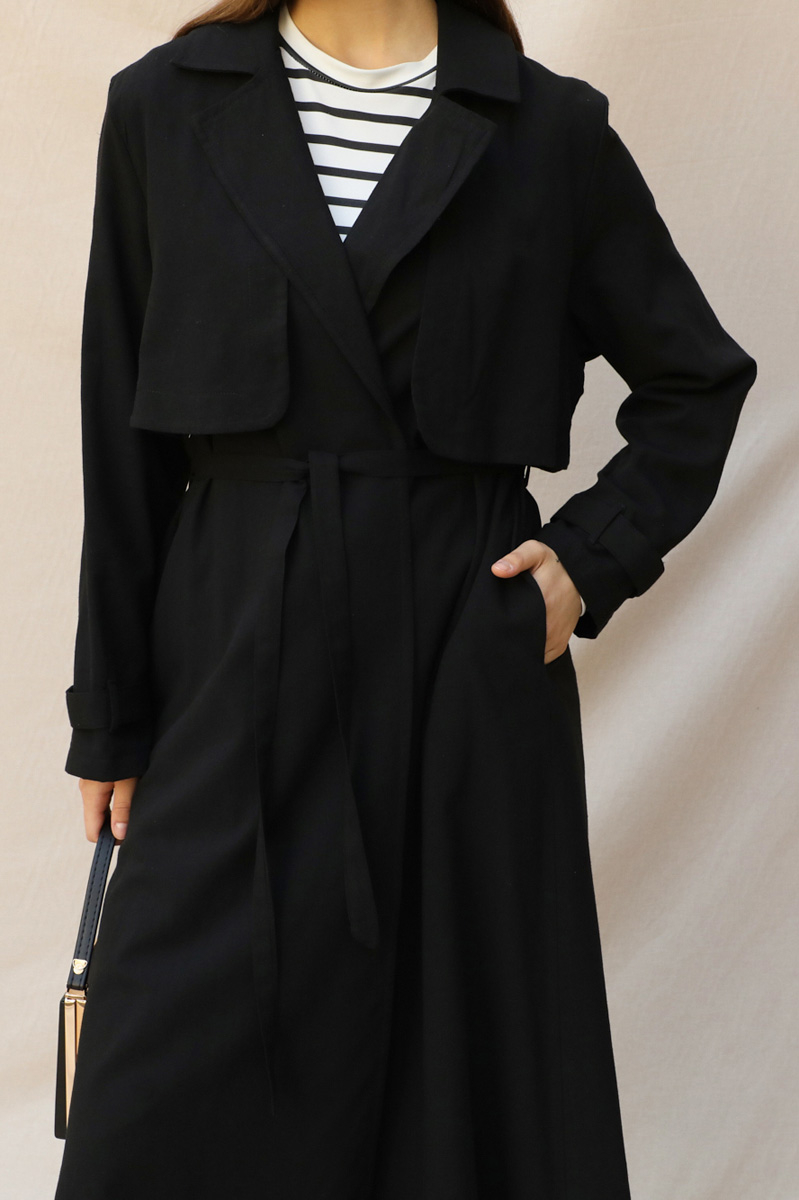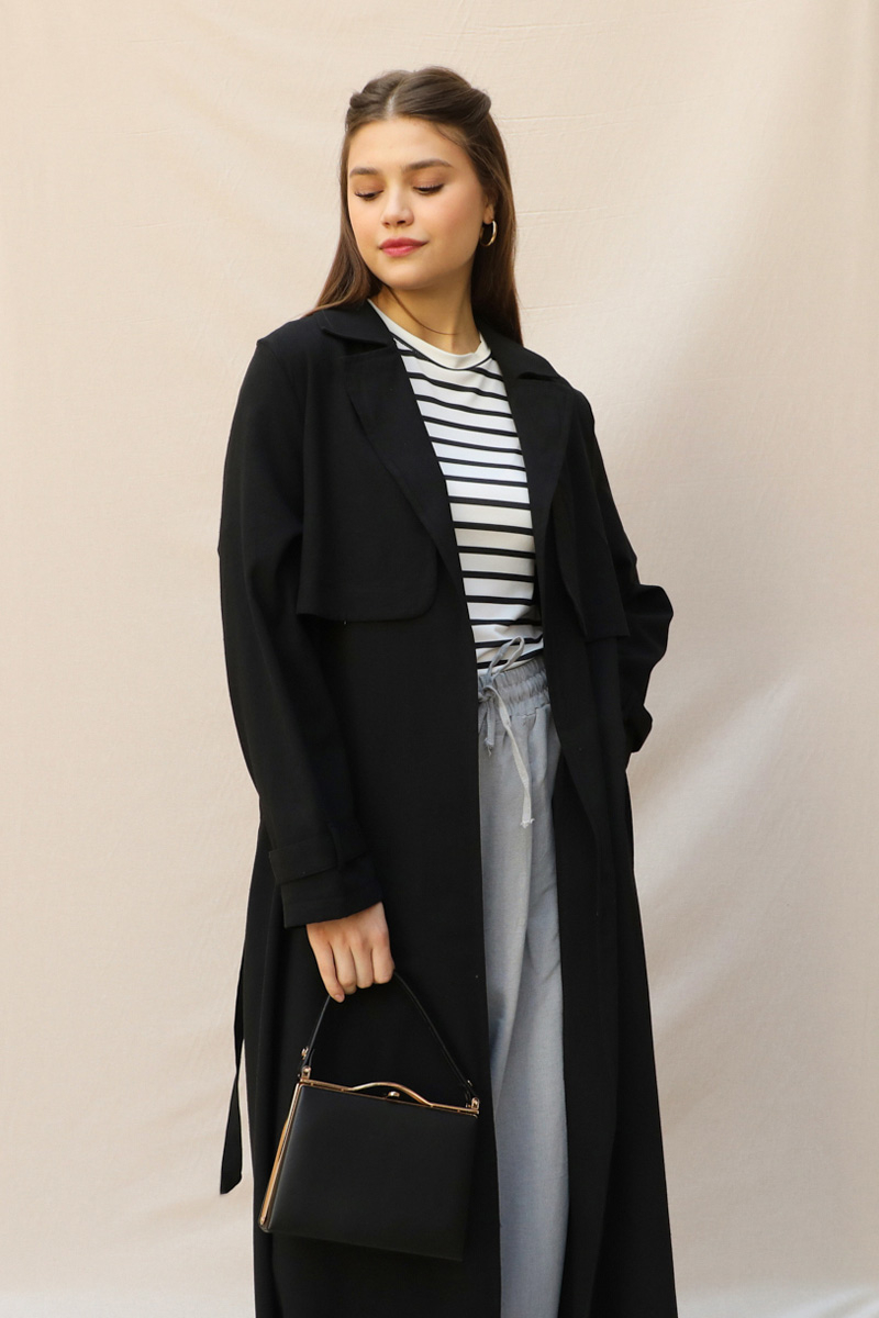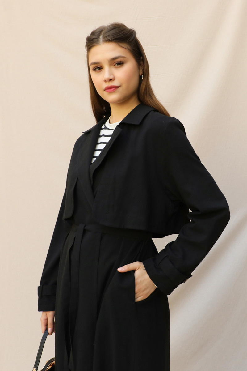 Kuşaklı Uzun Naturel Trençkot Siyah