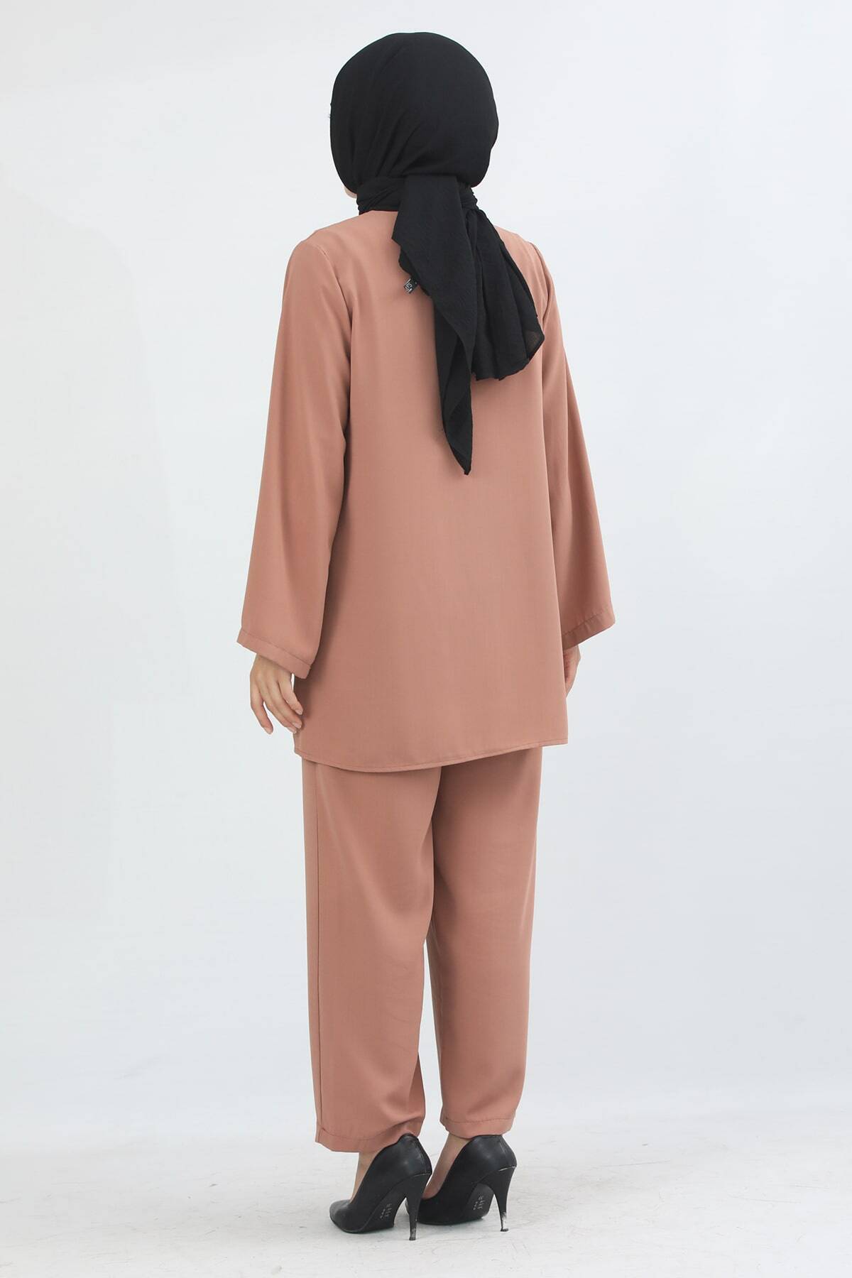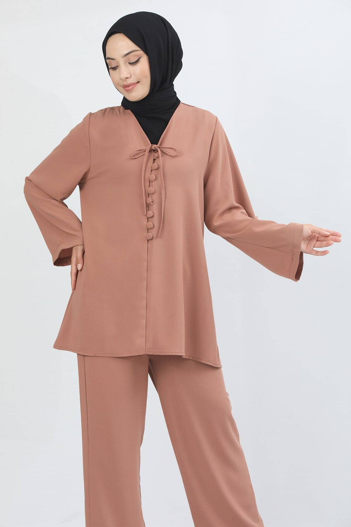 It is a set consisting of two pieces, trousers and tunic. The tunic is V-neck, lace detail and front brilet button fastening. Thanks to its comfortable and flexible structure, it is wrinkle resistant and breathable. It is suitable for frequent and long-term use with its non-weight fabric feature.