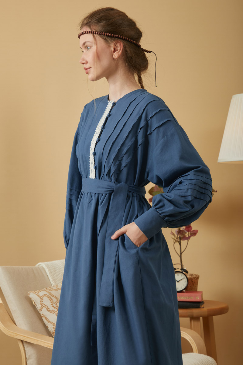 Perfect for vintage lovers, this elegant and minimal design is crafted from natural linen-blend fabric. The lace and pintuck details on the front add a nostalgic, romantic touch, while the flowy silhouette offers comfort throughout the day.