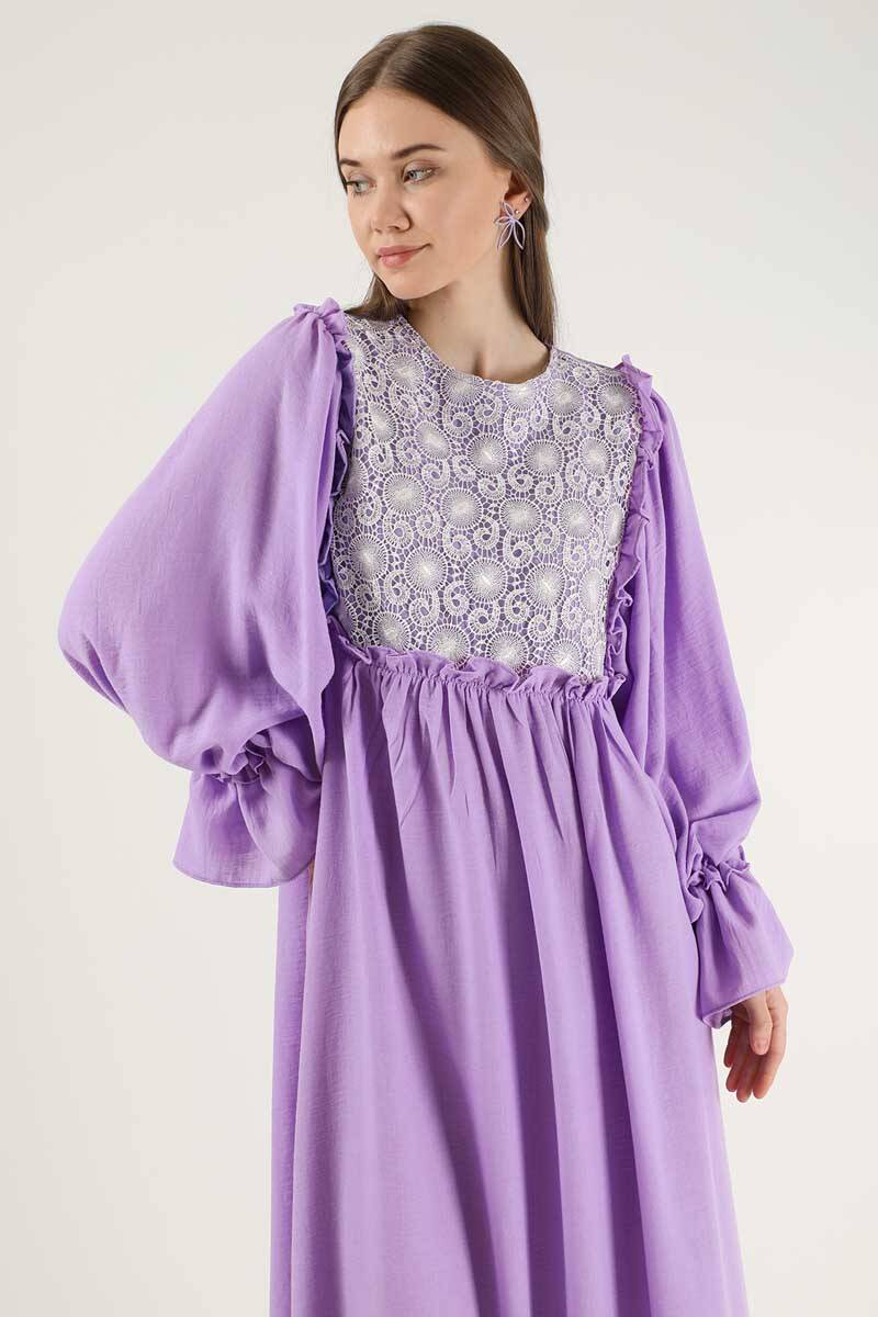 Lace Detail Frilly Dress Lilac. Lace Detailed. The shoulder is ruffled from the front body. The cuff is flywheel. There is a ruffle detail on the back yoke. It has a back zipper. It is unlined (does not show inside). It's a normal pattern. You can choose it for your daily use and special days.