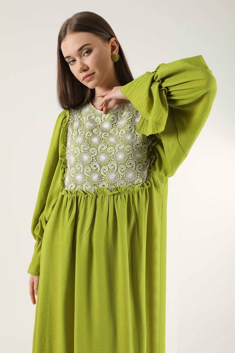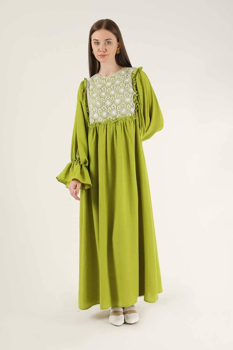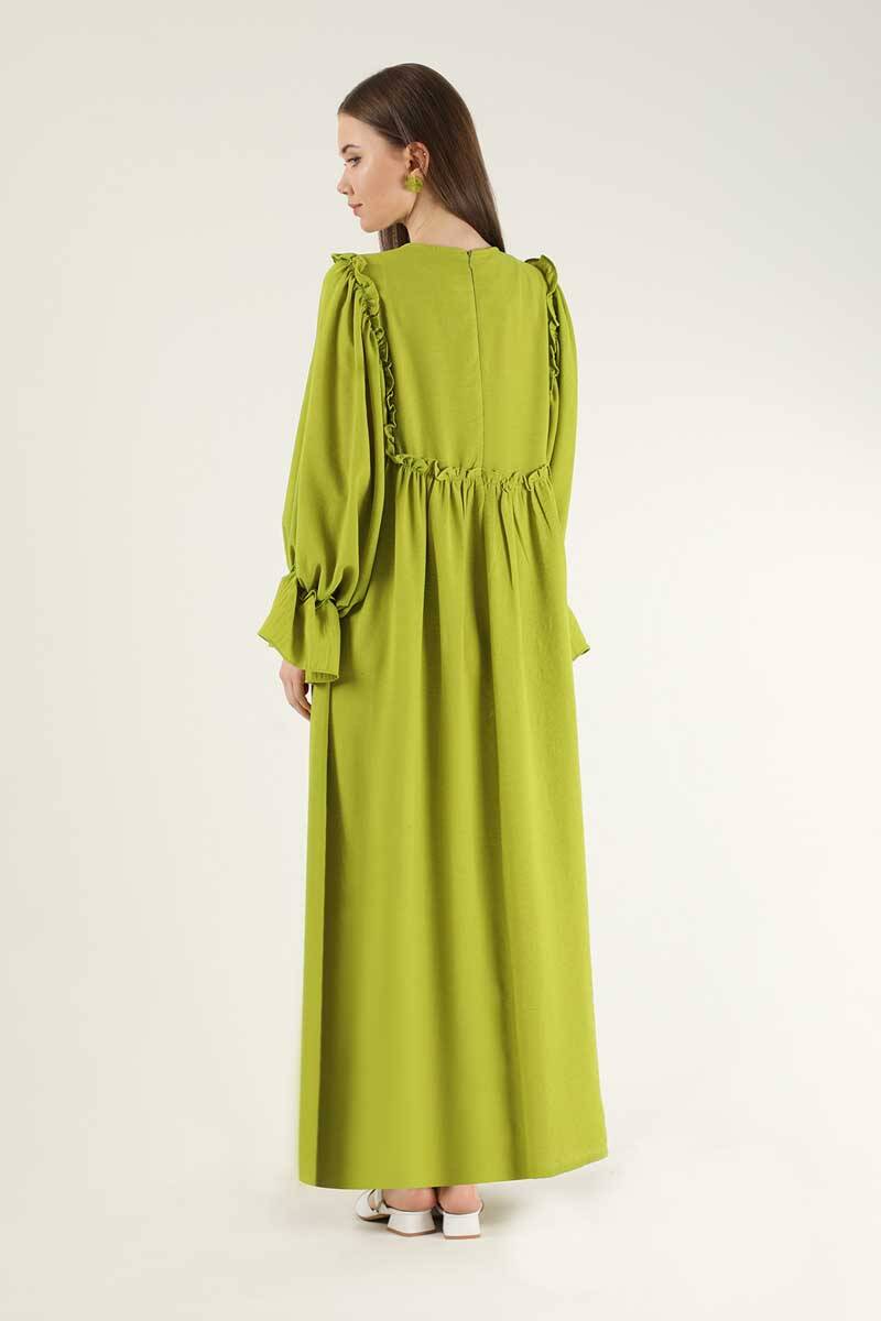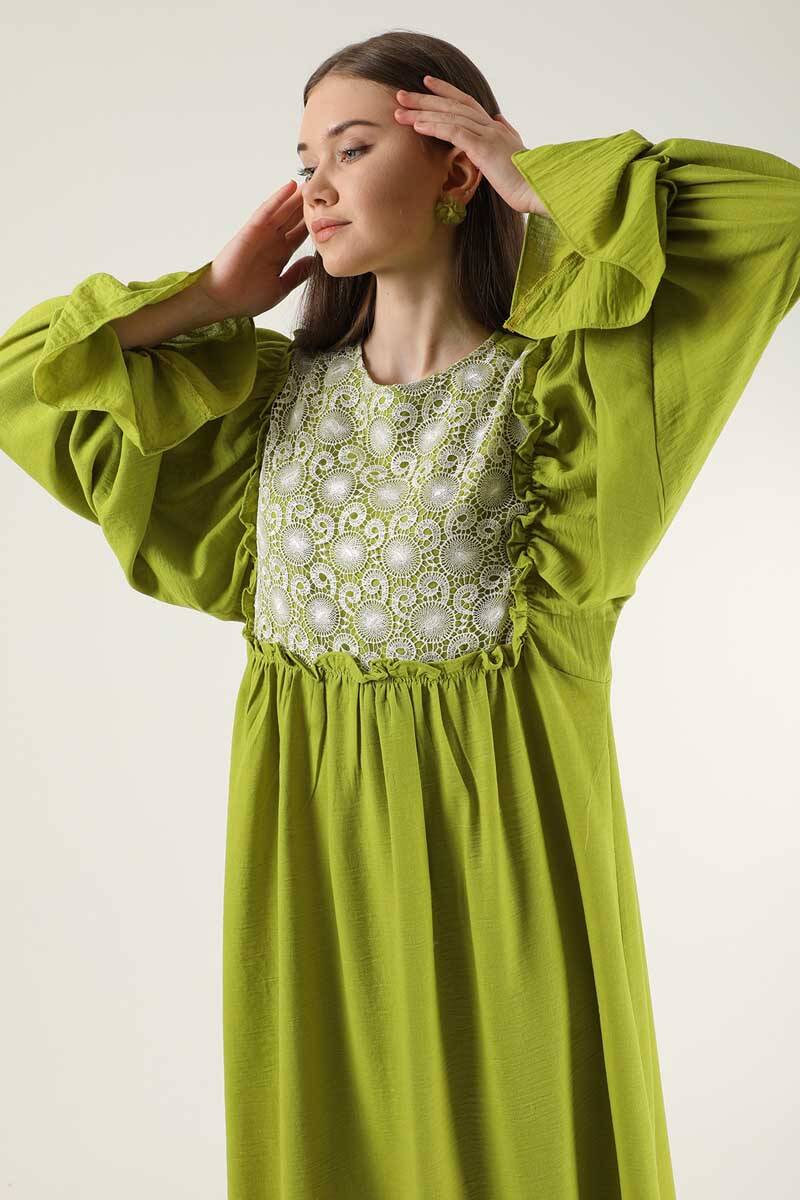 Lace Detail Frilly Dress Pistachio Green. Lace Detailed. The shoulder is ruffled from the front body. The cuff is flywheel. There is a ruffle detail on the back yoke. It has a back zipper. It is unlined (does not show inside). It's a normal pattern. You can choose it for your daily use and special days.