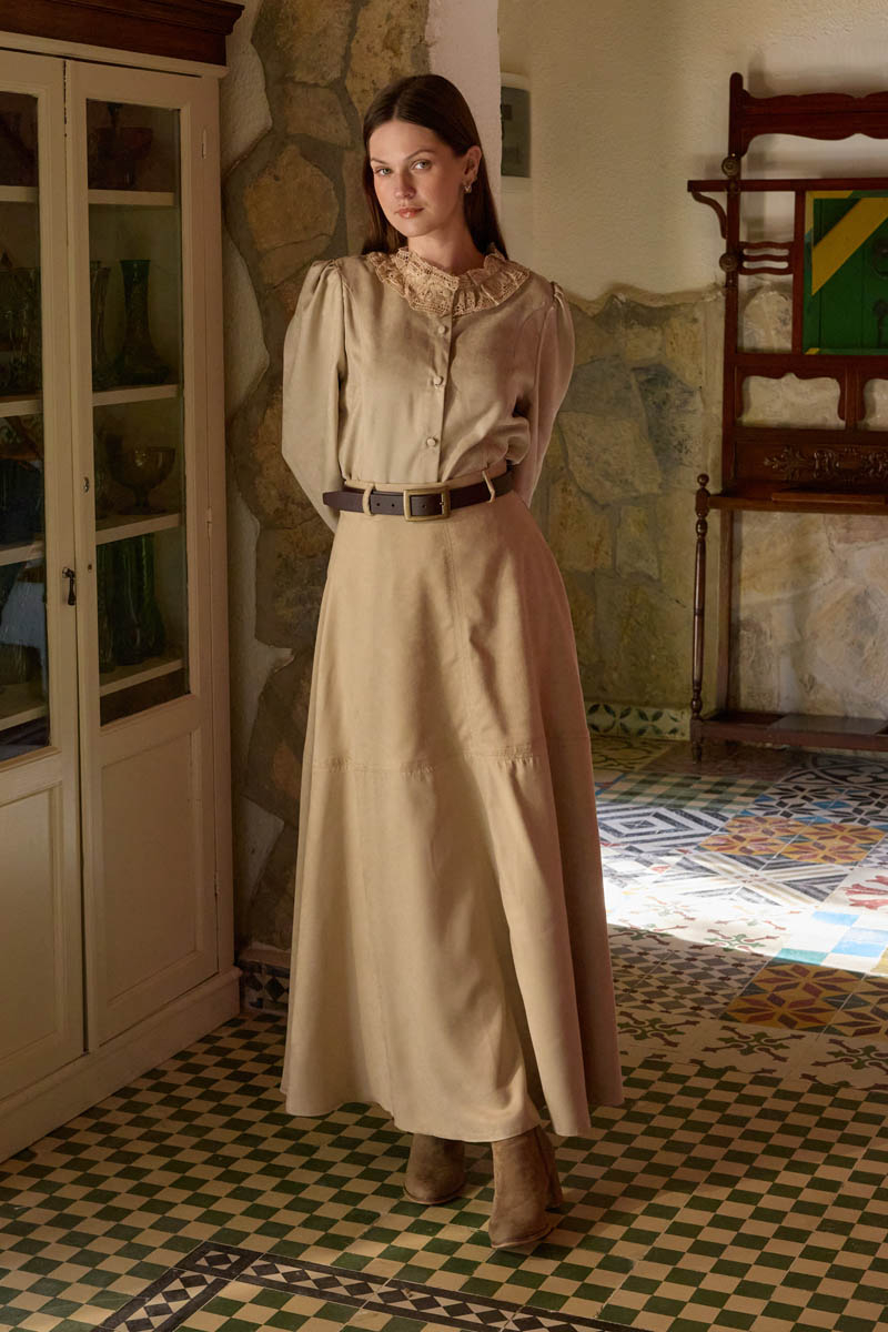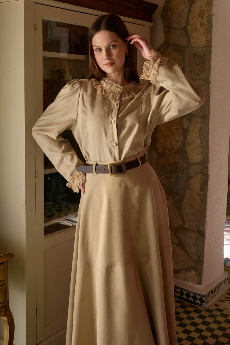 Lace Detail Short Suede Shirt Stone reinterprets a classic silhouette with a refined and romantic touch. Its soft-textured suede fabric offers comfortable wear, while the lace details on the collar and cuffs add a feminine and nostalgic character to the design. With its button-front closure and clean form, it can be easily styled with both skirts and trousers. A versatile piece that completes everyday looks while also adapting effortlessly to more polished outfits.