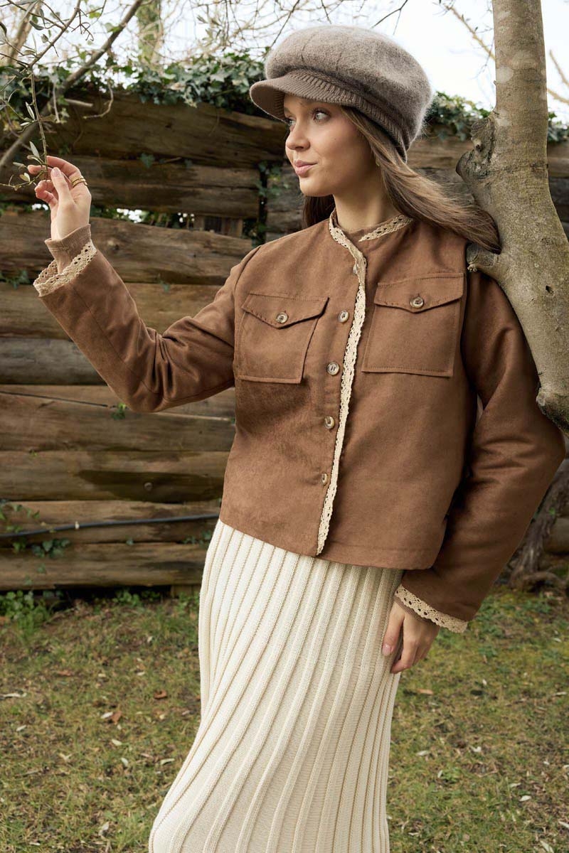 Lace Detail Suede Jacket Taba is a special design that blends vintage-inspired details with a modern line. Its soft suede texture offers a warm and natural look, while the lace details on the front panel and cuffs add an elegant character to the design. Thanks to its short-length silhouette, it creates balanced combinations with skirts, dresses, and high-waisted trousers. It offers a wide range of use, from everyday city style to romantic outfits.