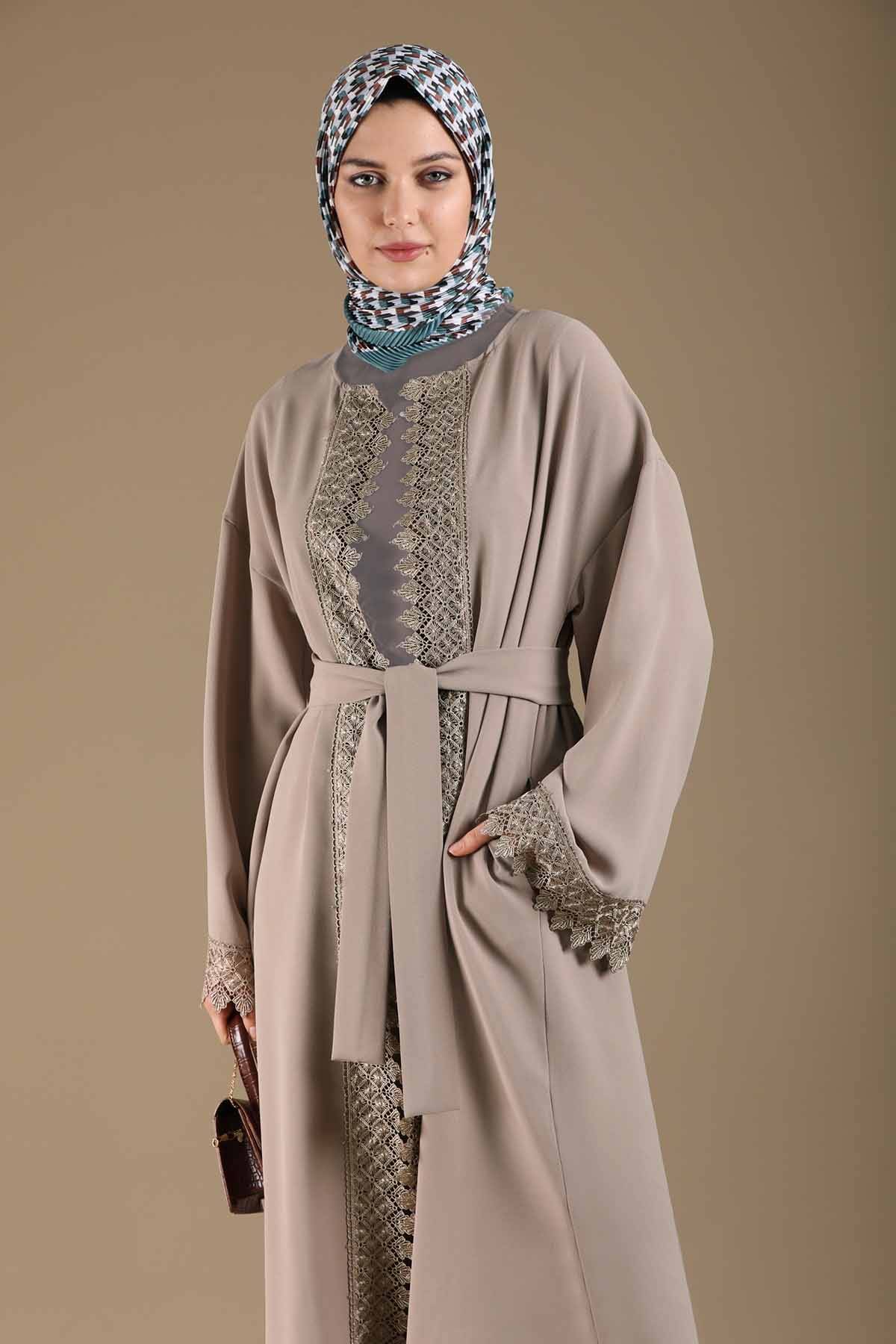 Lace Detailed Abaya Suit Mink. Lace Detail, There is lace detail on the cuff. Sold as a set of two.