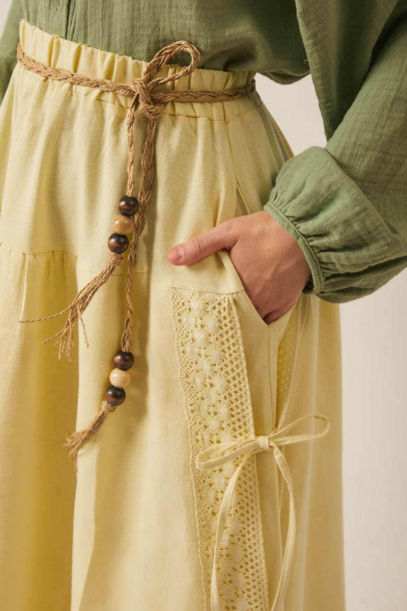 Embrace effortless elegance with this lace detailed linen skirt, crafted from a breathable natural linen blend. The layered structure and delicate lace accents bring a touch of modern bohemian charm. Ideal for elevating your everyday style with grace and comfort.