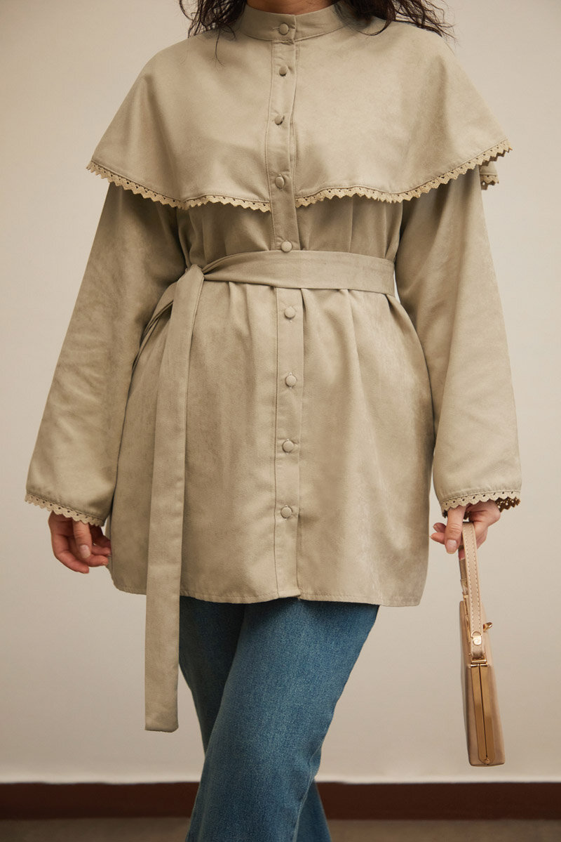 Lace Detailed Suede Shirt Stone blends romantic touches with a modern silhouette. Its soft suede texture offers a structured yet elegant look, while the lace details on the shoulders and chest add a feminine character to the design. With a button-front closure and straight cut, it provides comfortable wear and can be easily styled with skirts, trousers, or pinafores. A special wardrobe piece for those who want to elevate everyday style with refined details.